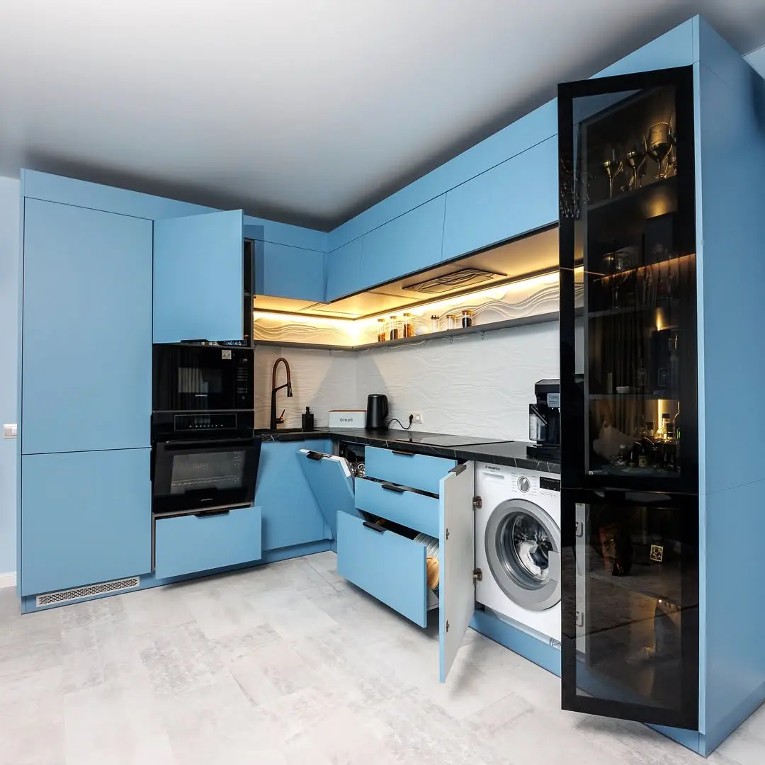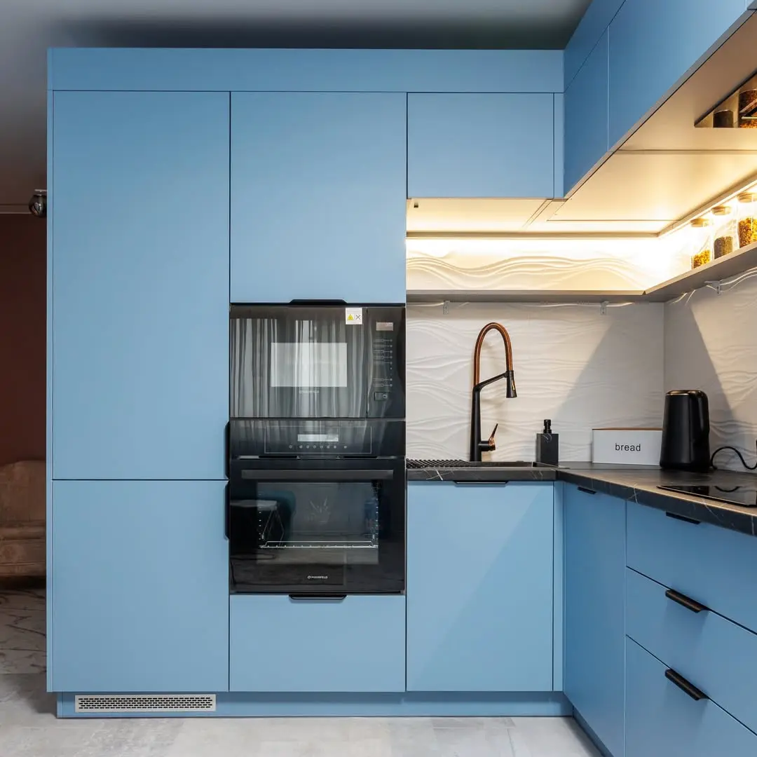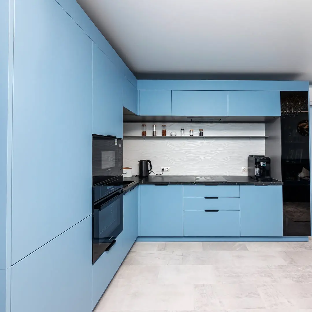 Голубые акриловые фасады с глянцевым эффектом визуально расширяют пространство, а контрастные чёрные элементы добавляют динамику и стиль. Функциональные системы хранения, встроенная техника и фурнитура Gtv делают кухню идеальной для активного ритма жизни.