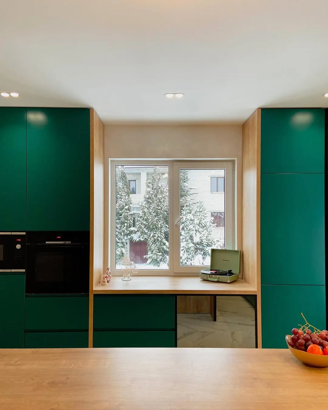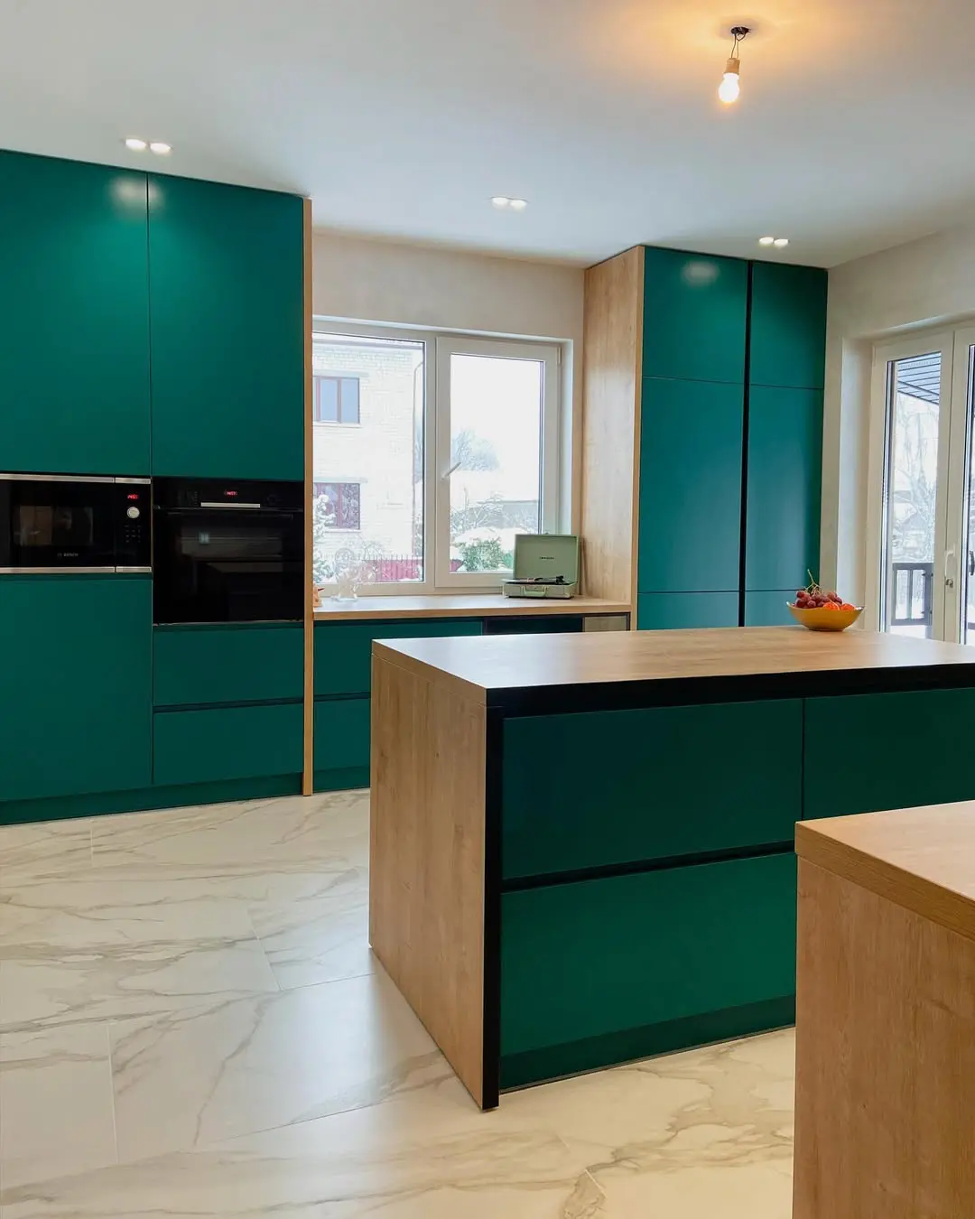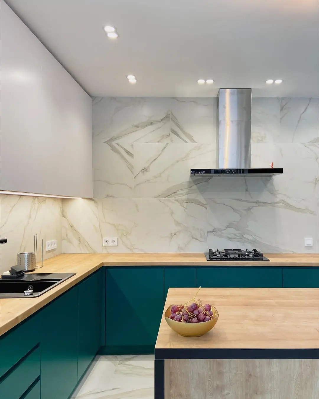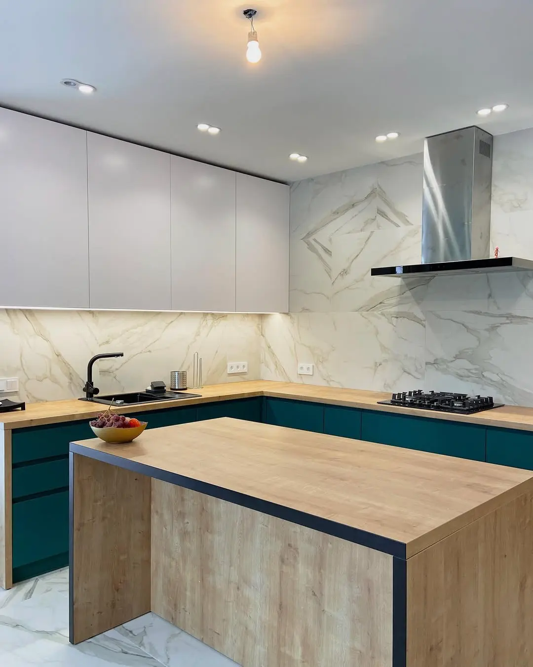 Кухня «Адамант» — смелое сочетание изумрудных фасадов, тёплого оттенка дерева и светлых мраморных стен. Угловая планировка с функциональным островом создаёт простор и комфорт, а минималистичный дизайн подчёркивает современный стиль интерьера. Матовые фасады и качественная фурнитура Blum обеспечивают долговечность и удобство в использовании.