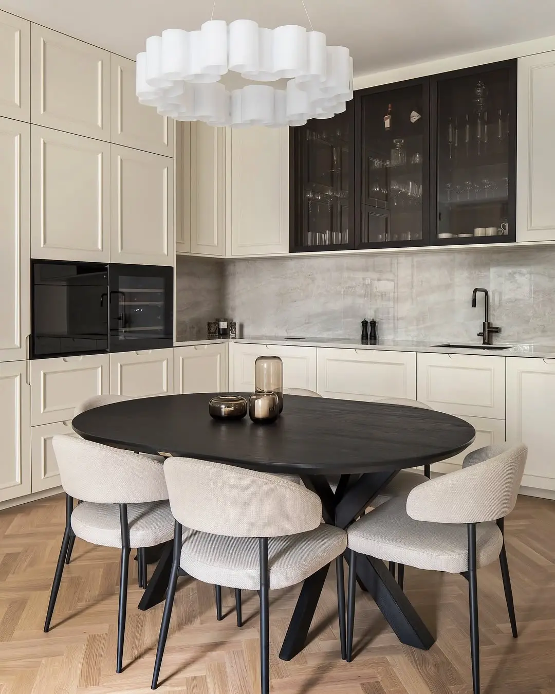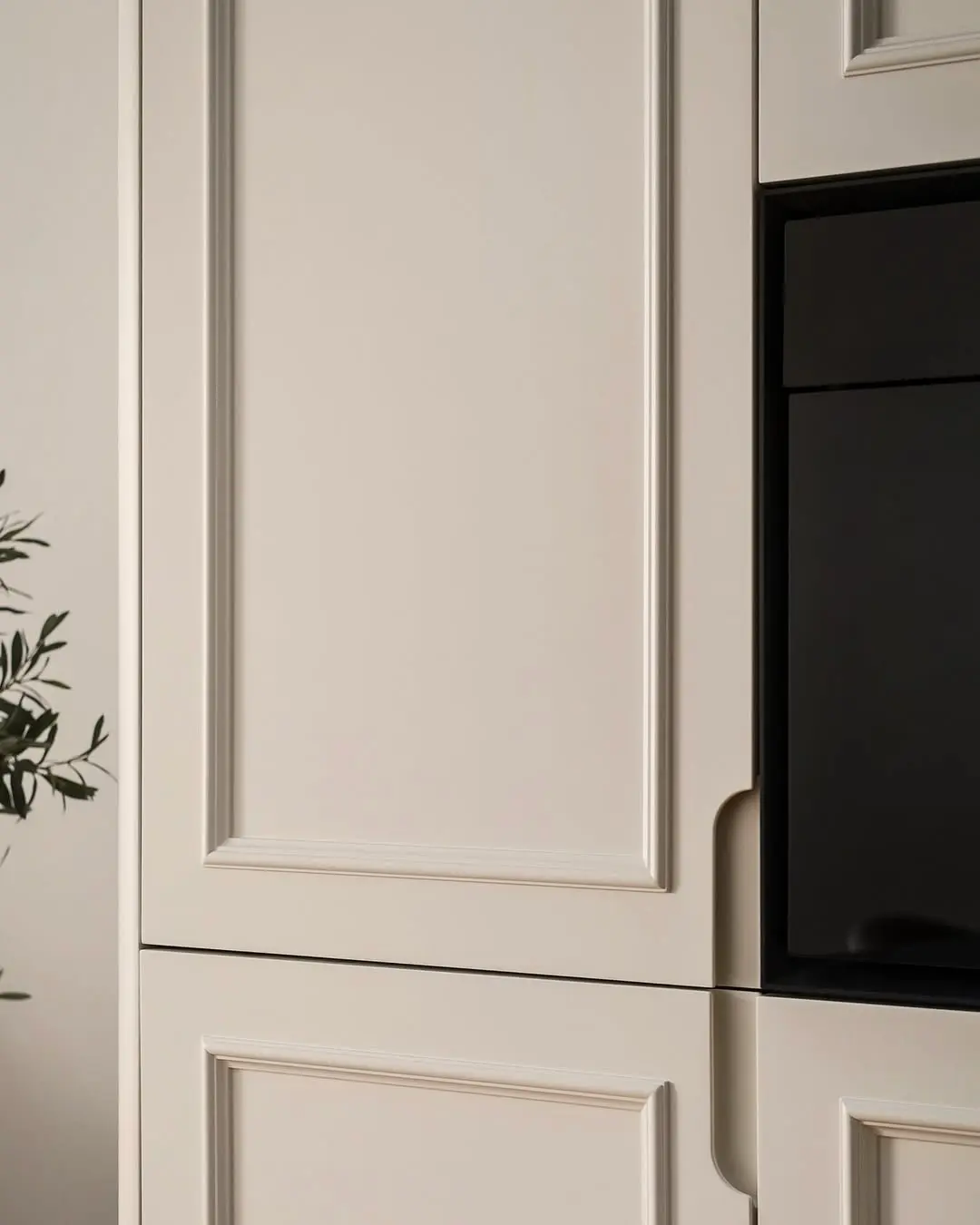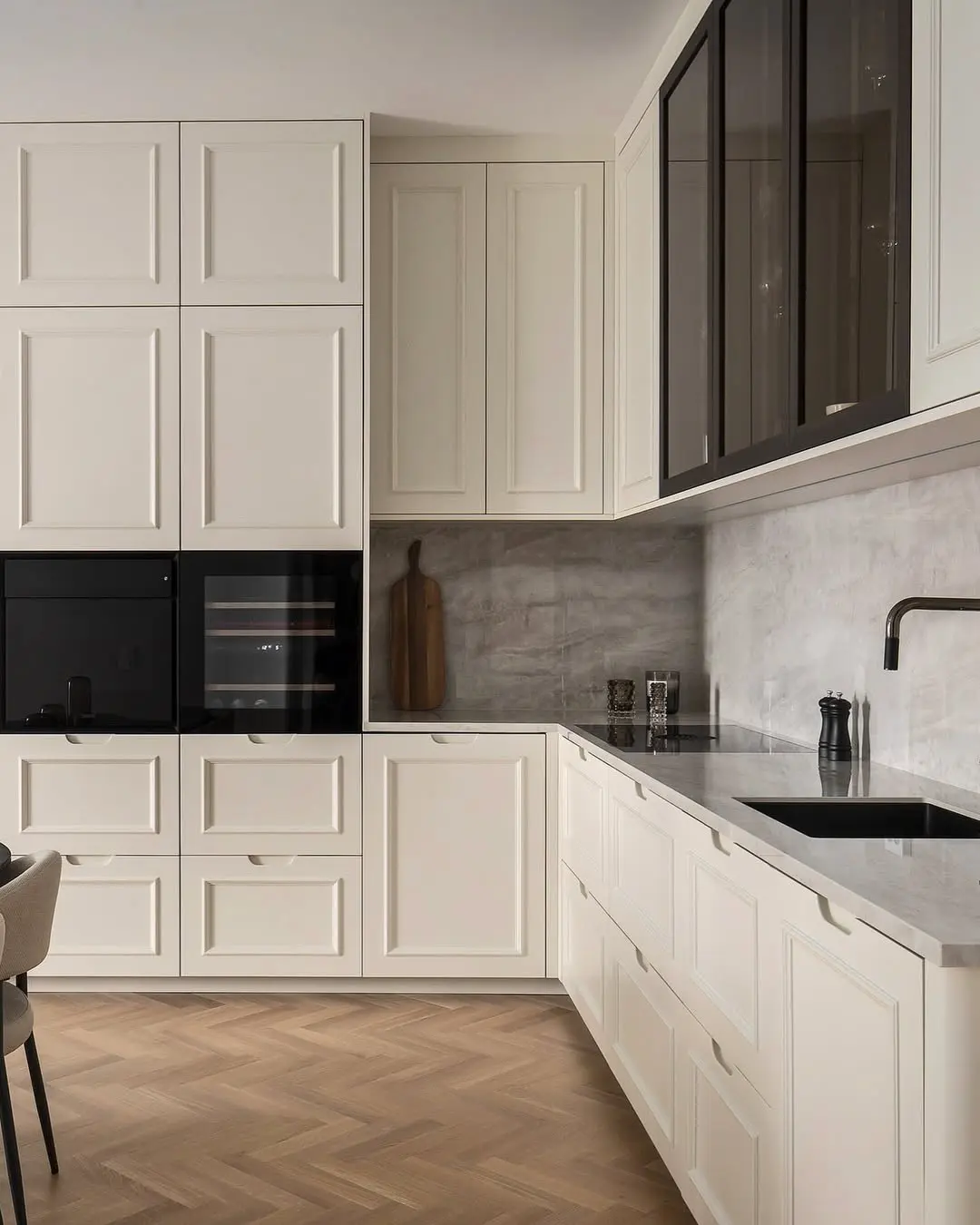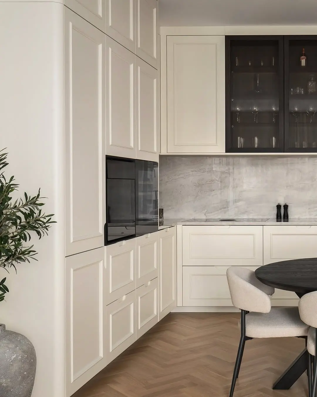 Кухня Адель выполнена в молочном цвете, который придаёт интерьеру лёгкость и утончённость. Классические фасады с фрезеровкой создают атмосферу элегантности, а витрины со стеклом добавляют лёгкости и визуального простора. Кварцевая столешница и мраморный фартук подчёркивают гармонию современного и классического стиля.