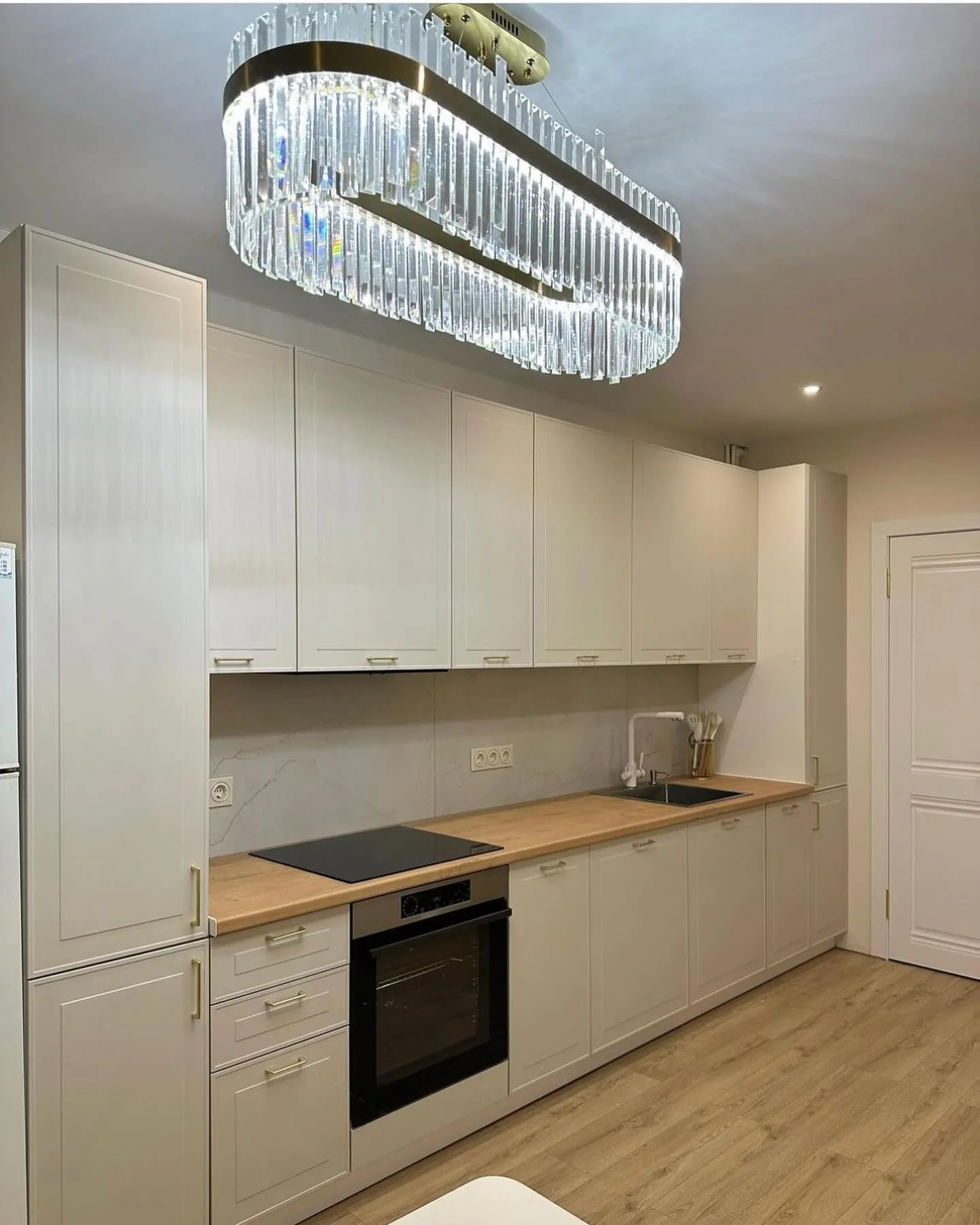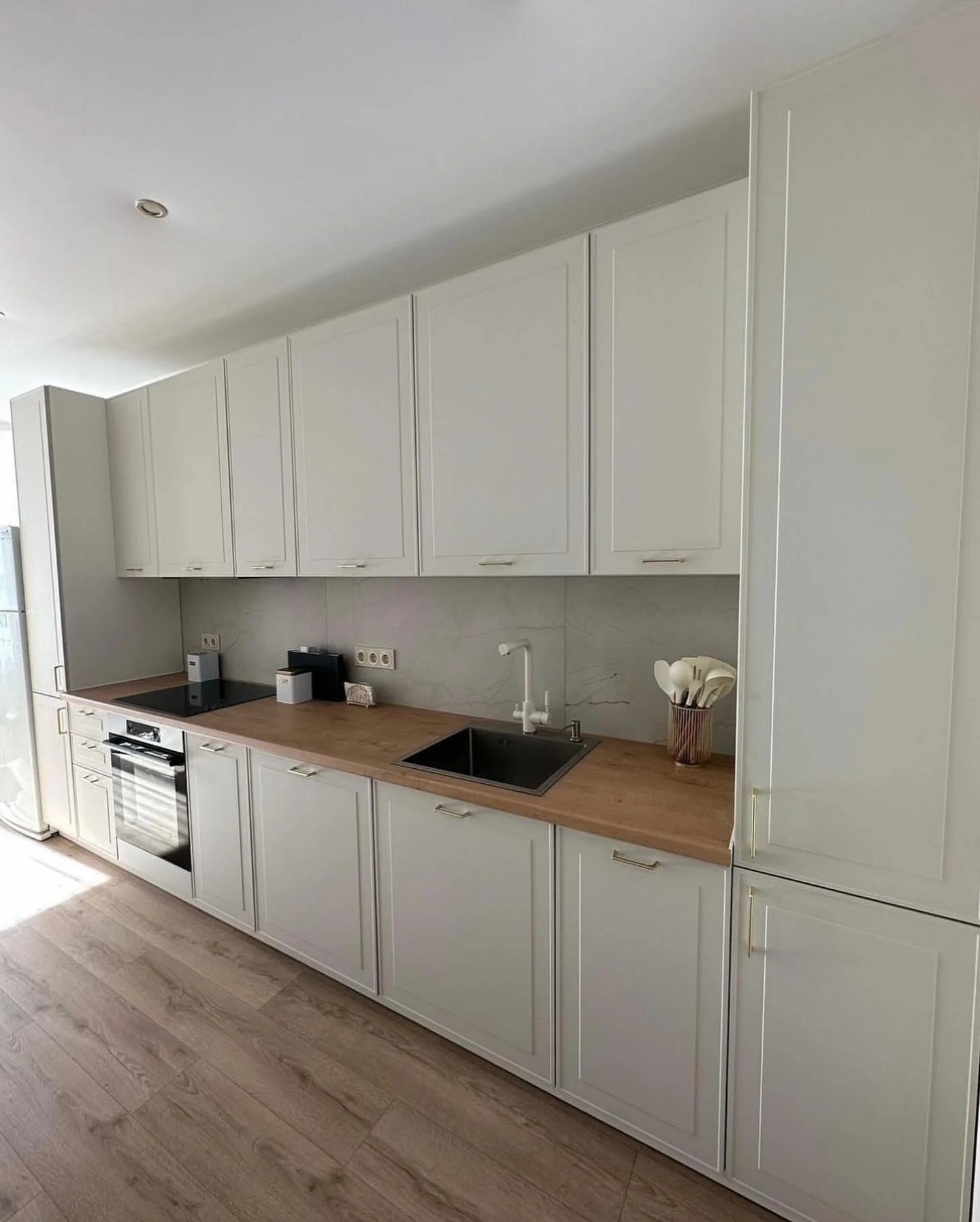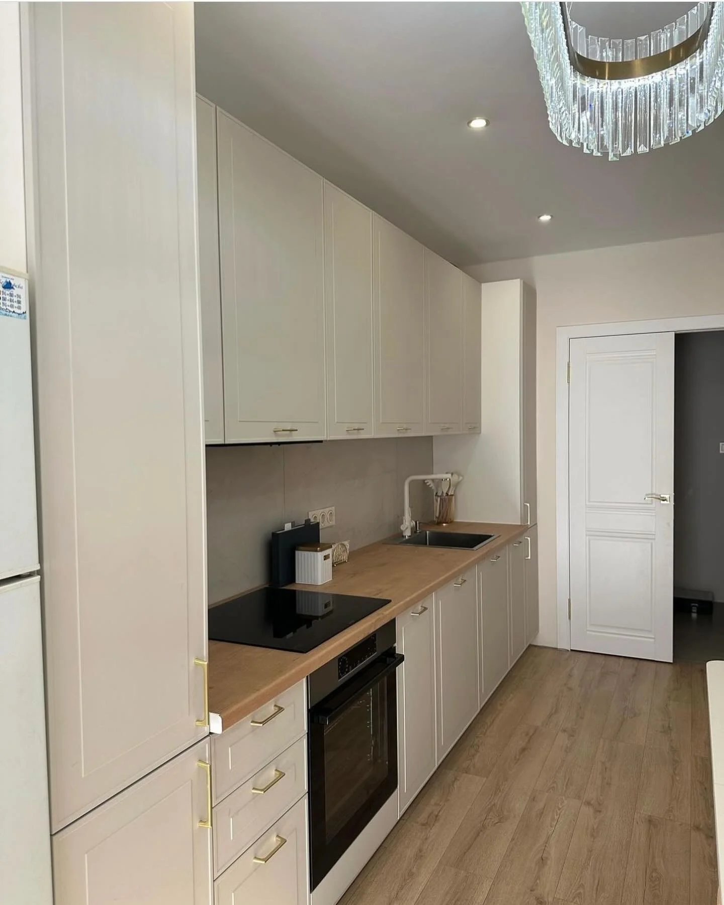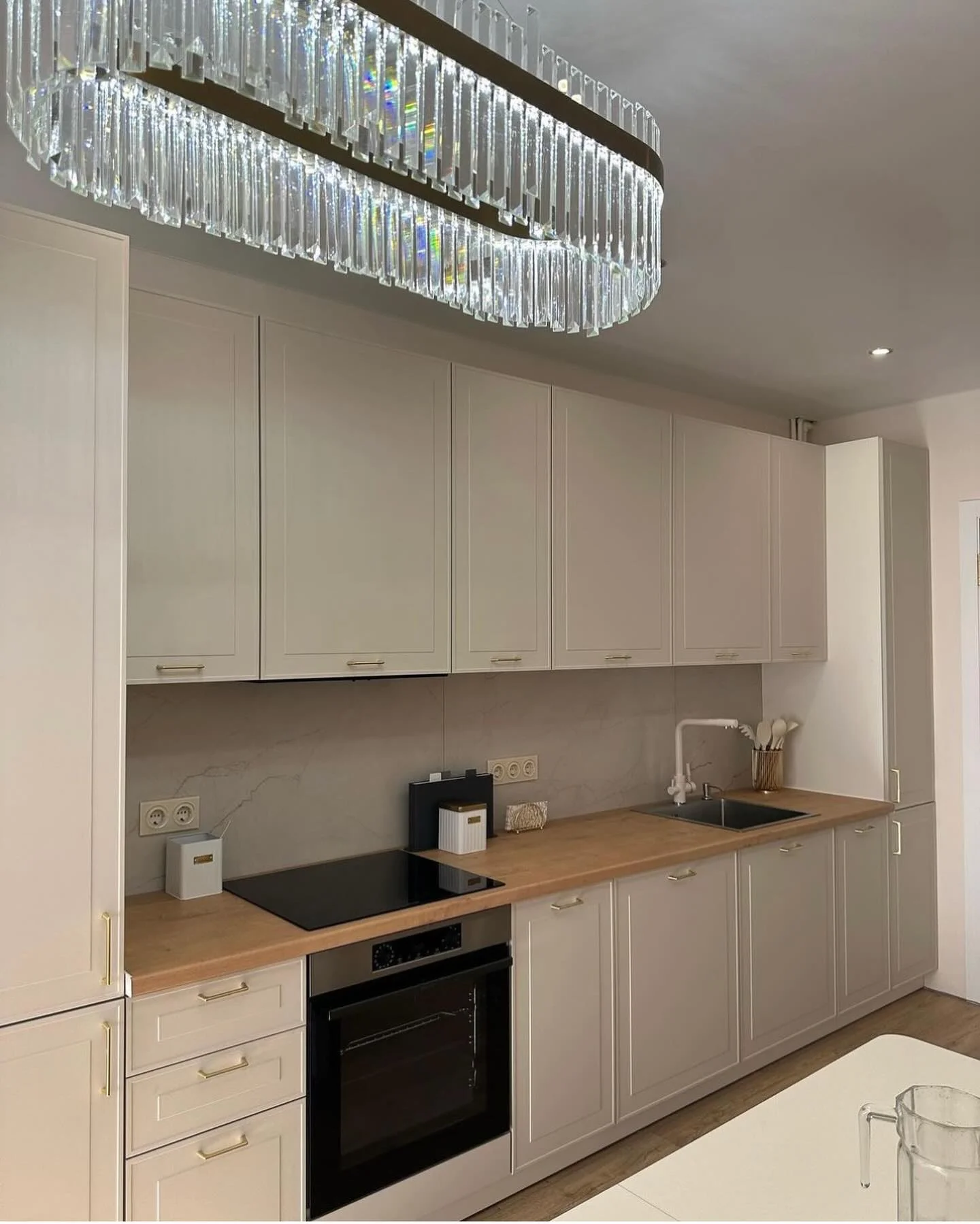 Кухня Аделина — светлая и уютная модель в неоклассическом стиле. Молочно-бежевые фасады с матовым покрытием создают мягкое и тёплое настроение, а столешница под натуральное дерево добавляет природной гармонии. Элегантная фрезеровка и качественная фурнитура Hettich подчеркивают сочетание стиля и функциональности.
