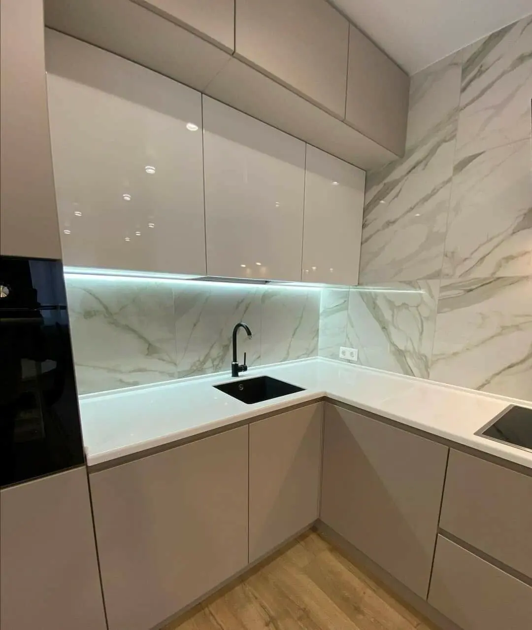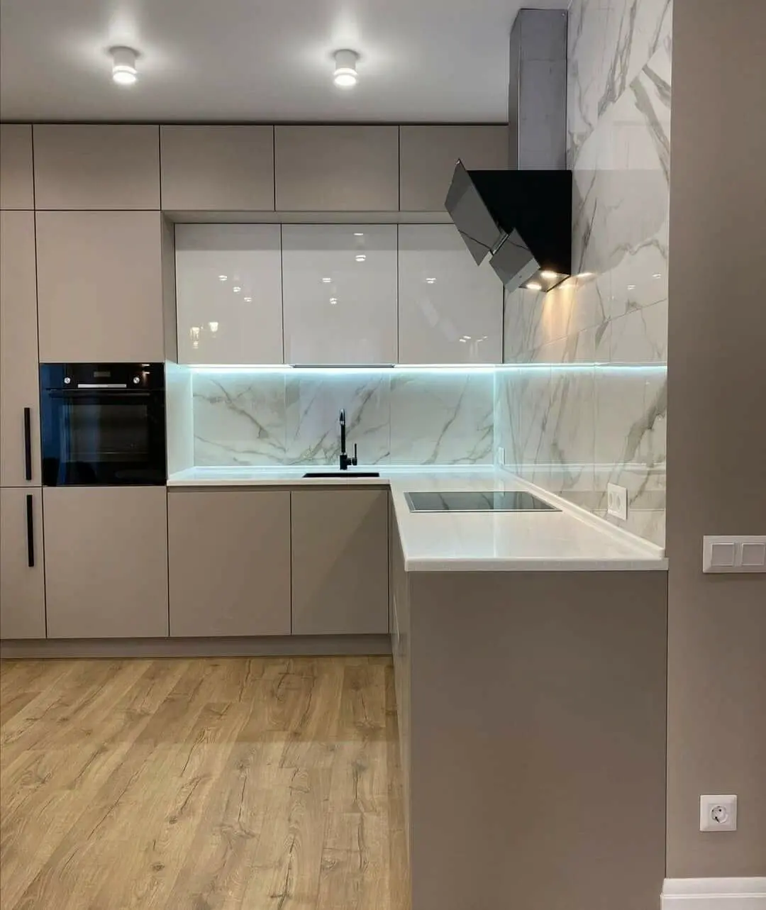 Современная кухня в бежево-белой гамме с удобной П-образной планировкой. Фасады из МДФ в плёнке ПВХ создают аккуратный и элегантный вид, а сочетание бежевого и белого добавляет мягкости и уюта интерьеру. Столешница из искусственного камня и фартук под мрамор делают кухню практичной и износостойкой. Встроенная техника и качественная фурнитура Boyard обеспечивают функциональность и комфорт в использовании.