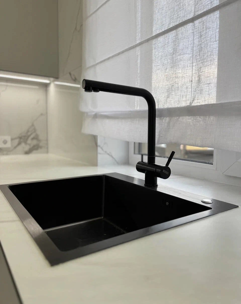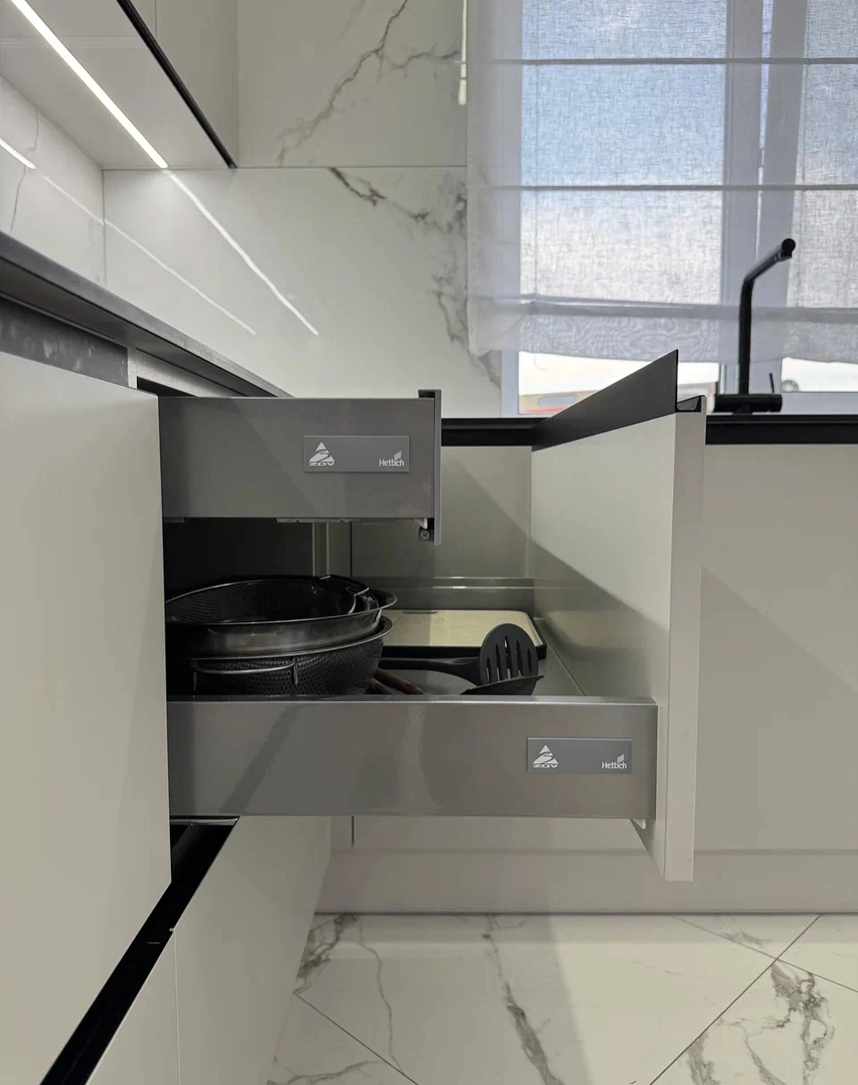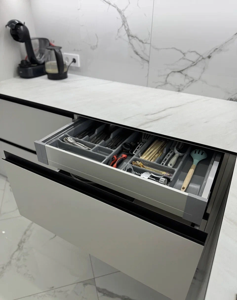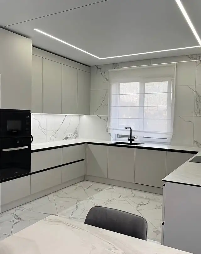 Элегантная П-образная кухня в современном стиле. Светло-серые фасады в матовой эмали идеально гармонируют с белыми мраморными поверхностями столешницы и фартука. Чистые линии и скрытые ручки подчеркивают минимализм, а встроенная техника и чёрные акценты (мойка и духовой шкаф) добавляют контраста и функциональности. Благодаря П-образной форме кухня максимально использует пространство, создавая удобную рабочую зону.