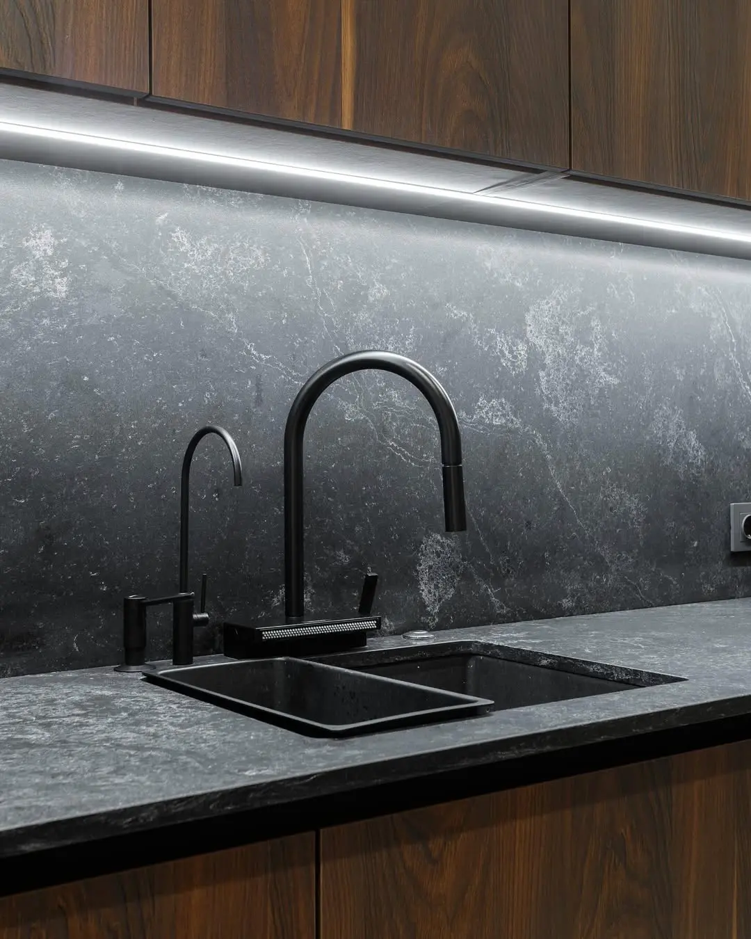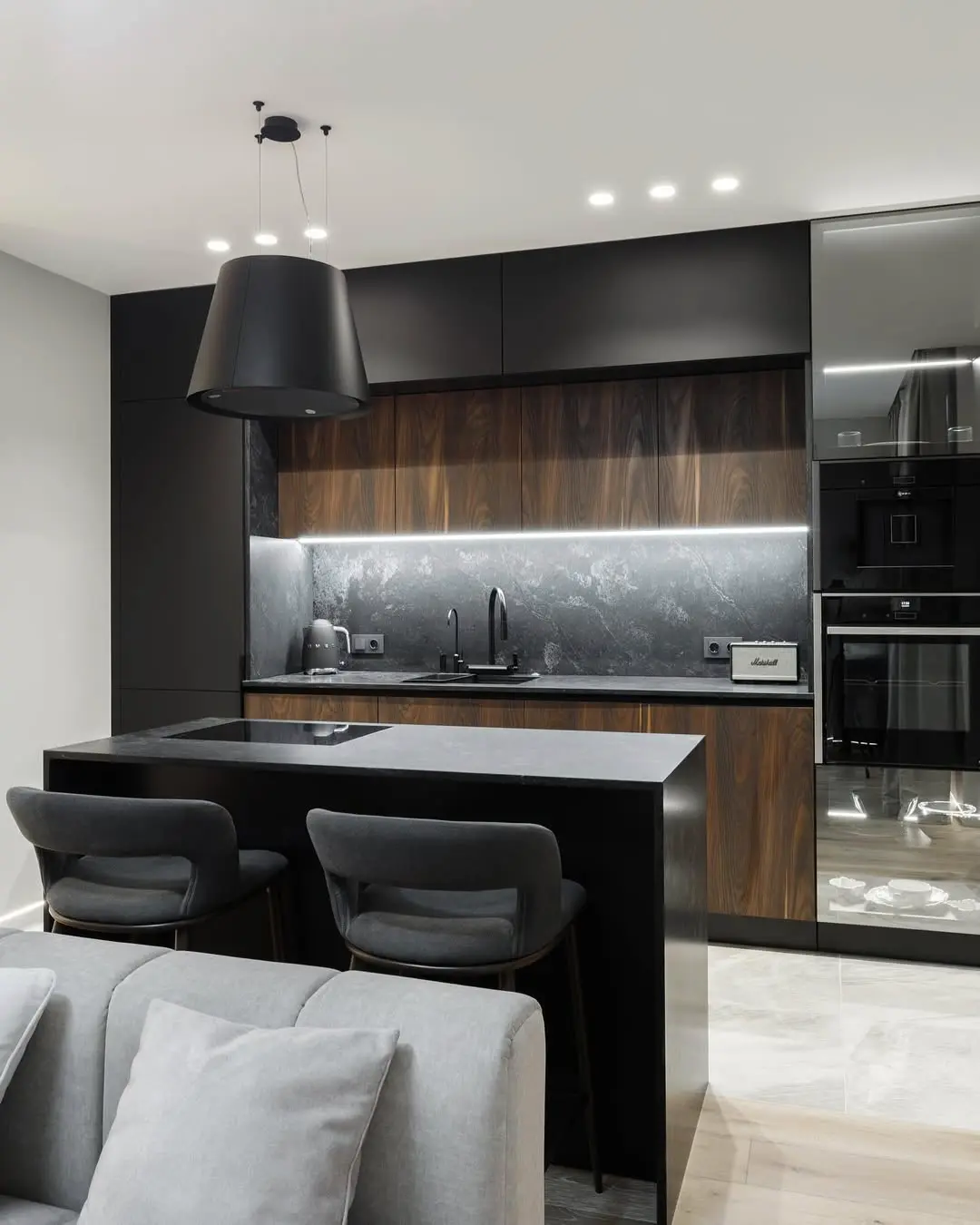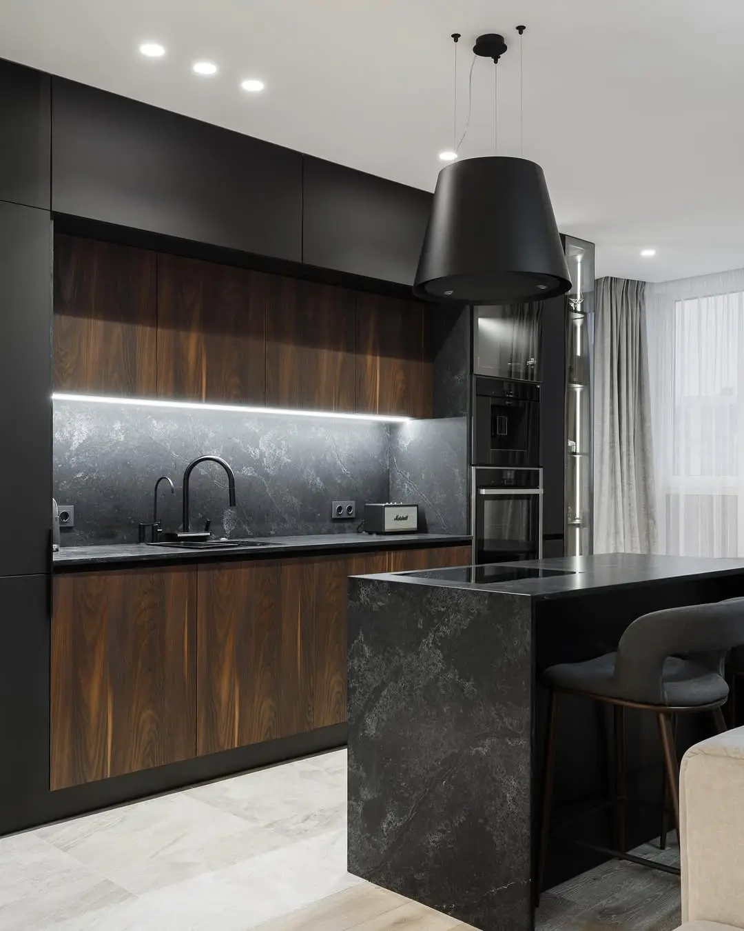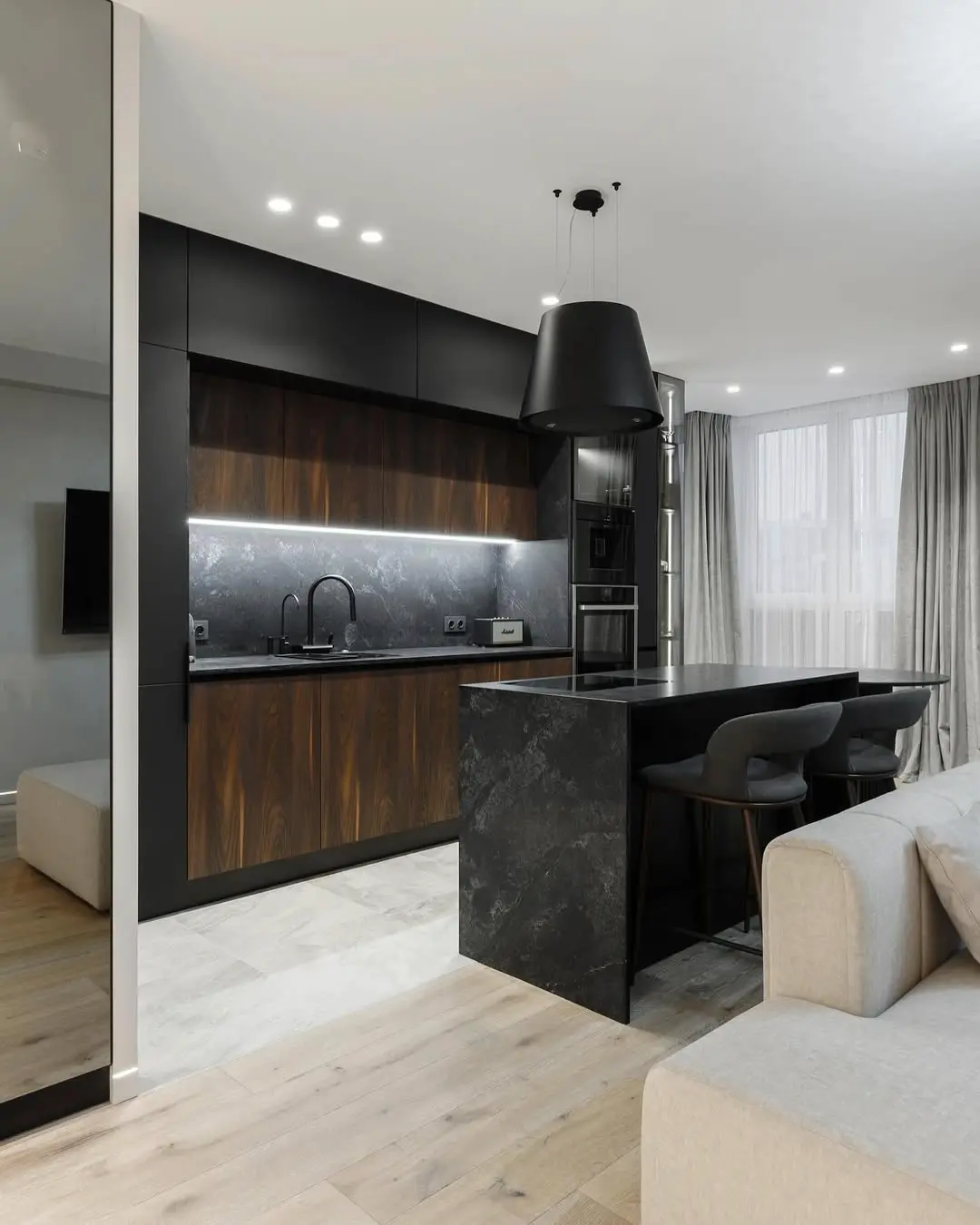 Роскошная прямая кухня в стиле современный лофт сочетает глубокий чёрный цвет фасадов с натуральными вставками под орех. Столешница и остров из керамогранита добавляют солидности и практичности. Встроенная техника, скрытые ручки и фурнитура Boyard обеспечивают максимальный комфорт в использовании. Подсветка рабочей зоны создаёт выразительный акцент и подчеркивает фактуру материалов. Кухня выглядит элегантно, строго и в то же время уютно, идеально подойдёт для современных интерьеров.