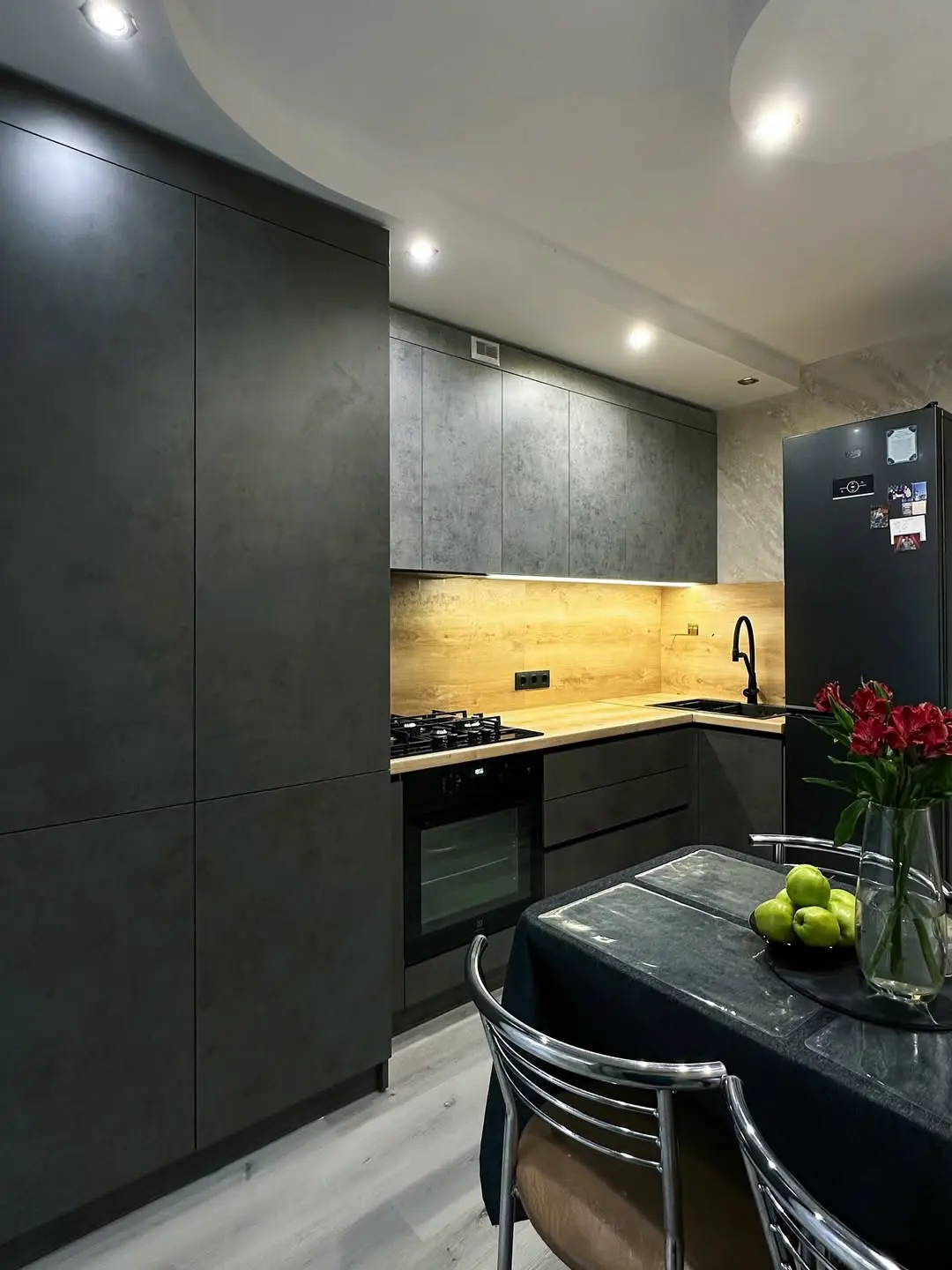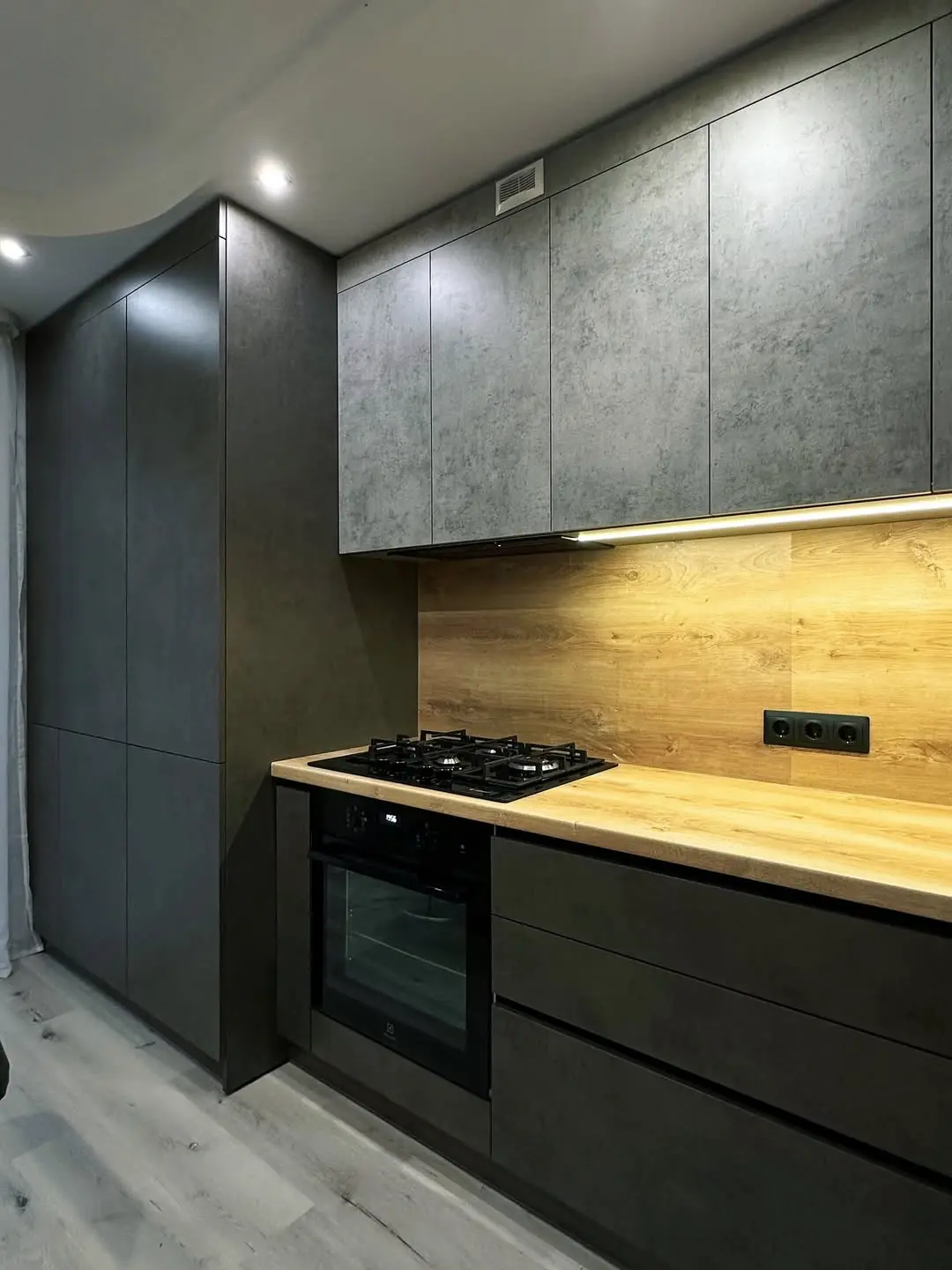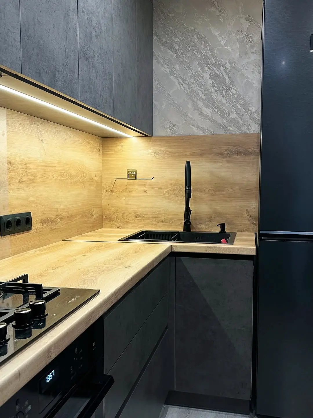 Угловая кухня в стиле лофт с фасадами в оттенке серого бетона и деревянной столешницей. Контраст материалов создаёт современную и уютную атмосферу, а подсветка подчёркивает текстуру и глубину поверхности. Практичная планировка и встроенная техника делают кухню функциональной и стильной.