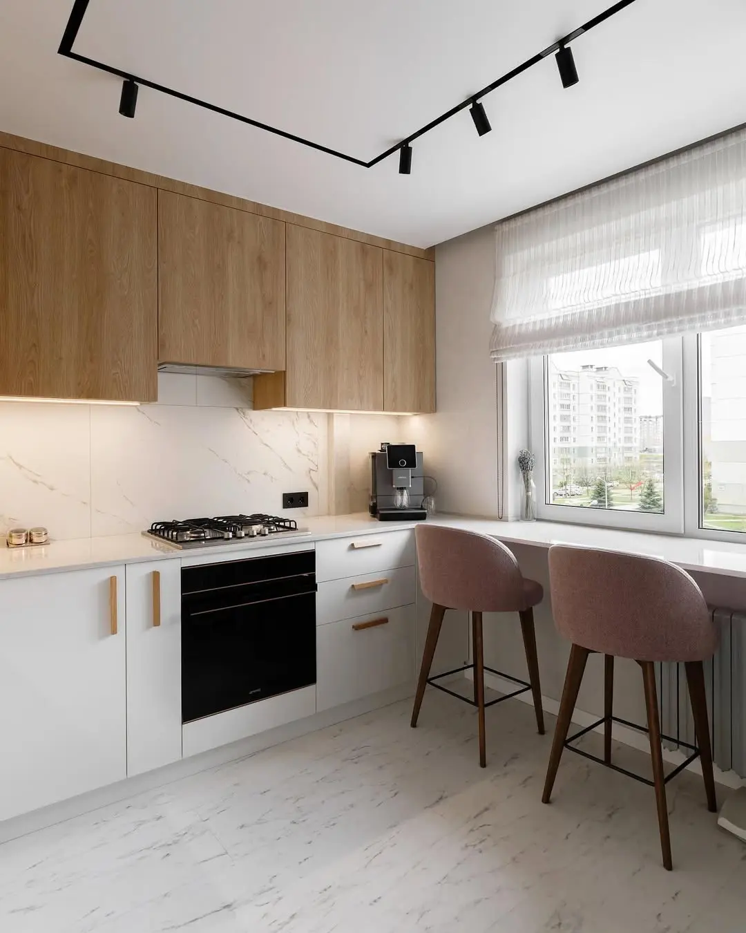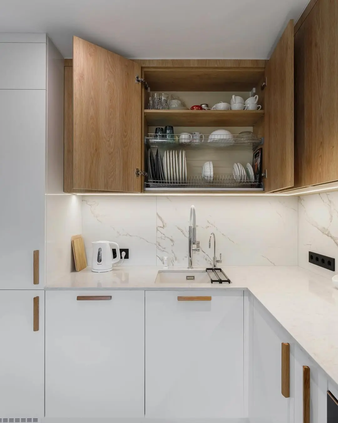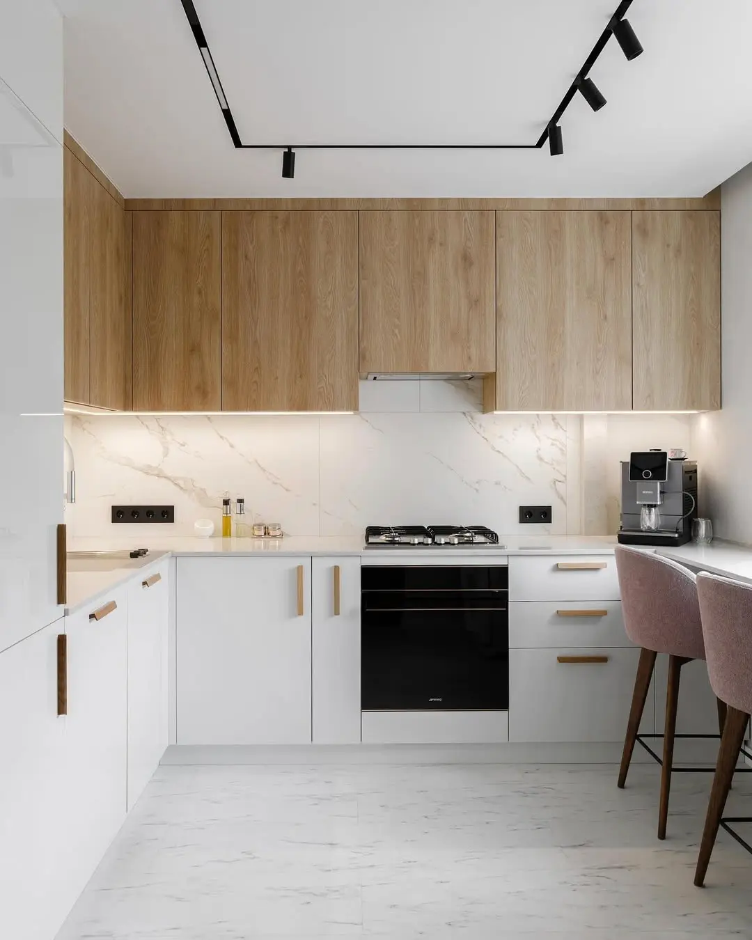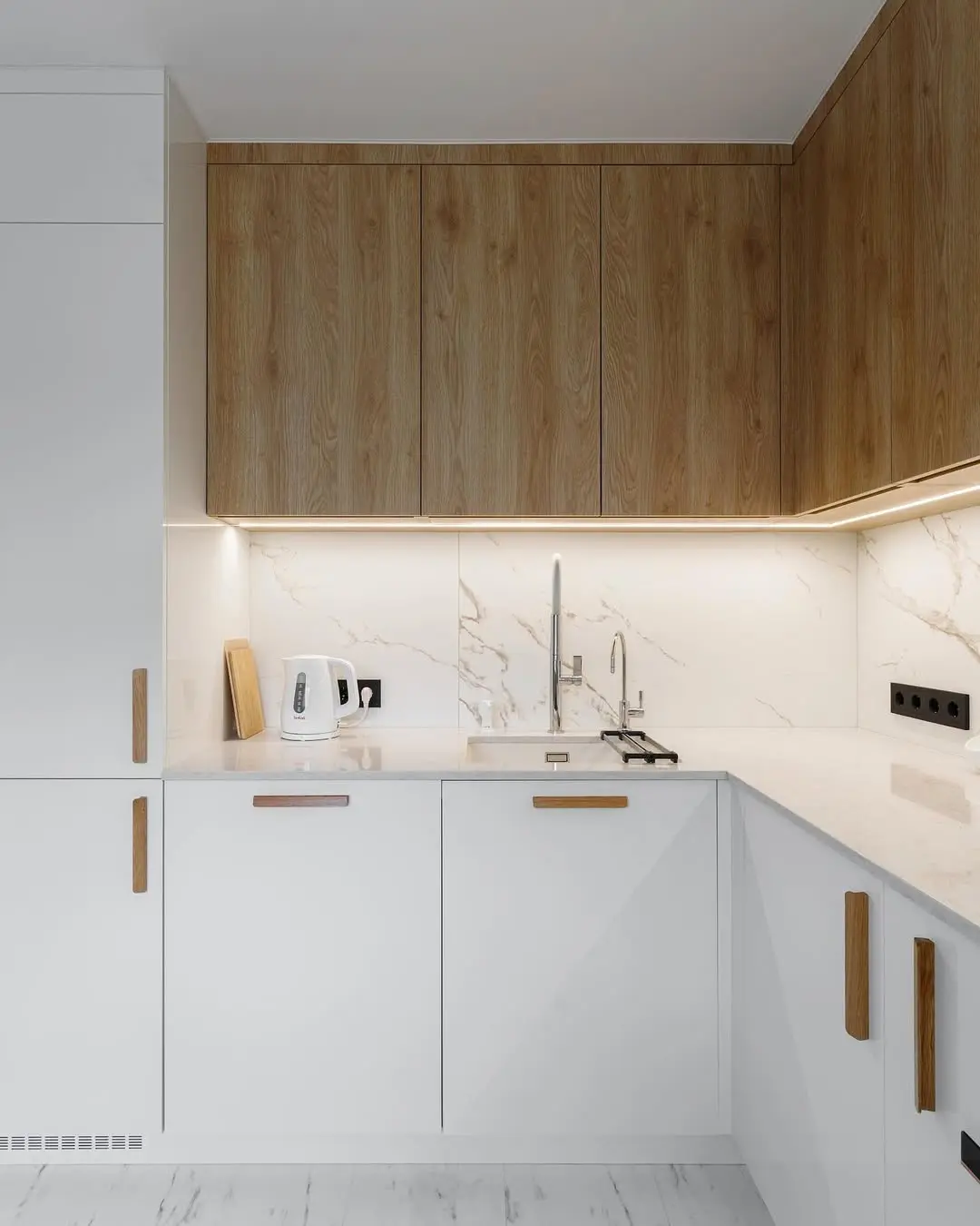 Эта угловая кухня в светлом скандинавском стиле сочетает в себе белые фасады и верхние шкафы под натуральный дуб. Контрастные ручки и фурнитура Hettich делают использование кухни максимально удобным и долговечным. Столешница и фартук из кварцевого агломерата с имитацией мрамора придают интерьеру лёгкость и изысканность. Кухня выглядит просторной, современной и тёплой, сохраняя гармонию практичности и эстетики.