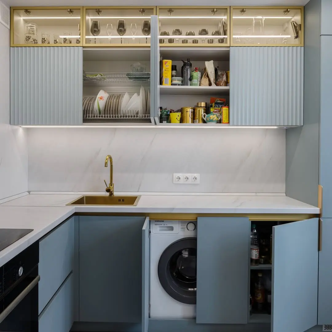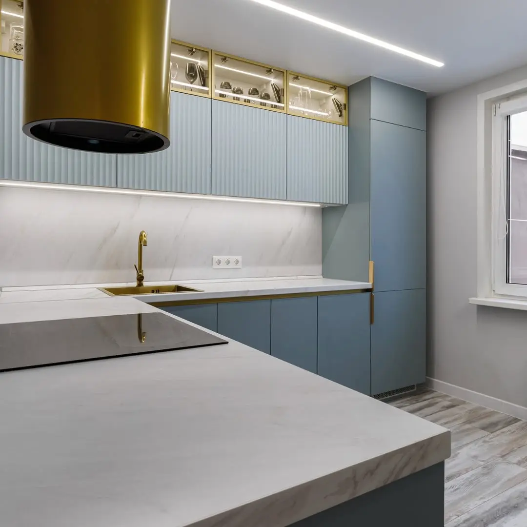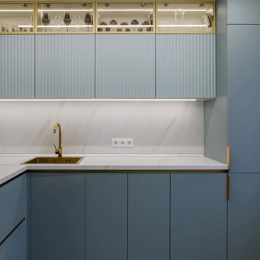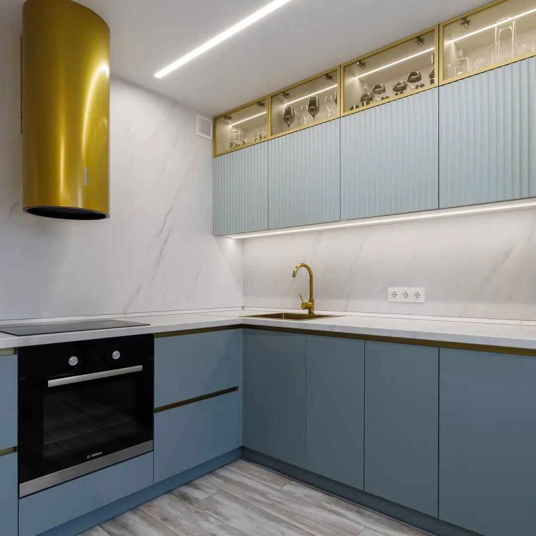 Современная угловая кухня в изысканном сочетании голубого и золотого. Фасады с вертикальной фрезеровкой создают лёгкую фактуру, а золотые акценты в виде вытяжки, ручек и смесителя придают кухне премиальный вид. Белая столешница из искусственного камня и мраморный фартук добавляют лёгкости и гармонии. Кухня укомплектована фурнитурой Blum для долговечности и комфорта.
