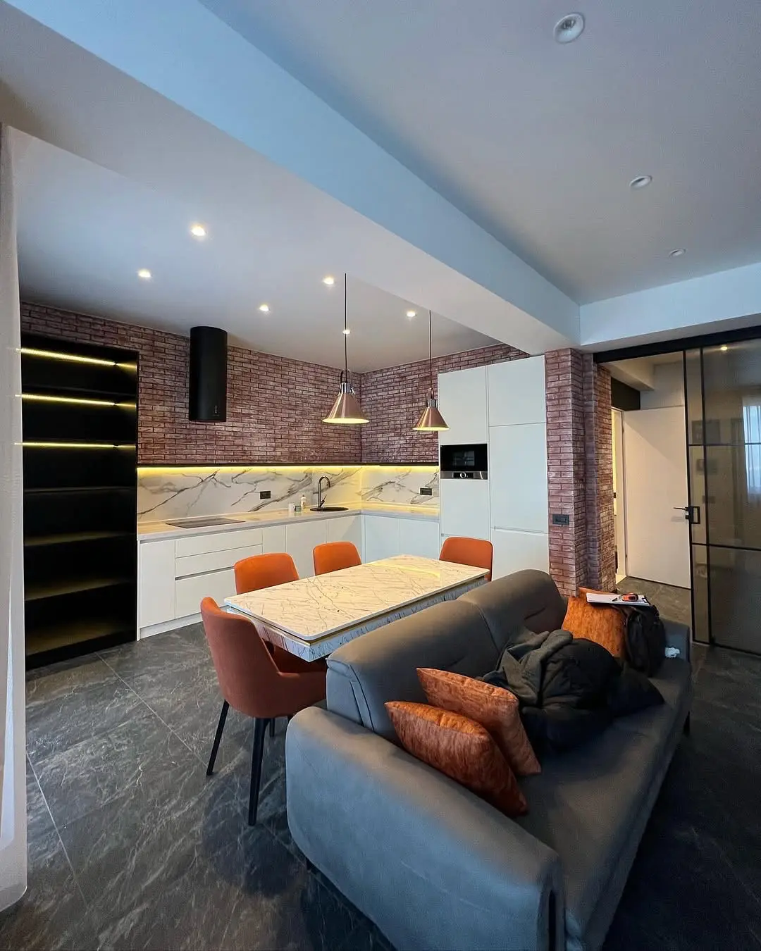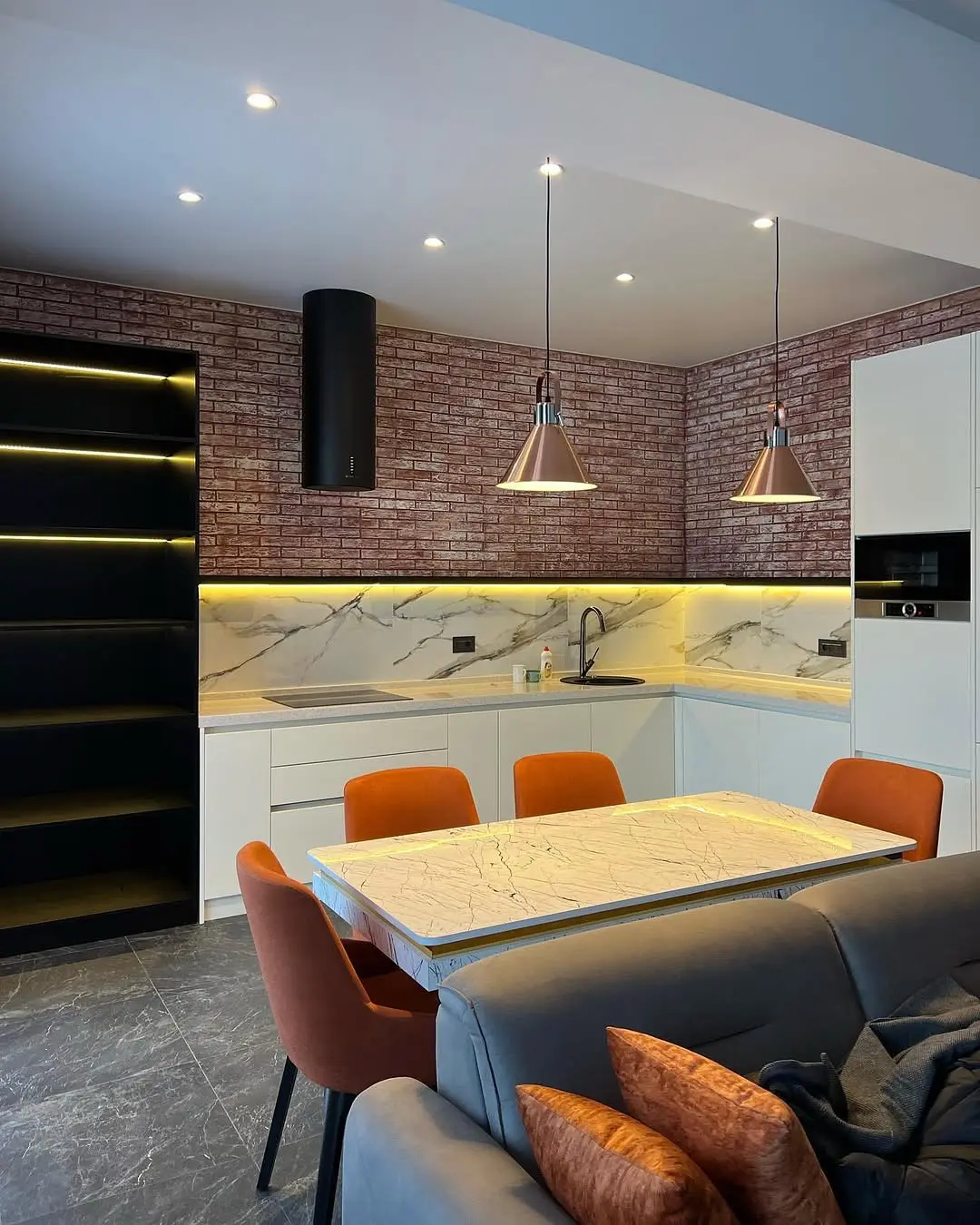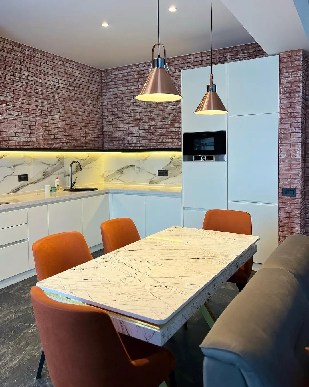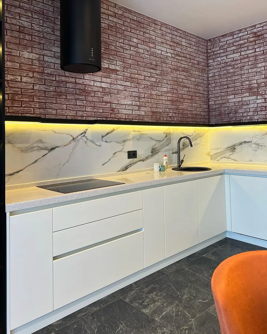 Кухня Брик — эффектное сочетание современного стиля и индустриальной эстетики. Белые матовые фасады создают чистый и светлый фон, а кирпичная стена в стиле лофт добавляет интерьеру брутальности и характера. Мраморная столешница и фартук придают кухне премиальный вид и подчёркивают утончённость деталей. Угловая планировка обеспечивает удобство работы и функциональность, фурнитура Boyard завершают гармоничный образ.