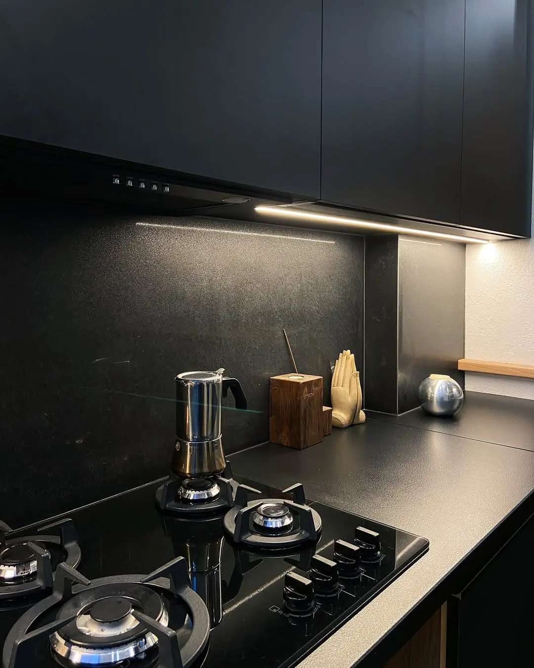 Угловая кухня в стиле лофт с матовыми чёрными фасадами и деревянной барной столешницей. Контраст текстур бетона, дерева и металла создаёт атмосферу урбанистического уюта. Компактная планировка с удобной барной зоной делает пространство функциональным и выразительным.
