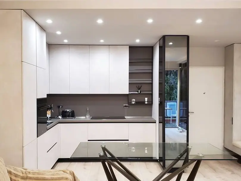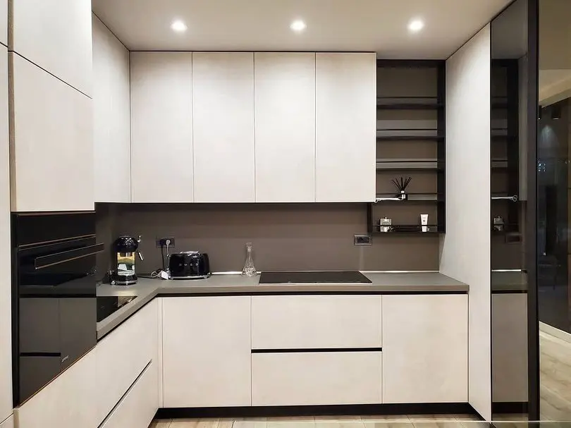 Эта угловая кухня выполнена в современном стиле и сочетает фасады из AGT и стеклянные элементы. Белый цвет фасадов визуально расширяет пространство, а чёрные вставки и столешница создают эффектный контраст. Кухня оборудована фурнитурой Firmax, что гарантирует удобство и долговечность эксплуатации. Искусственный камень в качестве столешницы добавляет прочность и изысканность.
