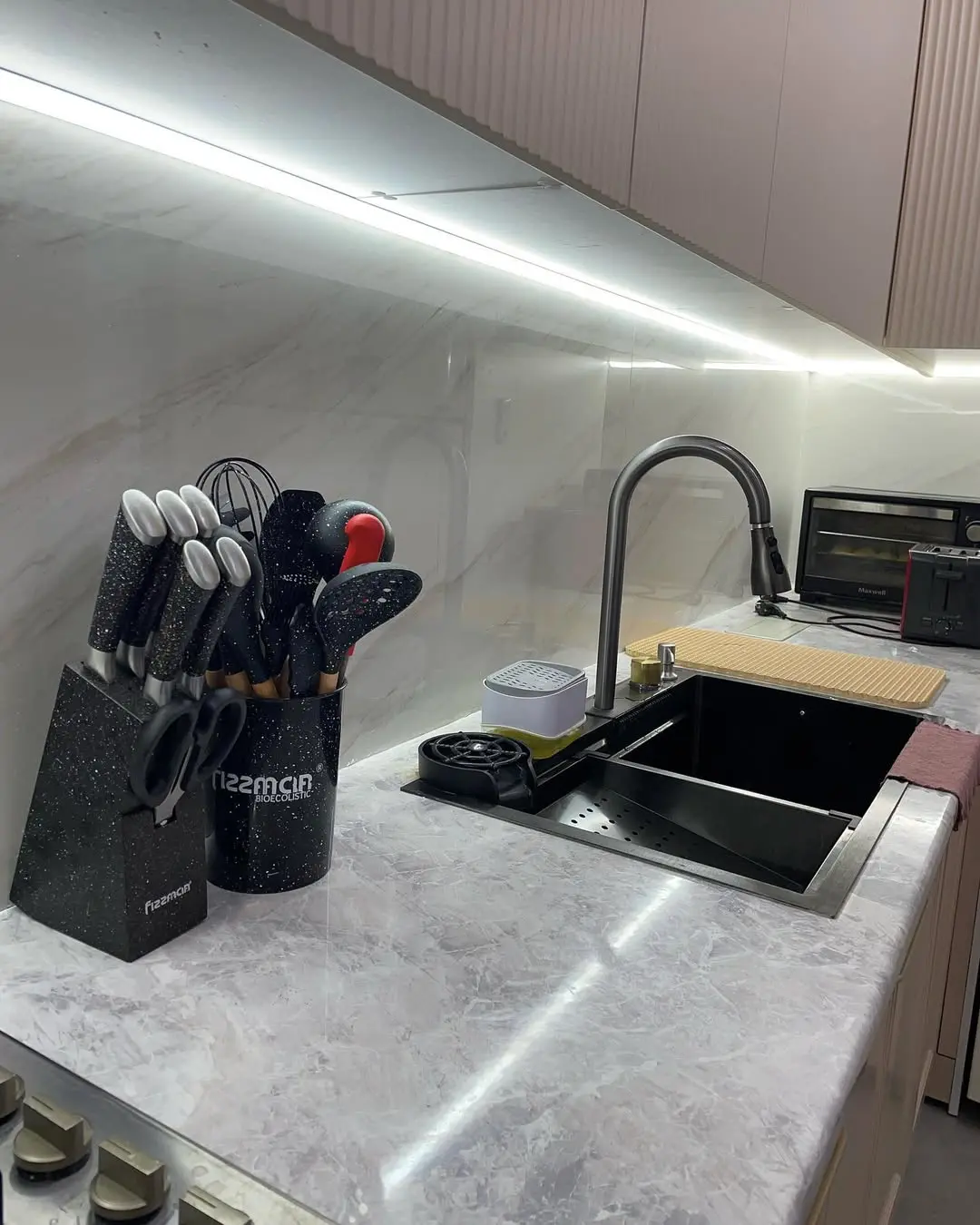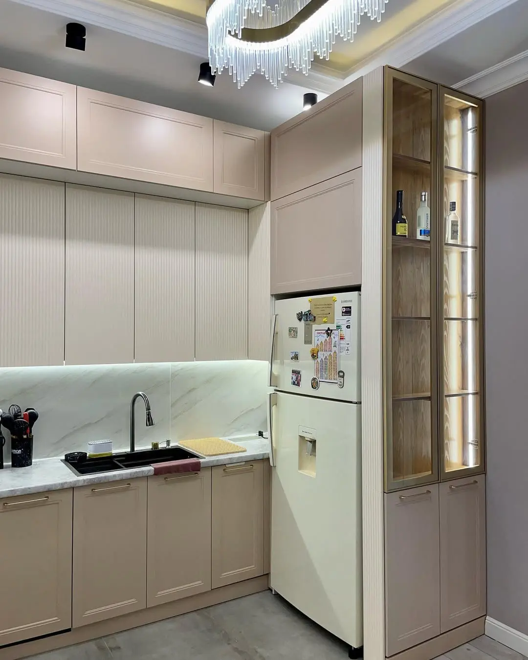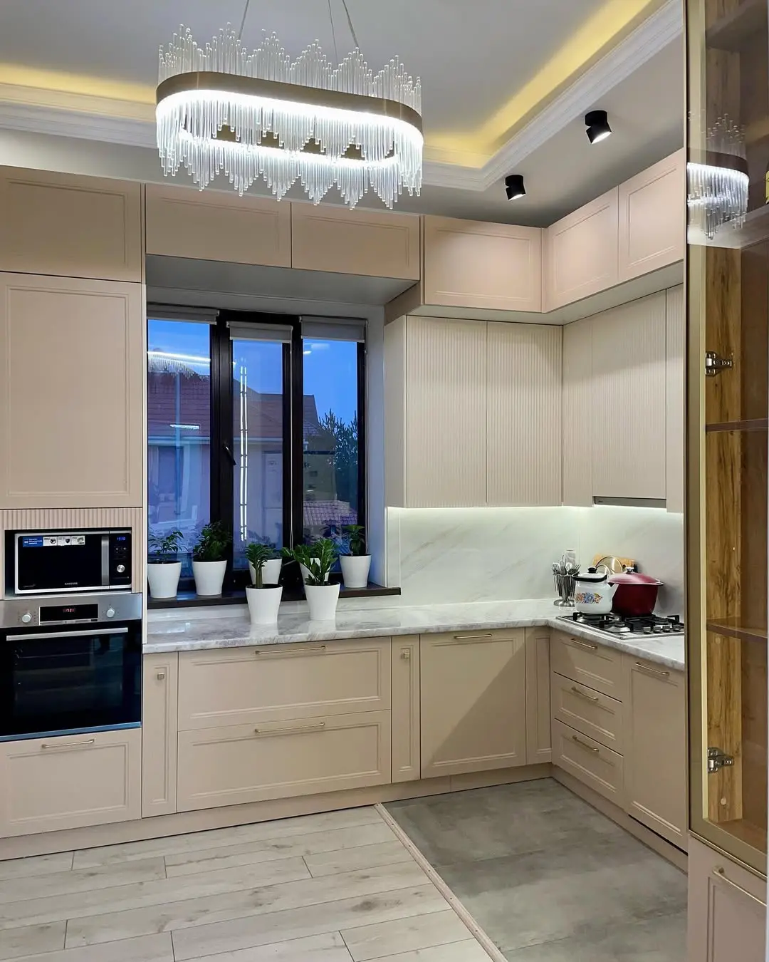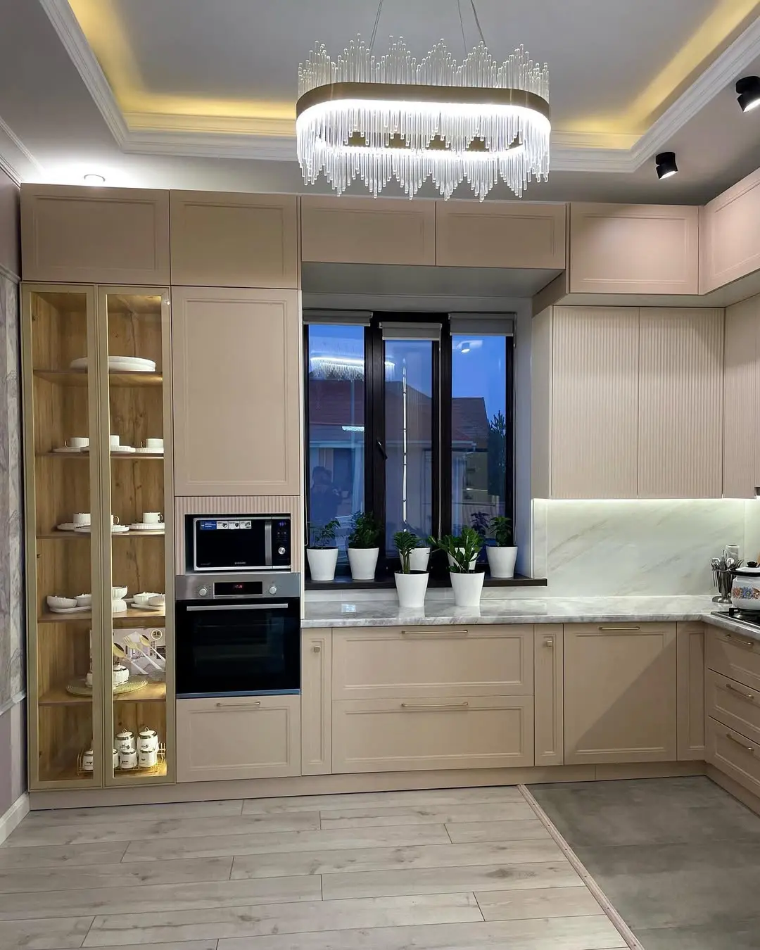 Кухня Элиза — воплощение уюта и элегантности в неоклассическом стиле. Нежные бежевые фасады с фрезеровкой создают атмосферу спокойствия и гармонии, а мраморная столешница и фартук добавляют интерьеру благородства. Продуманная угловая планировка делает кухню удобной для приготовления и хранения, а встроенная техника аккуратно интегрируется в общий дизайн. Мягкое освещение и изысканная фурнитура Boyard подчёркивают премиальный характер кухни и обеспечивают комфорт в повседневном использовании.
