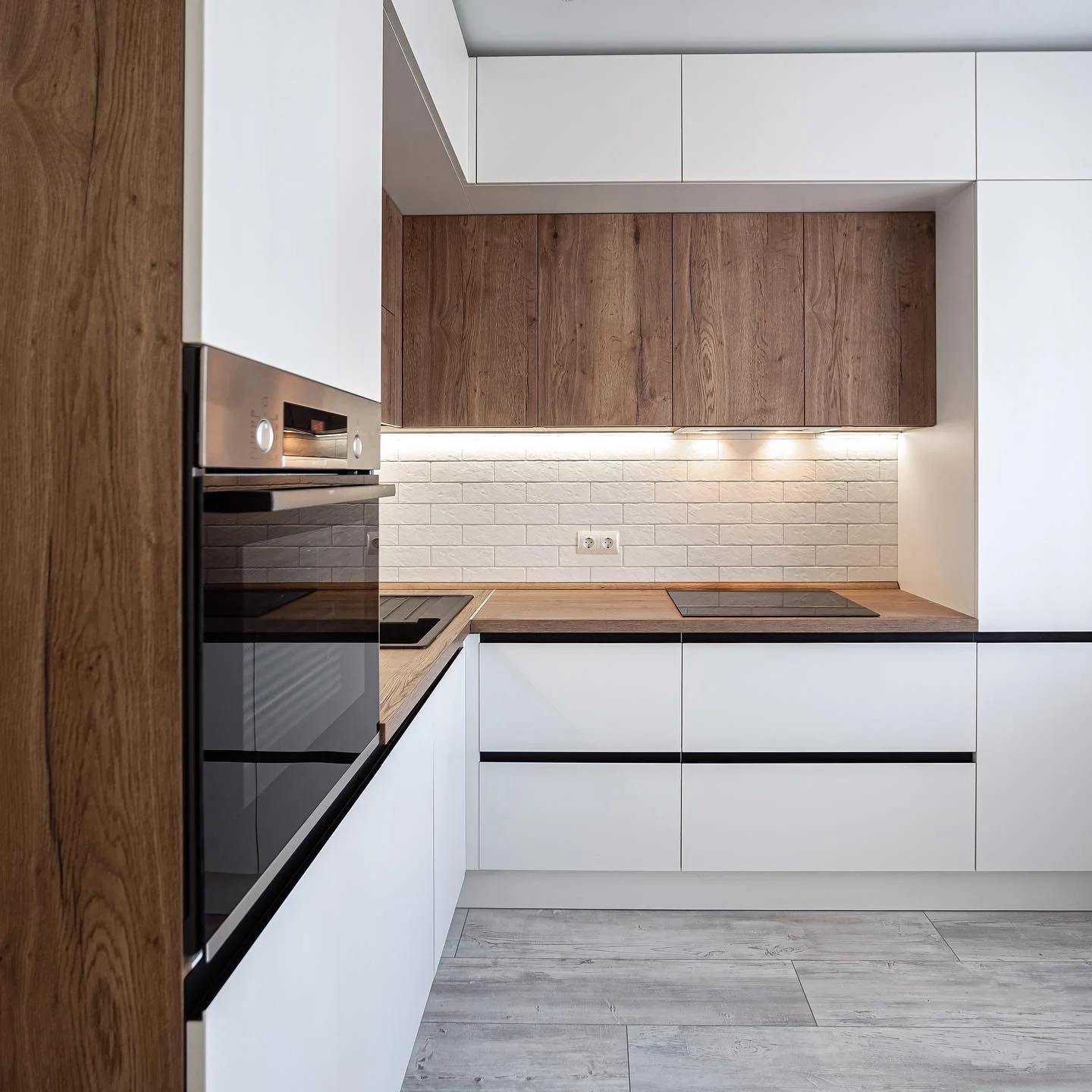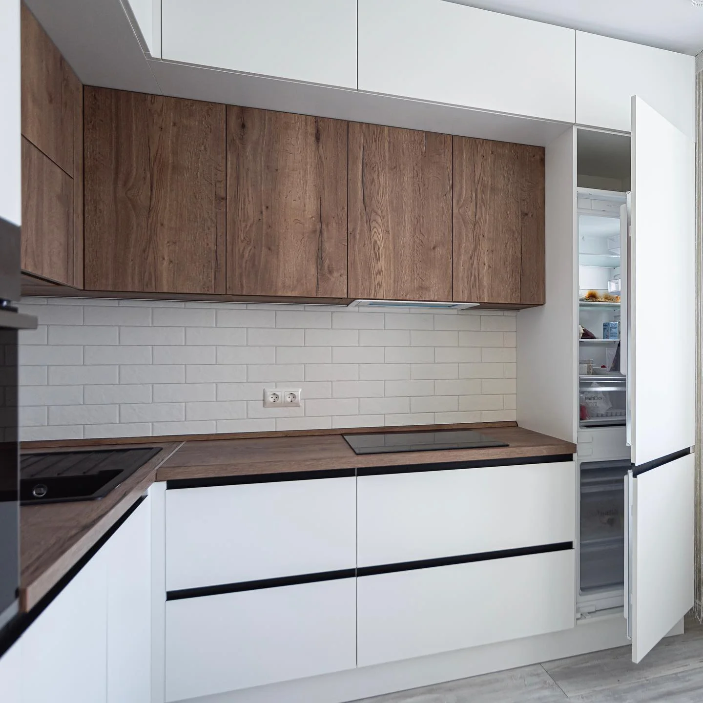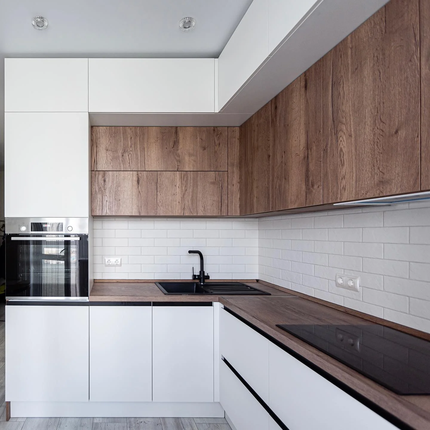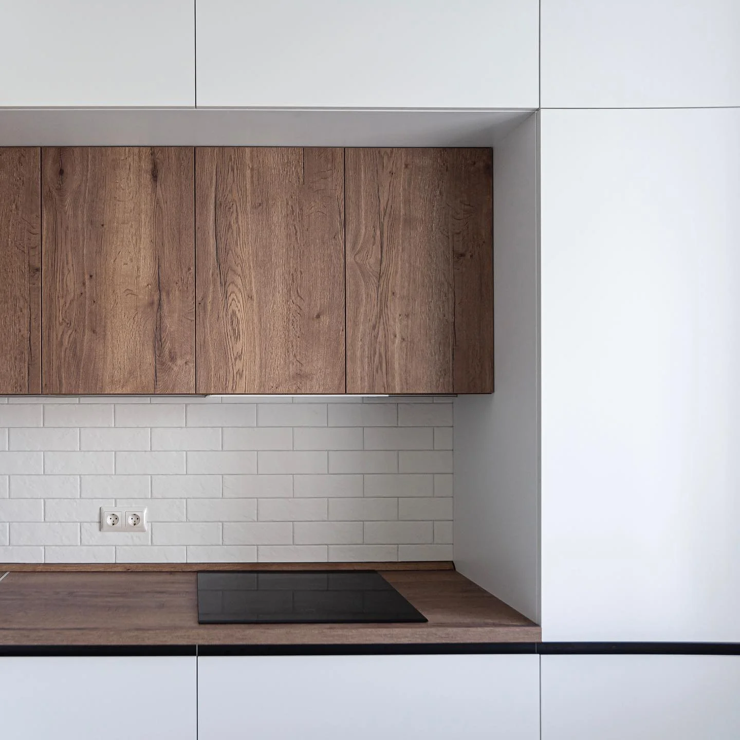 Кухня «Эстель» сочетает белые фасады и текстуру натурального дерева, создавая атмосферу тепла и уюта в современном интерьере. Контрастные линии и матовые поверхности подчёркивают минималистичный стиль. Столешница и верхние фасады выполнены в древесном декоре, который добавляет природной гармонии. Фурнитура Hettich обеспечивает плавность открывания и долгий срок службы.