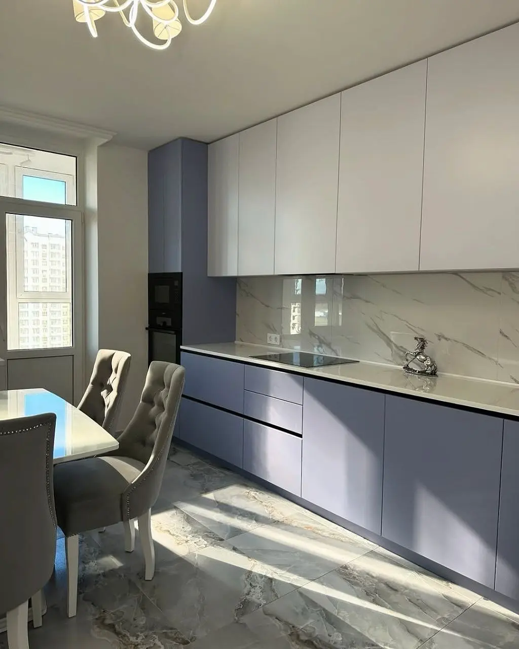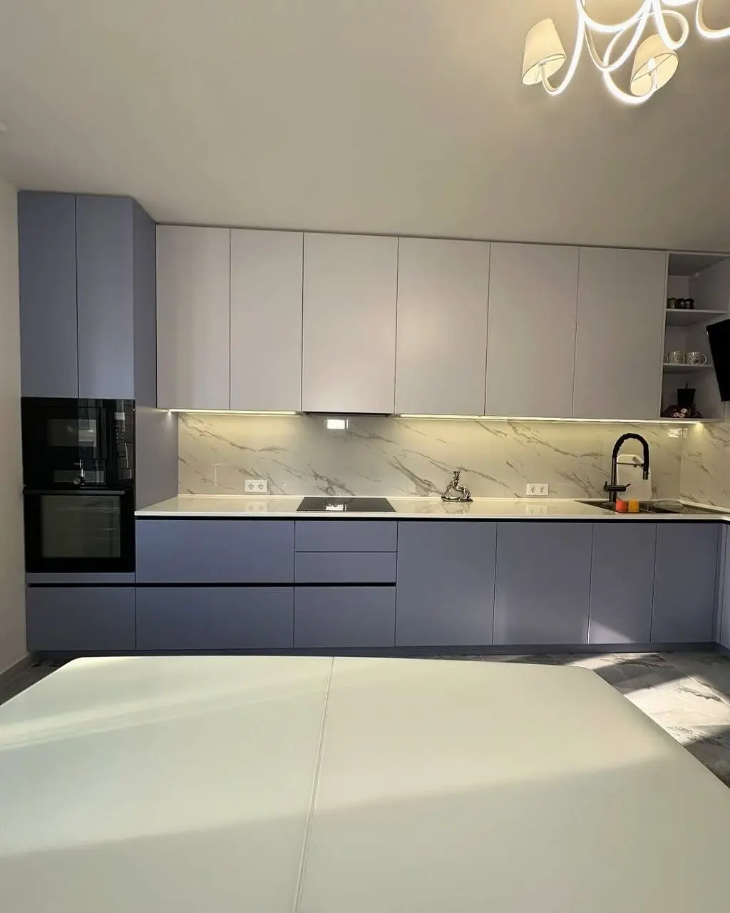 Кухня «Эстела» — современная угловая модель с сочетанием мягких голубых и белых оттенков. Матовые фасады подчёркивают элегантность интерьера, а мраморная столешница добавляет утончённости. Благодаря угловой планировке и встроенной подсветке кухня выглядит просторной, удобной и функциональной.