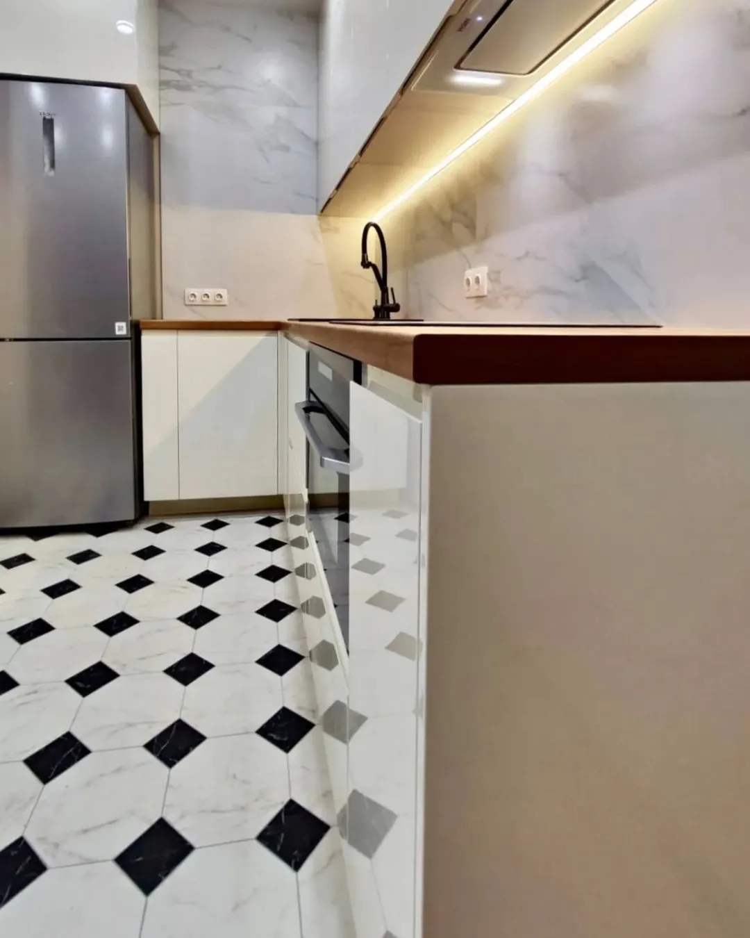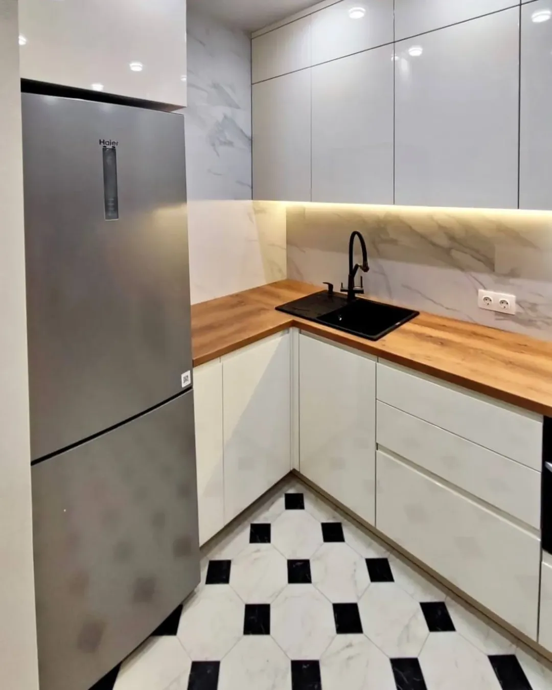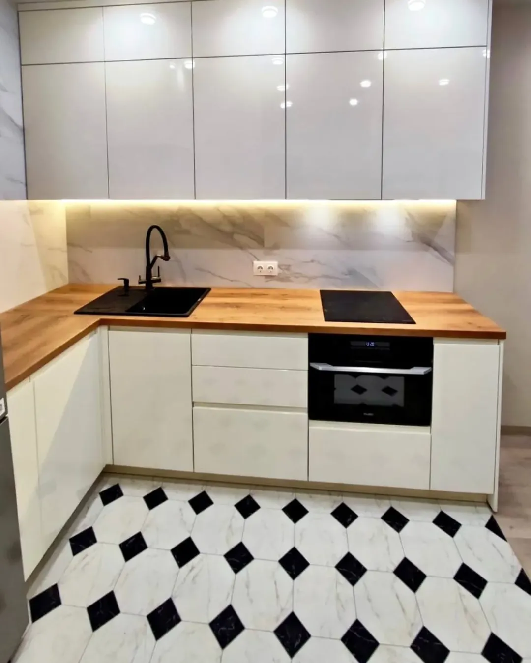 Эта угловая кухня выполнена в современном стиле и сочетает в себе лаконичные белые глянцевые фасады и теплую деревянную столешницу под дуб. Такое решение делает кухню визуально просторной и светлой, а акцент на дереве добавляет уюта. Встроенная подсветка и качественная фурнитура Blum обеспечивают максимальный комфорт в эксплуатации.