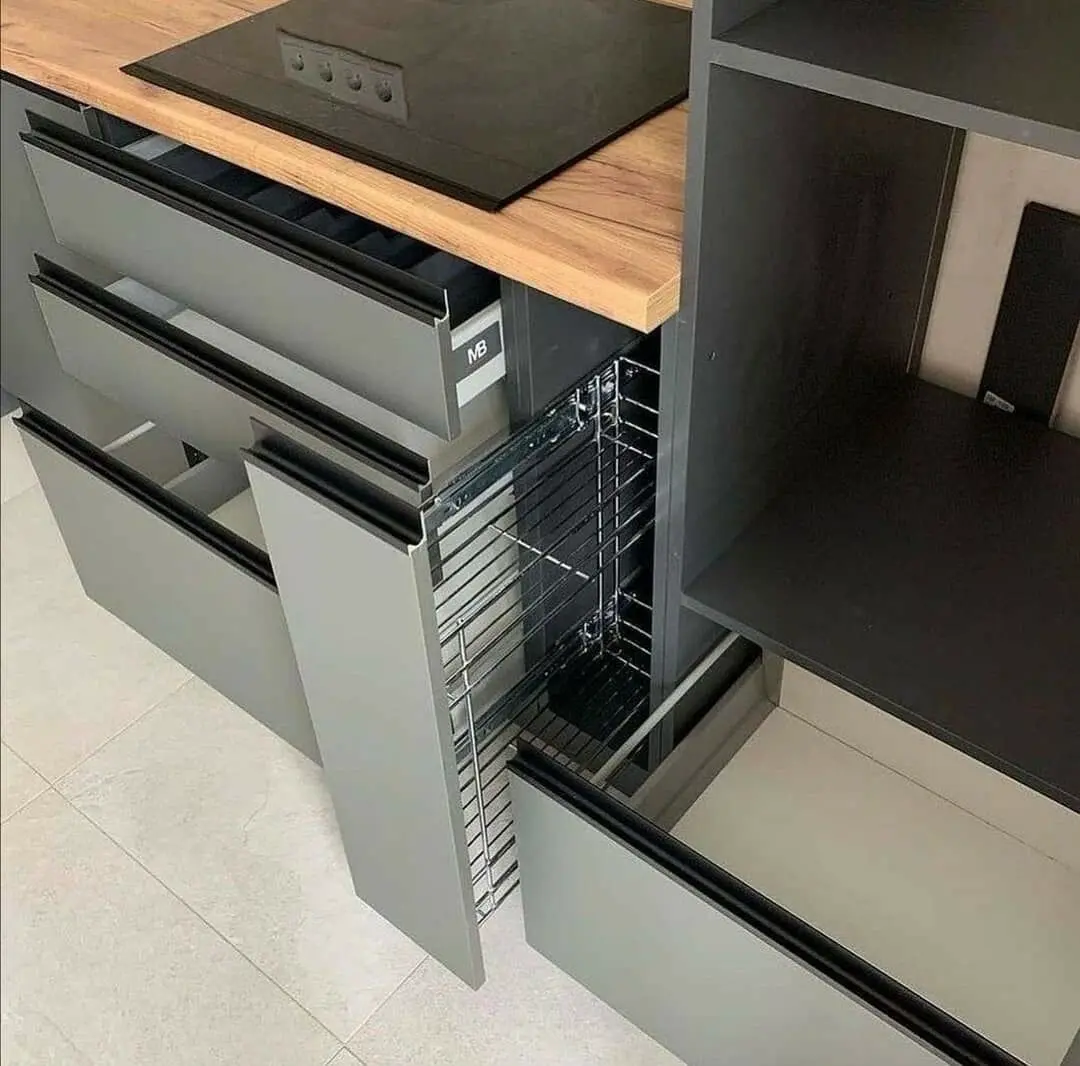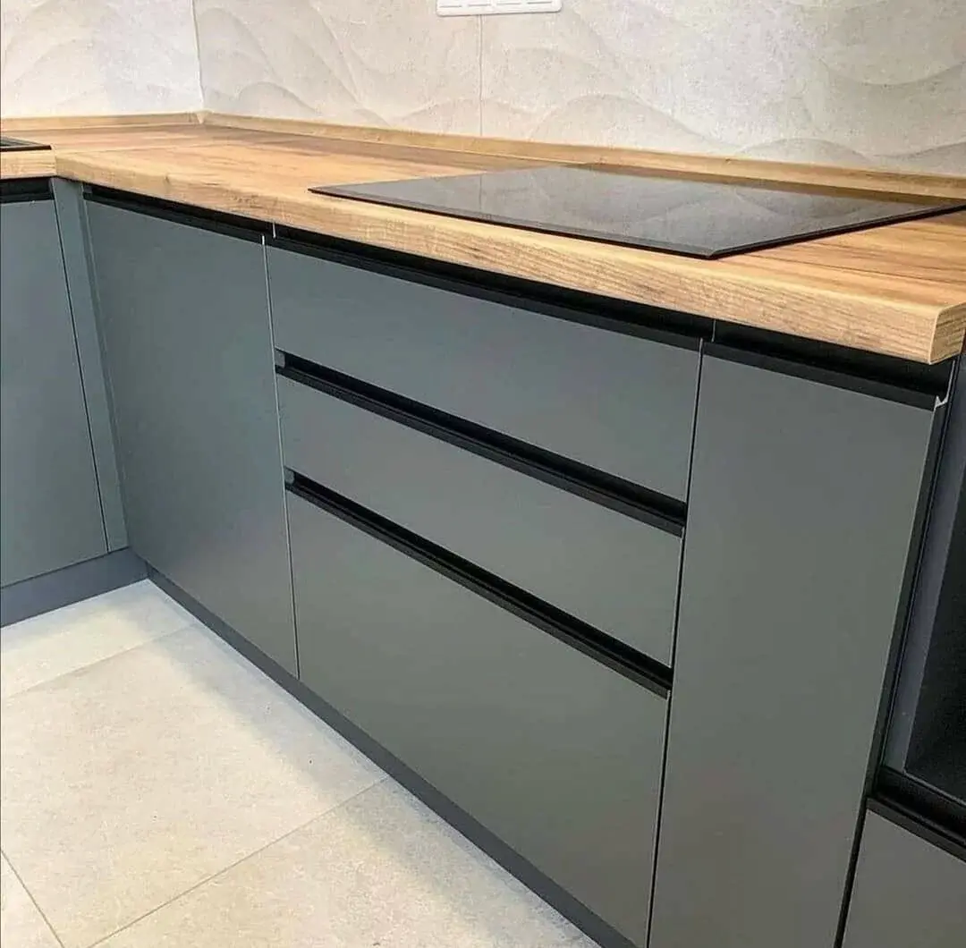 Угловая кухня в современном стиле с матовыми фасадами из МДФ в плёнке ПВХ. Контрастное сочетание тёмно-серых нижних модулей и белых верхних шкафов создаёт стильный и выразительный интерьер. Столешница и фартук с текстурой дерева добавляют тепла и уюта, а фурнитура Blum гарантирует плавное и долговечное использование. Такая кухня сочетает в себе практичность, современный дизайн и удобство эксплуатации.