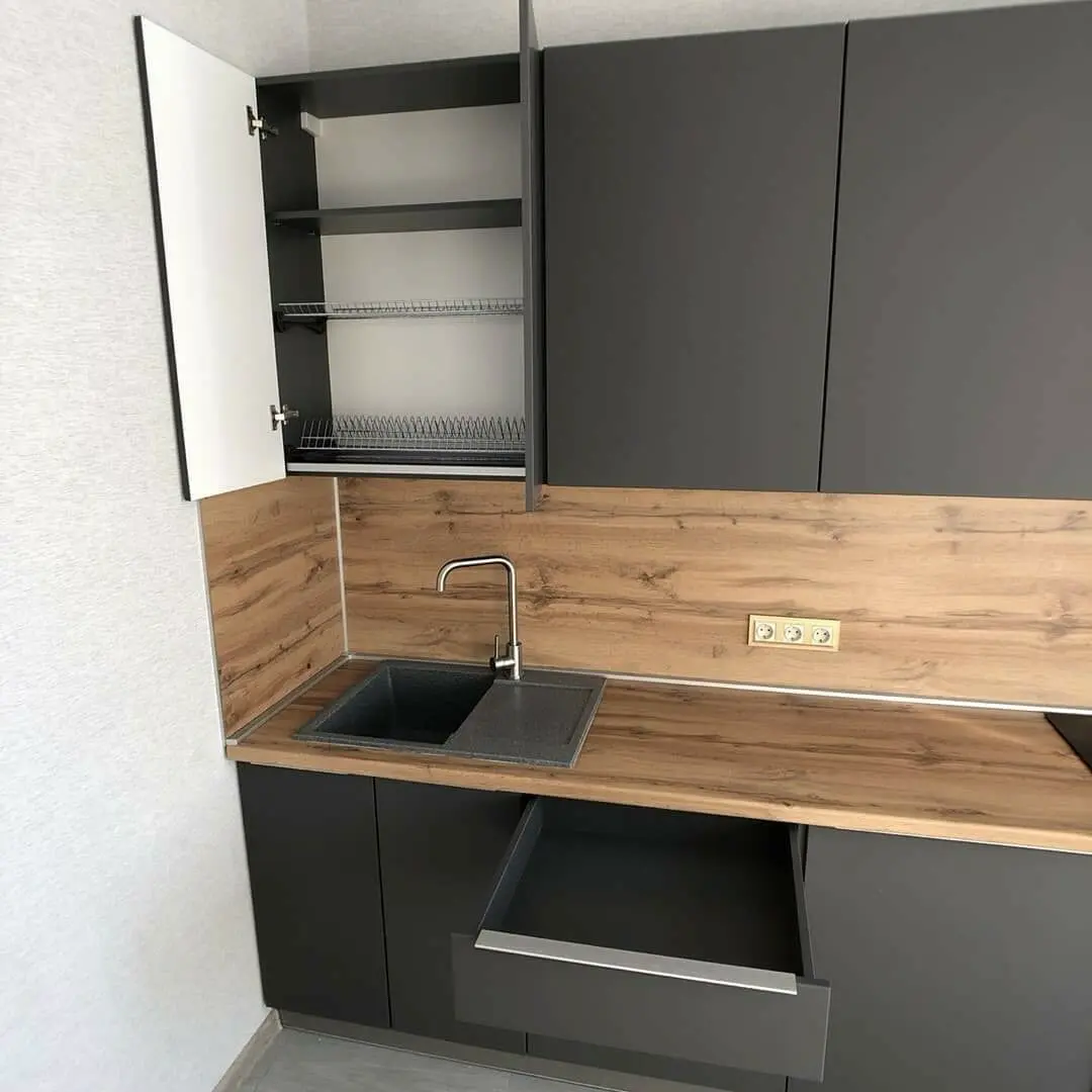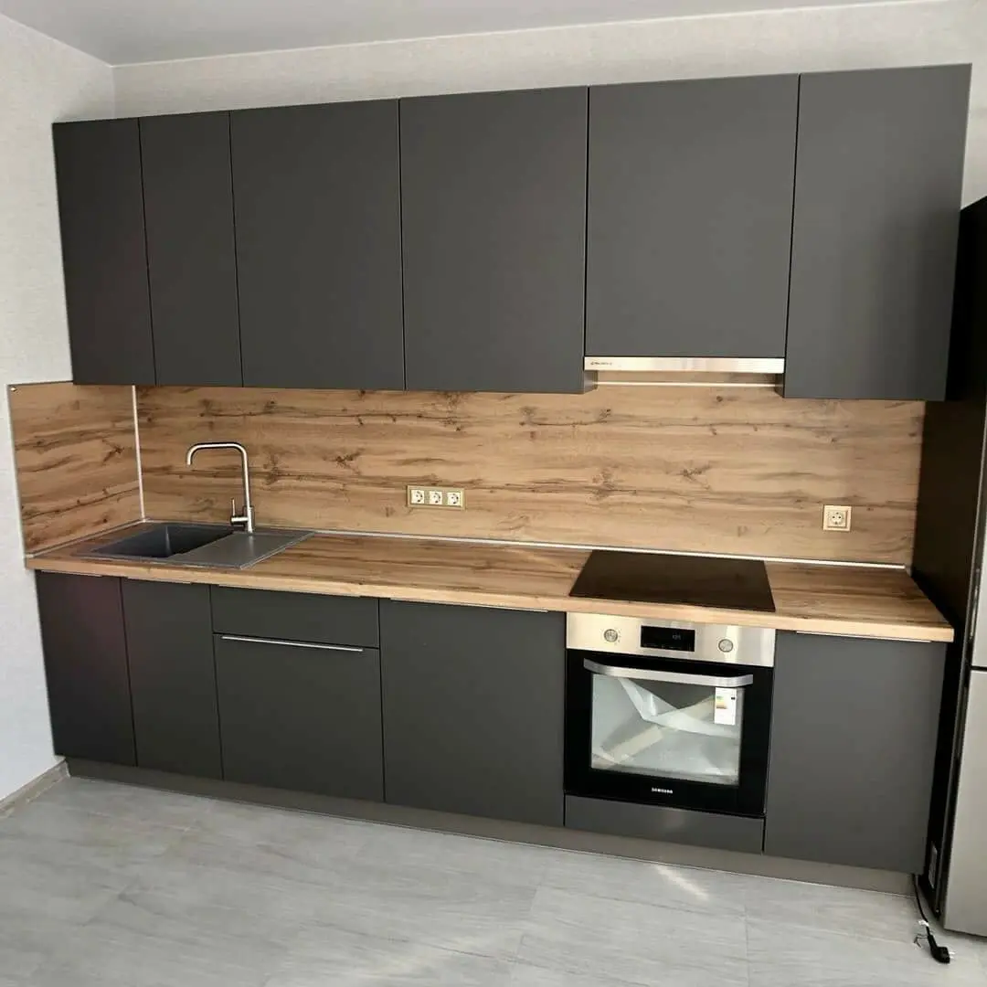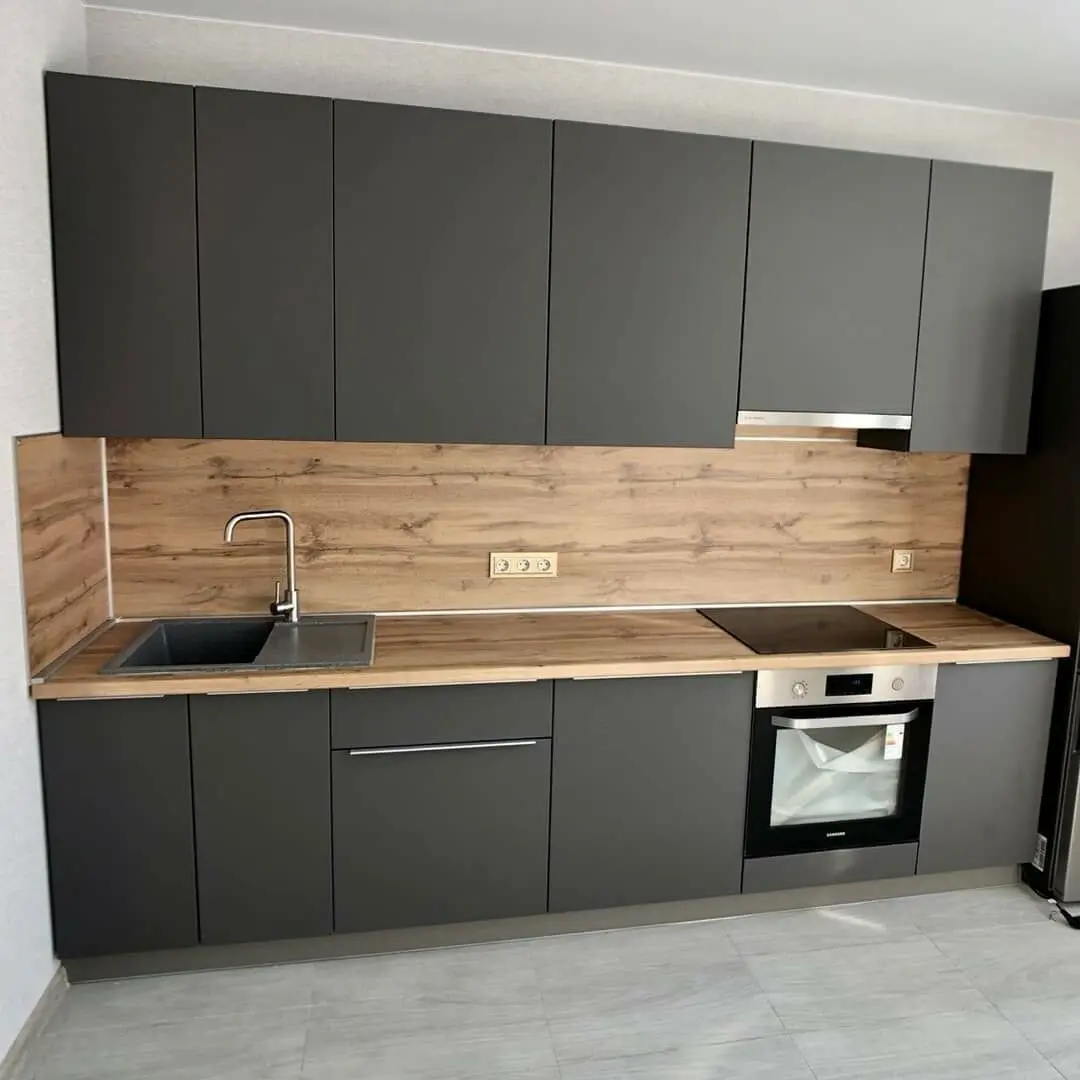 Прямая кухня с матовыми графитовыми фасадами и стильной столешницей под дуб. Натуральная текстура дерева на фартуке создаёт тёплый контраст с глубоким графитом фасадов. Простая геометрия и скрытая фурнитура обеспечивают современный минималистичный вид, а качественная техника делает кухню функциональной и практичной.