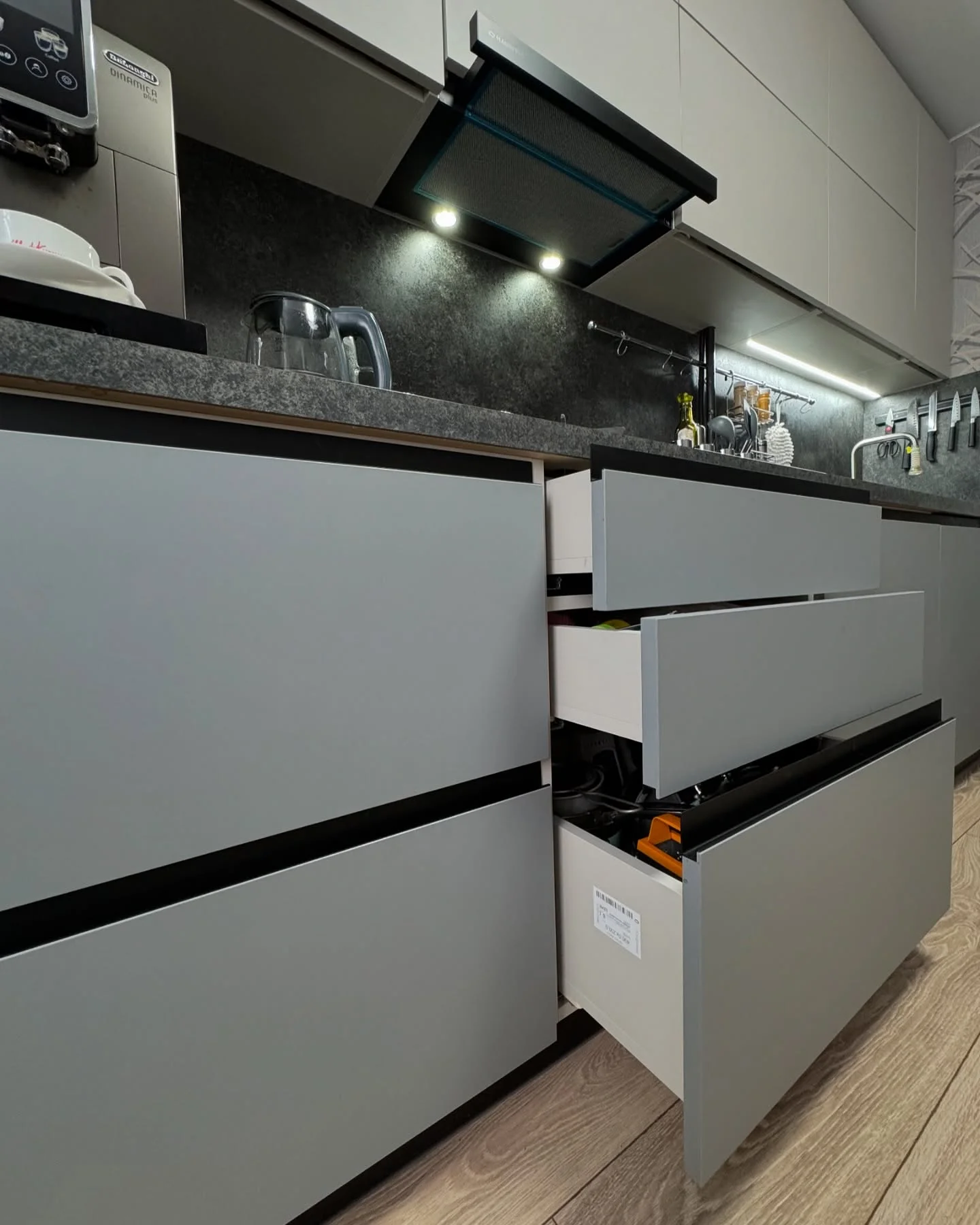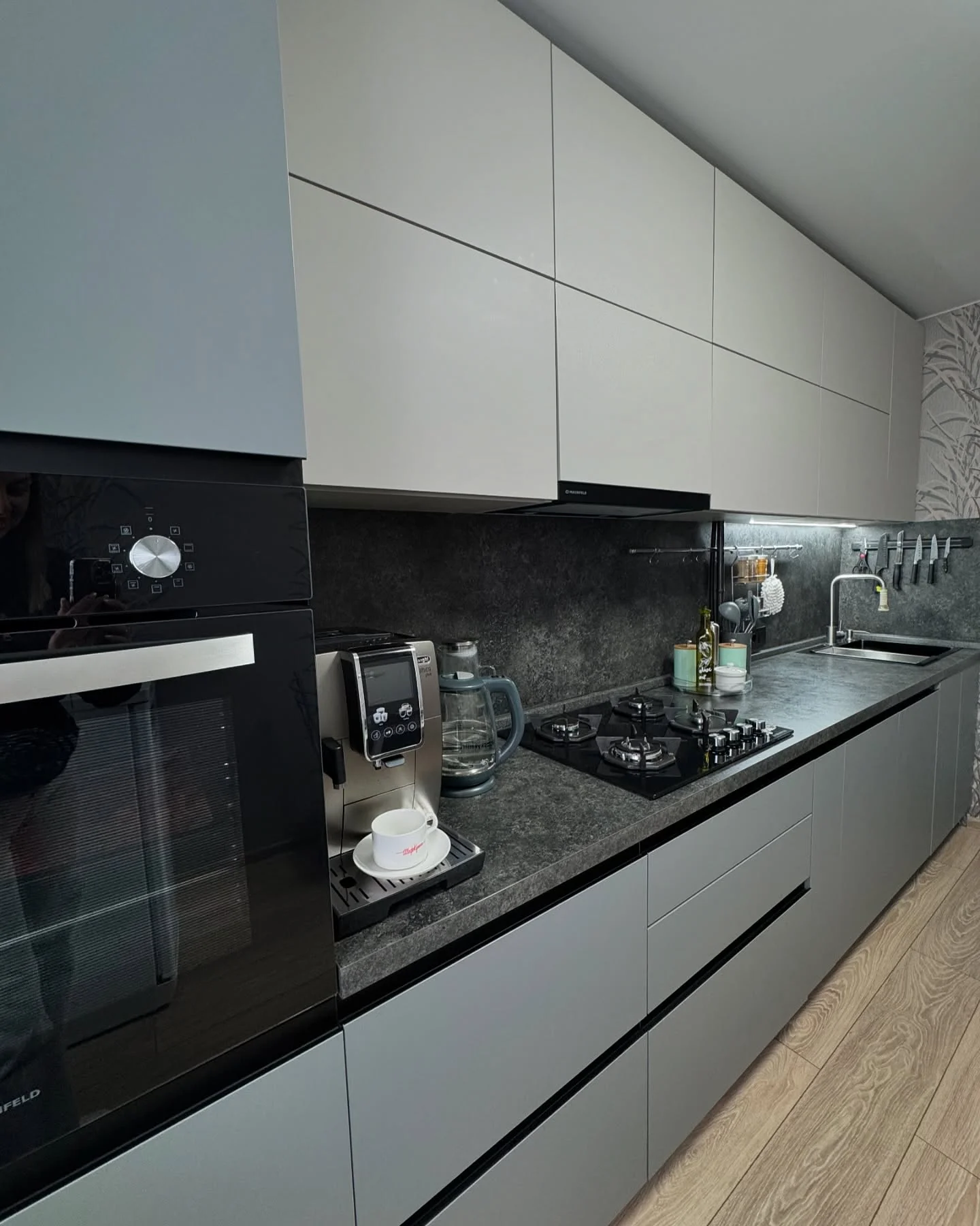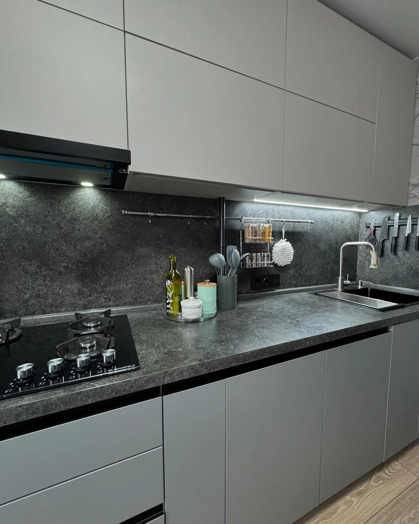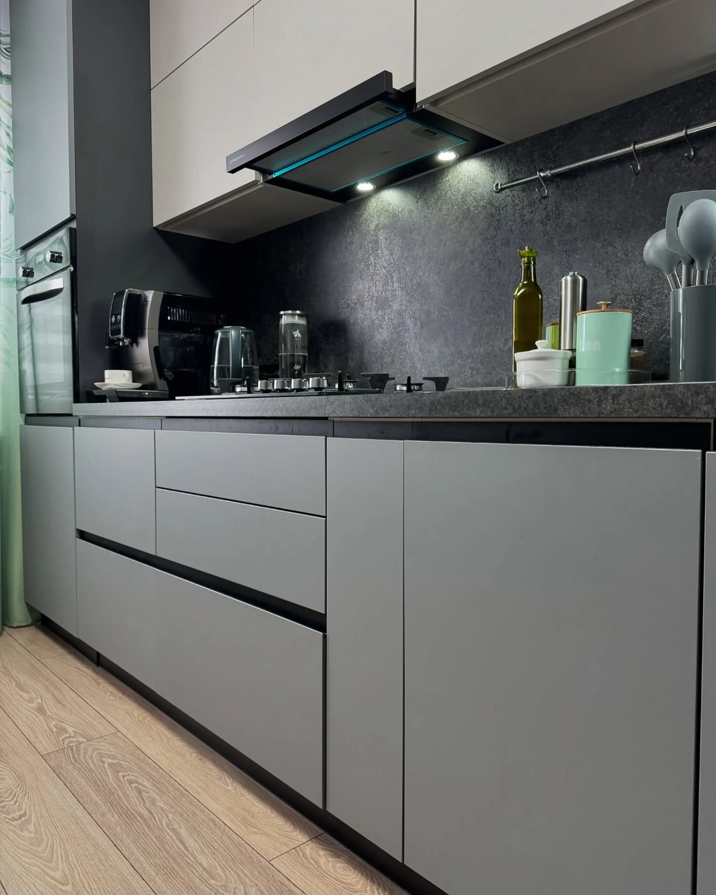 Современная прямая кухня в матовом сером цвете с контрастным темным фартуком и столешницей. Гладкие фасады из МДФ создают лаконичный дизайн, а черные элементы подчеркивают стиль и характер интерьера. Удобное расположение бытовой техники и рабочей зоны делает кухню практичной и функциональной.