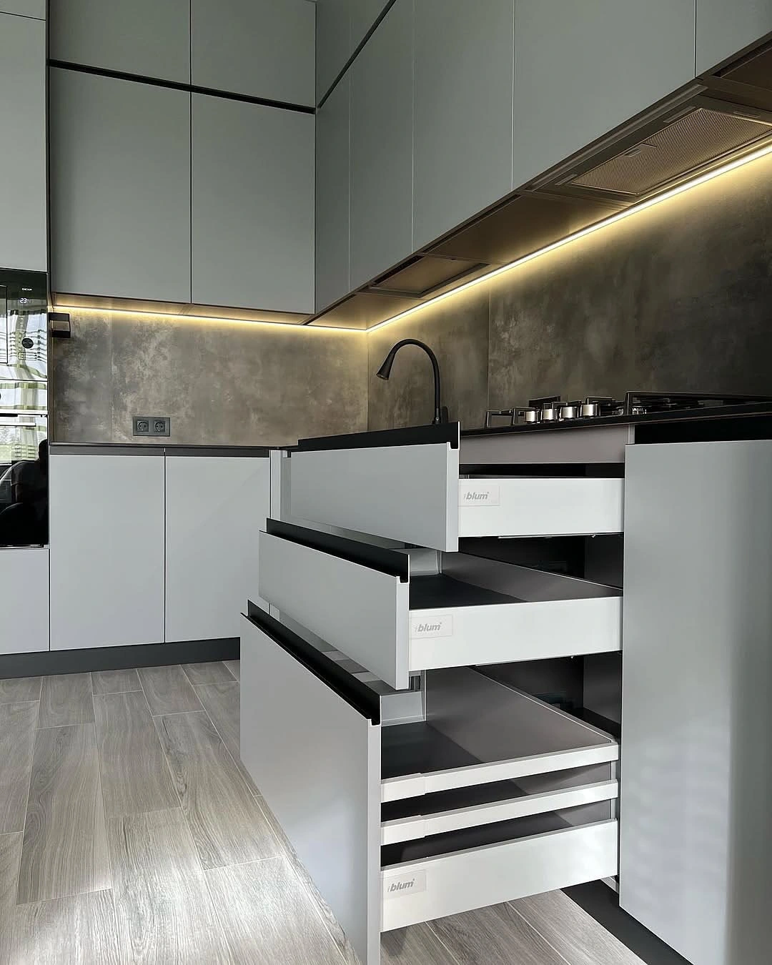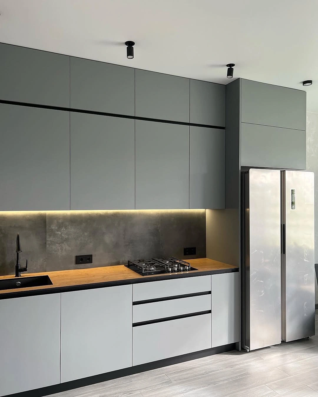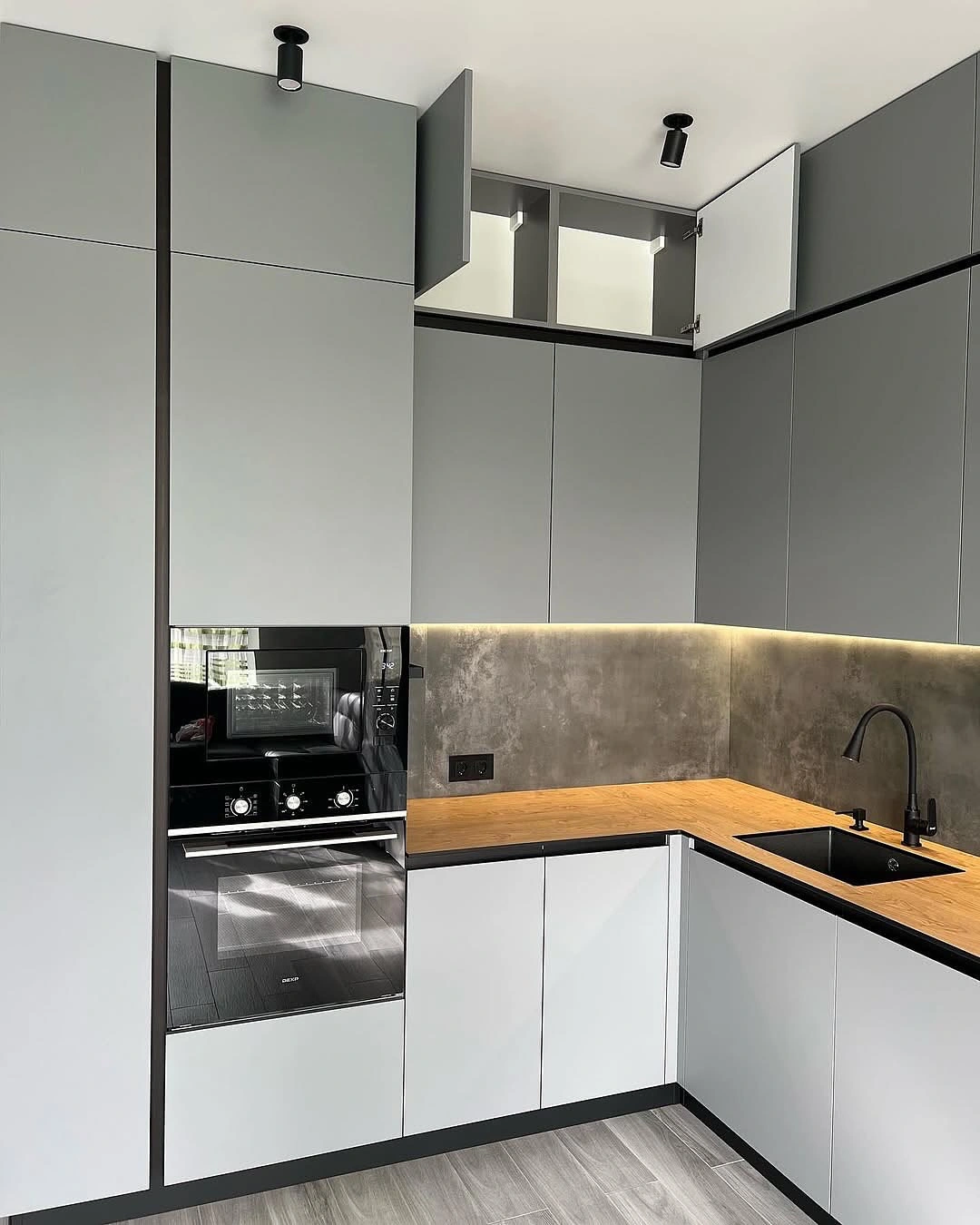 Угловая кухня в сером цвете с чёрными акцентами и деревянной столешницей. Фартук под бетон и подсветка рабочей зоны оформите стильный и уютный интерьер. Чёткие линии и лаконичный дизайн подчеркивают современный характер кухни и делают ее удобной для повседневного использования.