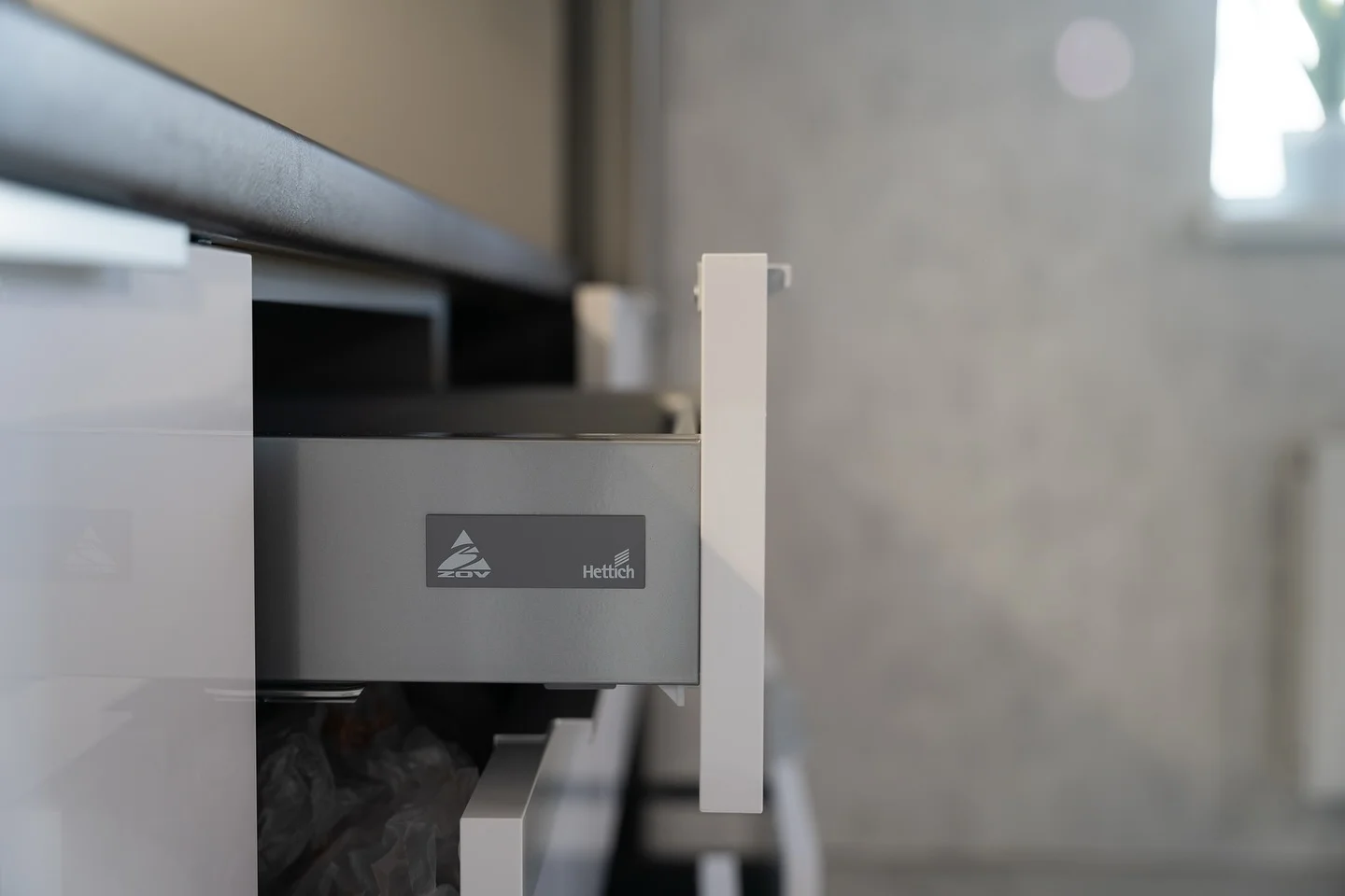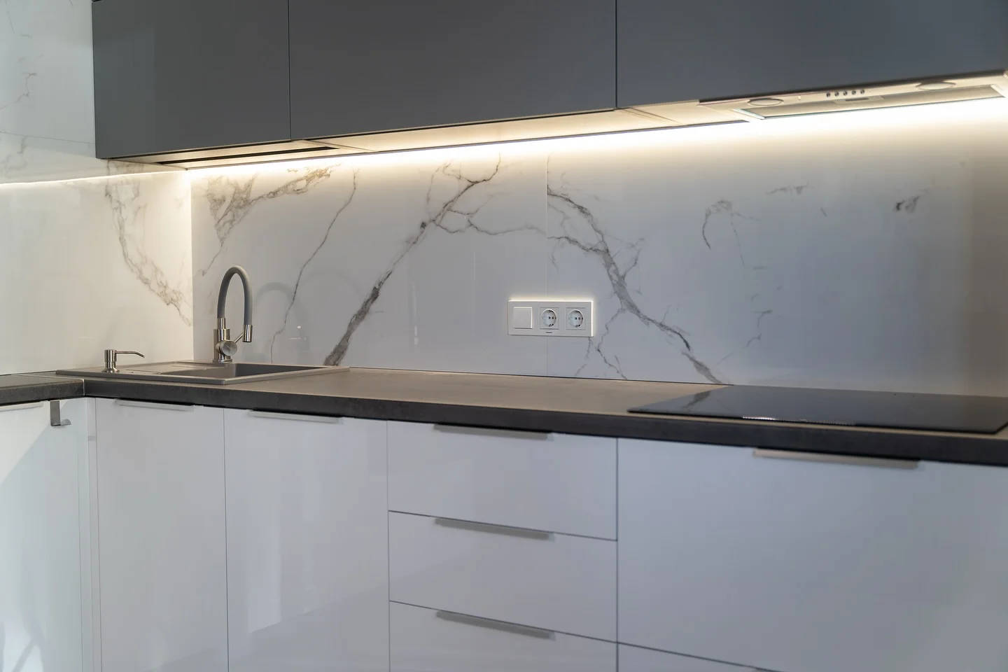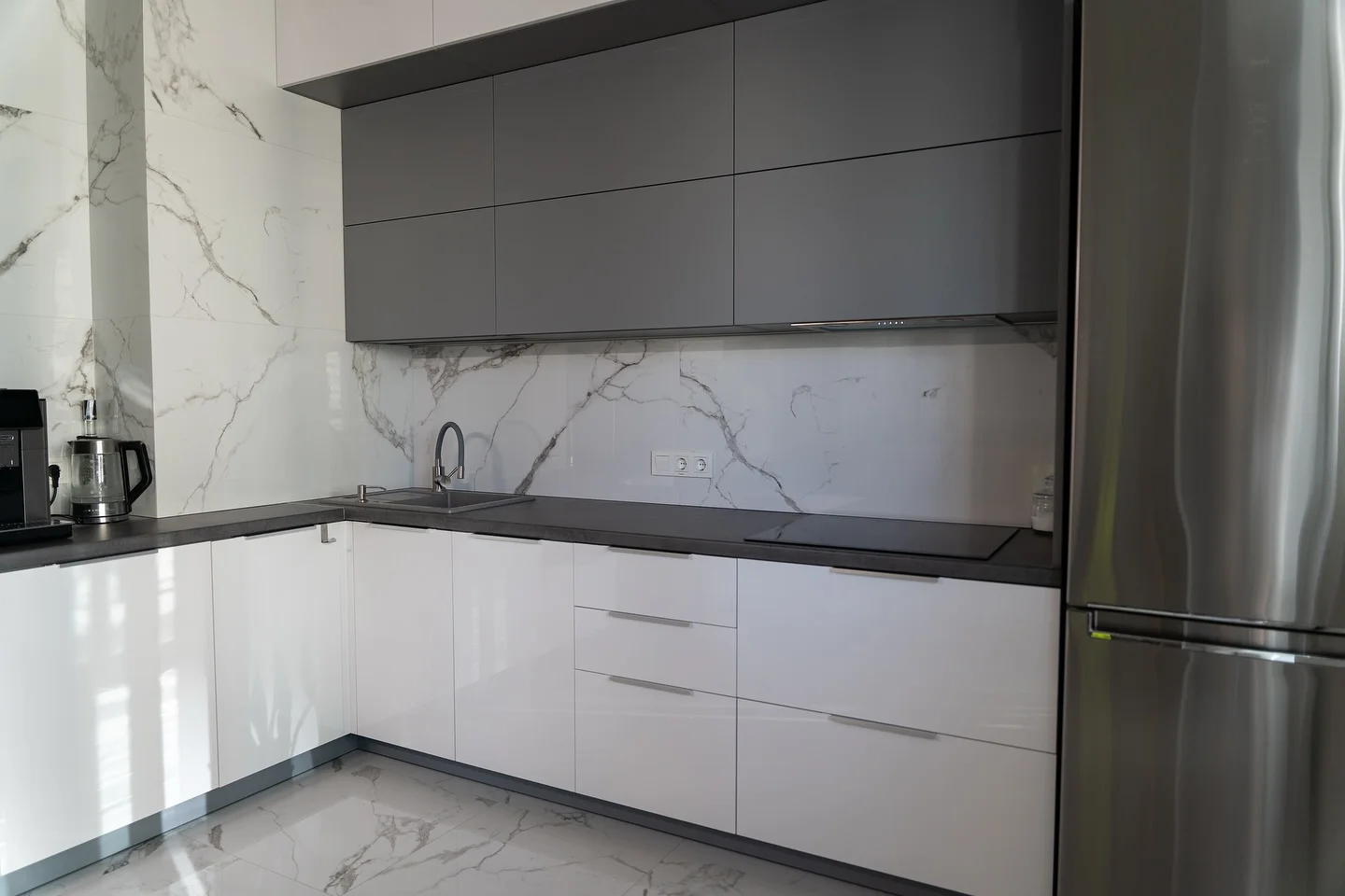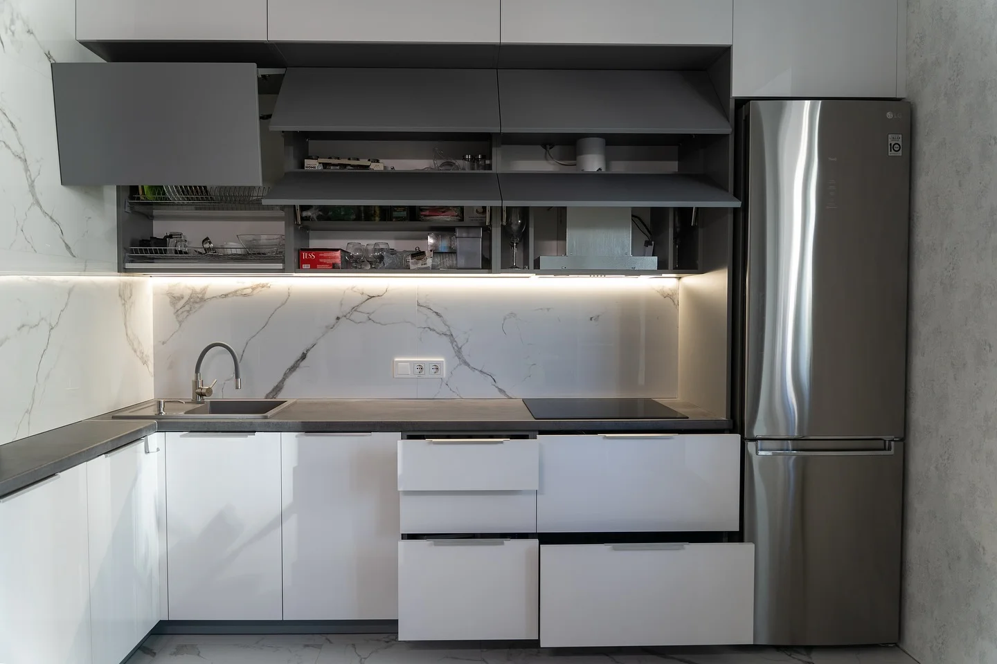 Кухня Graphite Stone — стильное сочетание минимализма и премиальных материалов. Контраст глянцевых белых фасадов и матового серого верха создает современный, элегантный образ. Столешница из искусственного камня в оттенке антрацит придает интерьеру глубину и солидность. Мраморный фартук и пол усиливают эффект роскоши, а встроенная техника и эргономичная планировка обеспечивают функциональность и комфорт.