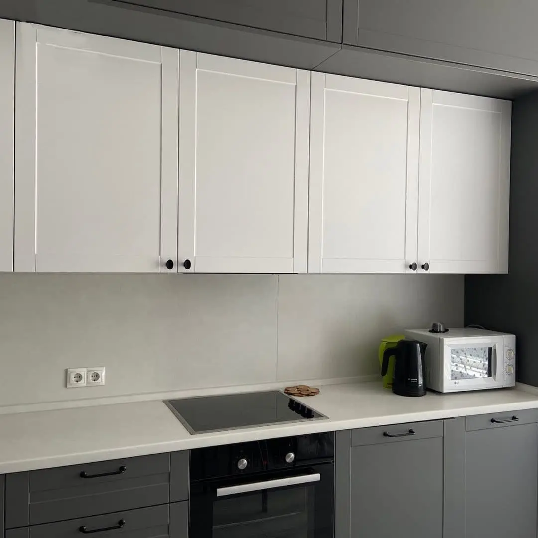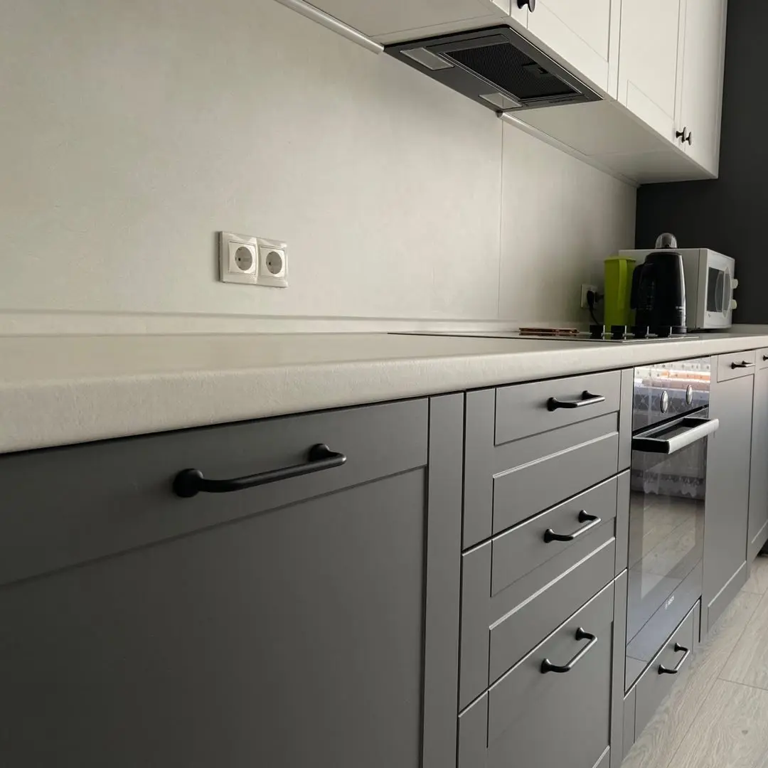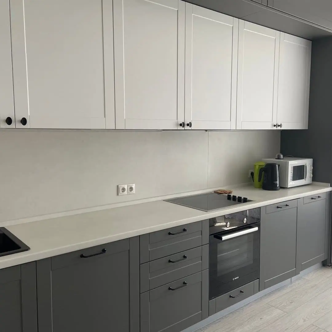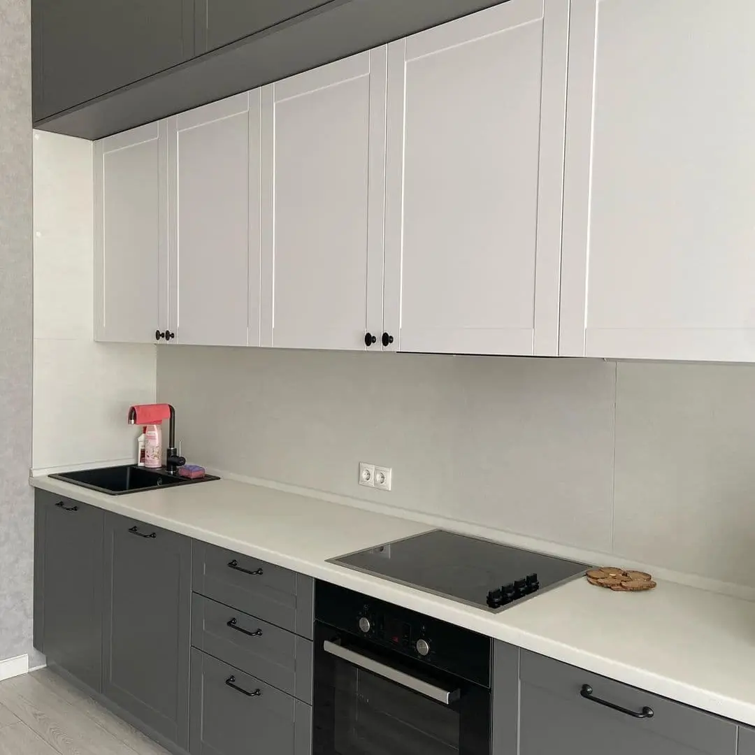 Кухня «Грета» выполнена в современном классическом стиле с фасадами из МДФ в пленке ПВХ с фрезеровкой. Контраст серых нижних и белых верхних модулей создаёт элегантное и сбалансированное решение для интерьера. Столешница из искусственного камня и надёжная фурнитура Blum обеспечивают долговечность и комфорт в использовании. Чёрные ручки придают гарнитуру характерный акцент, сохраняя гармонию цветов.