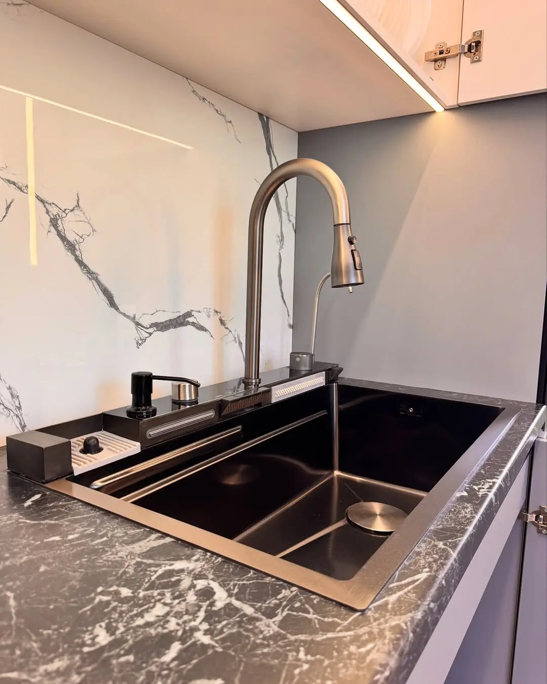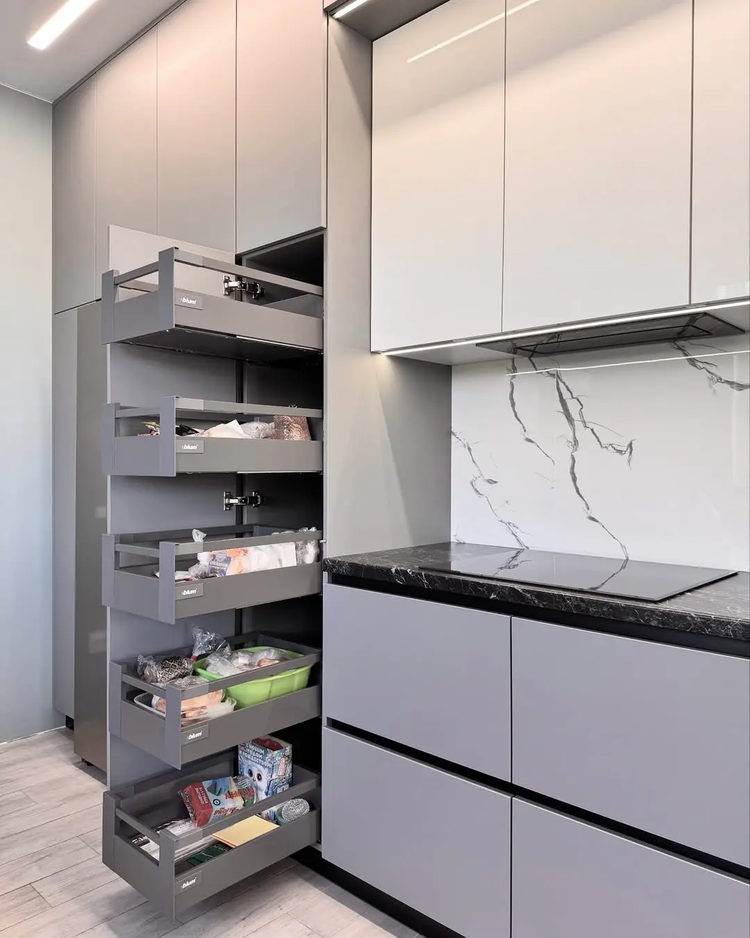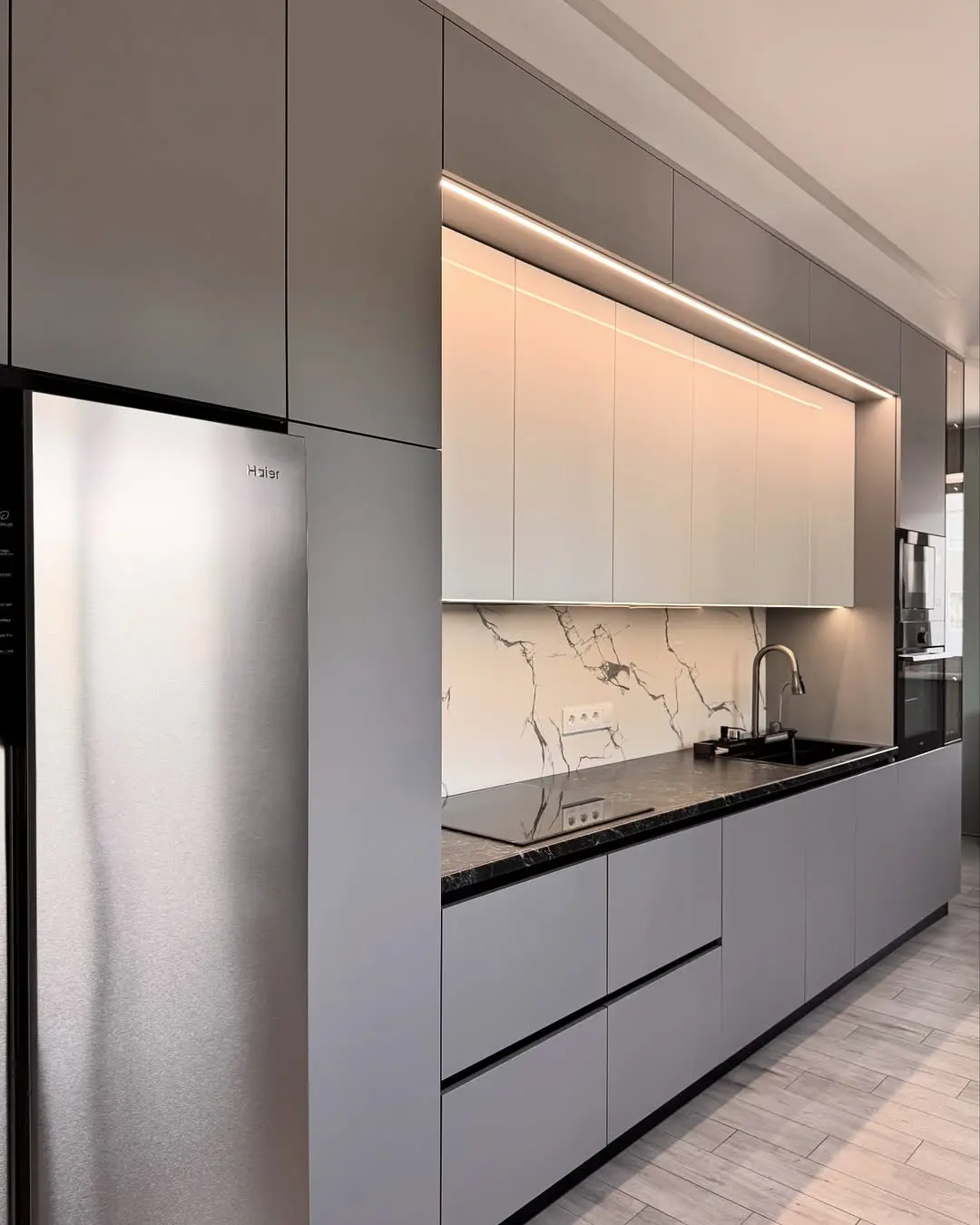 Прямая модель длиной 5000 мм, выполненная в стиле минимализм с акцентом на строгие линии и контрасты. Фасады из акрилового пластика в белом и сером цветах гармонично сочетаются с чёрной каменной столешницей. Встроенная витрина с подсветкой добавляет лёгкости и изысканности интерьеру. Фурнитура Blum обеспечивает плавную и надёжную работу, а материалы премиального качества делают проект долговечным и практичным.