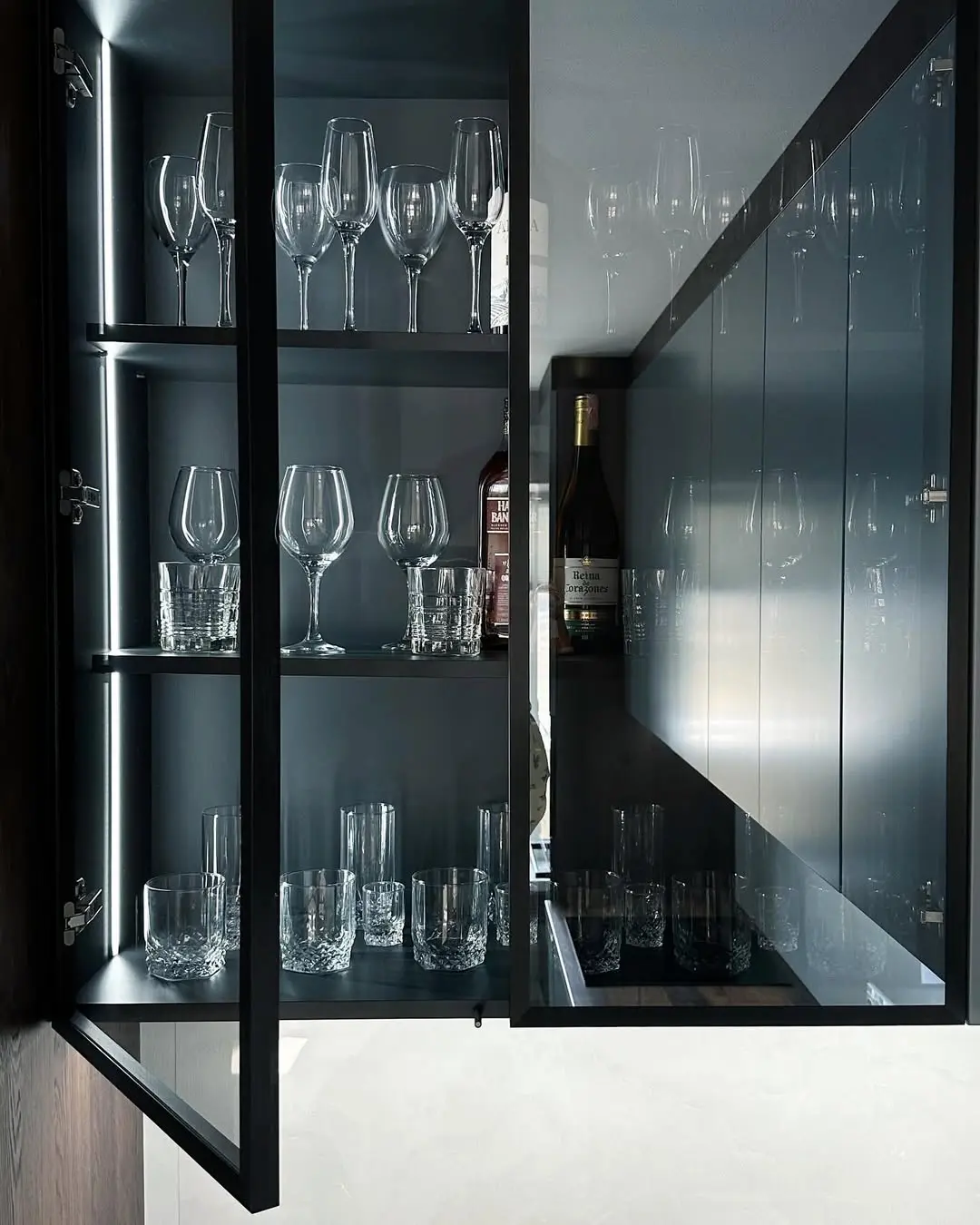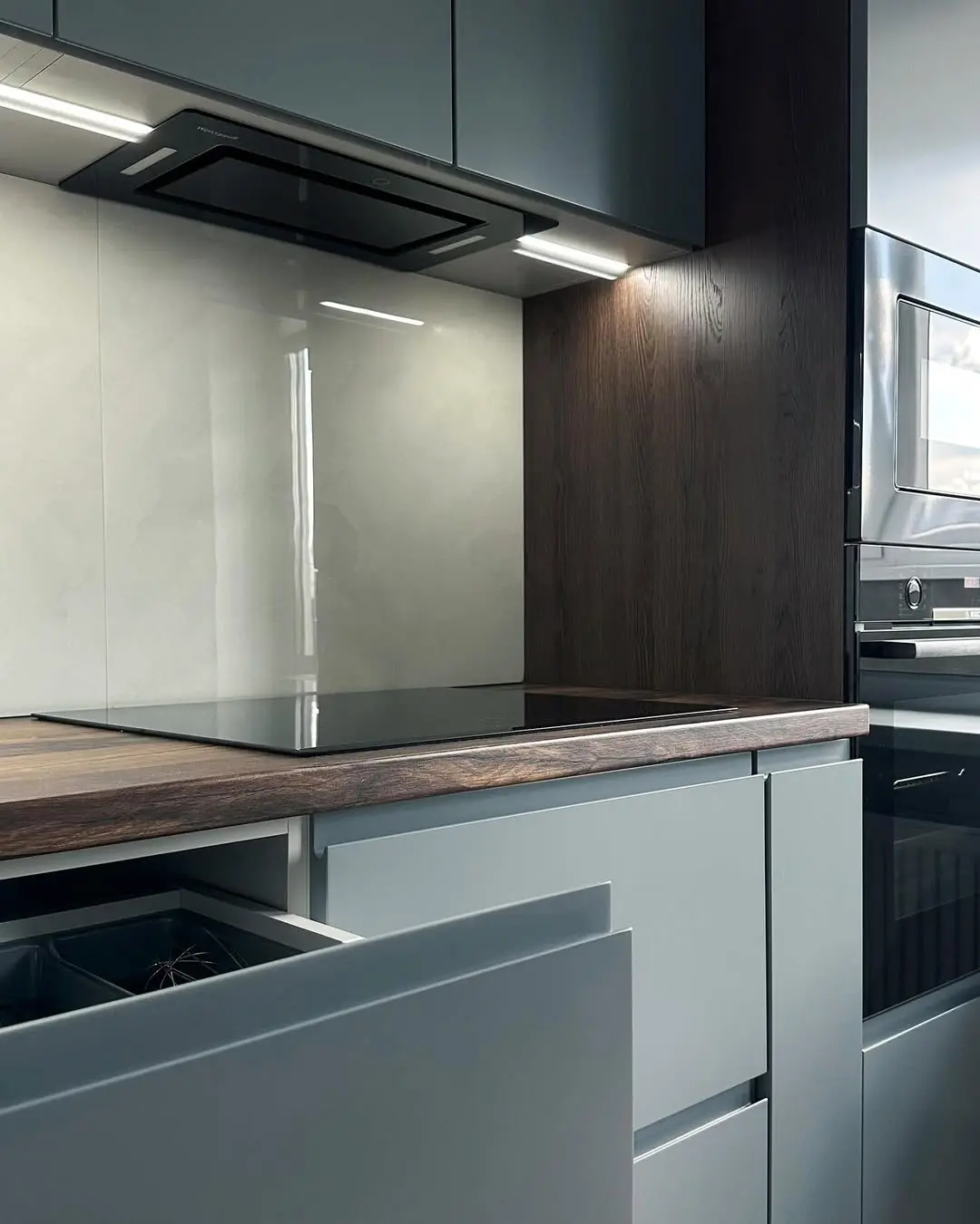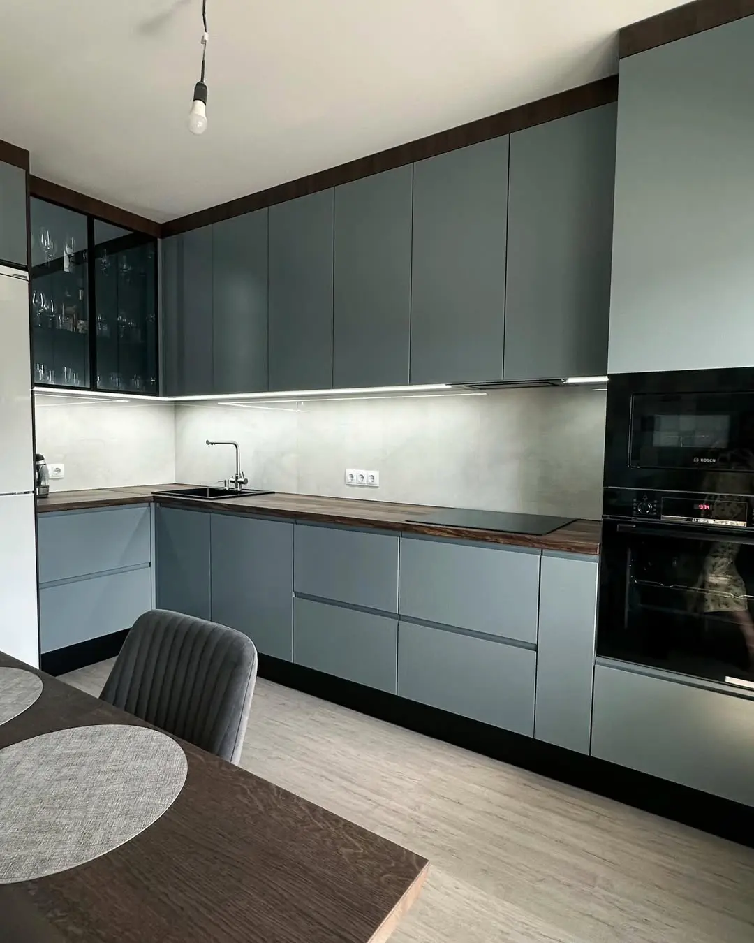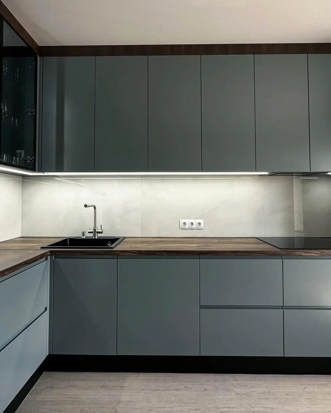 Современная угловая кухня с матовыми серыми фасадами и контрастной столешницей под дерево. Гармоничное сочетание холодных и тёплых оттенков создаёт спокойный, сбалансированный интерьер. Простая геометрия и лаконичные линии подчёркивают функциональность и актуальный минимализм.