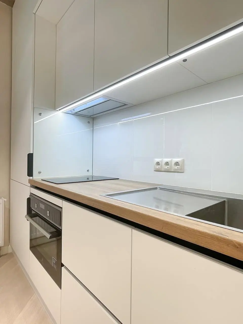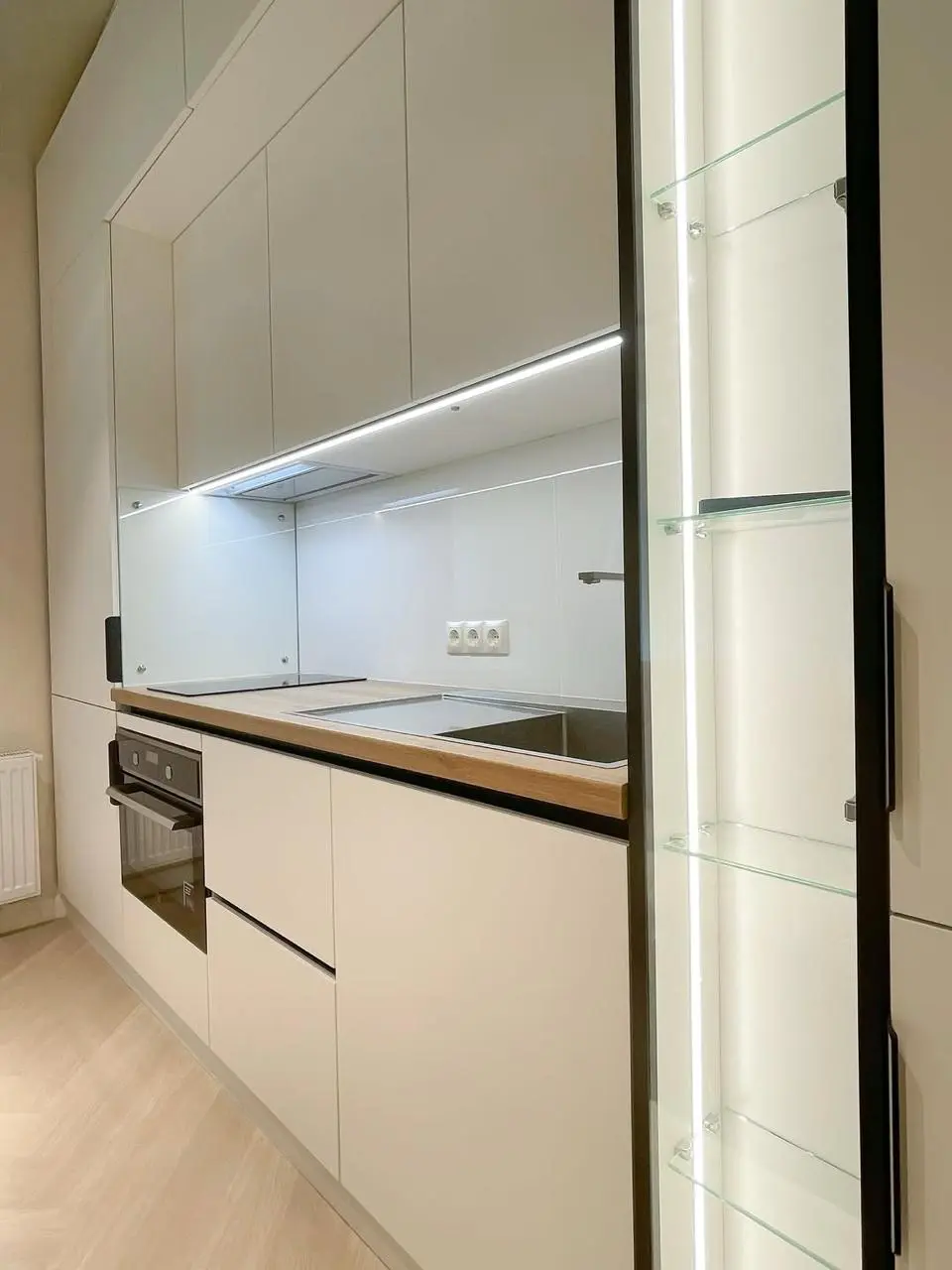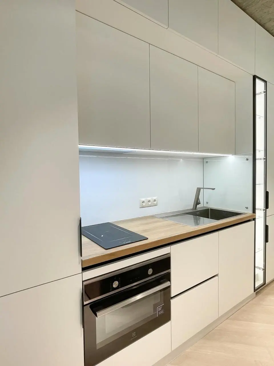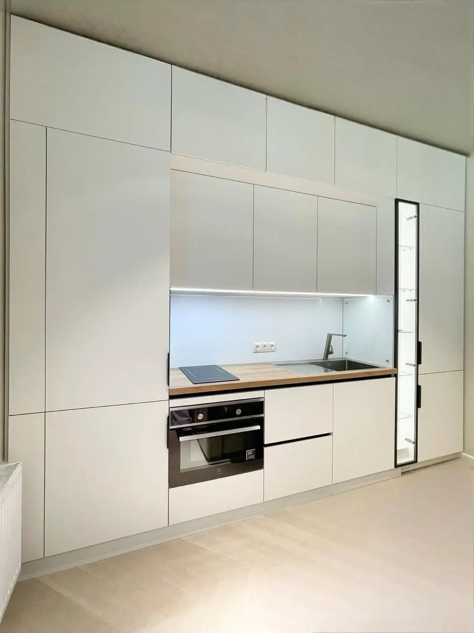 Прямая кухня Айсберг выполнена в минималистичном скандинавском стиле. Белые фасады с интегрированными ручками создают ощущение лёгкости, а столешница под светлое дерево добавляет уюта. Чёрные акценты в технике и профилях подчёркивают современный характер интерьера. Компактная, но вместительная планировка делает эту кухню функциональной и визуально просторной.