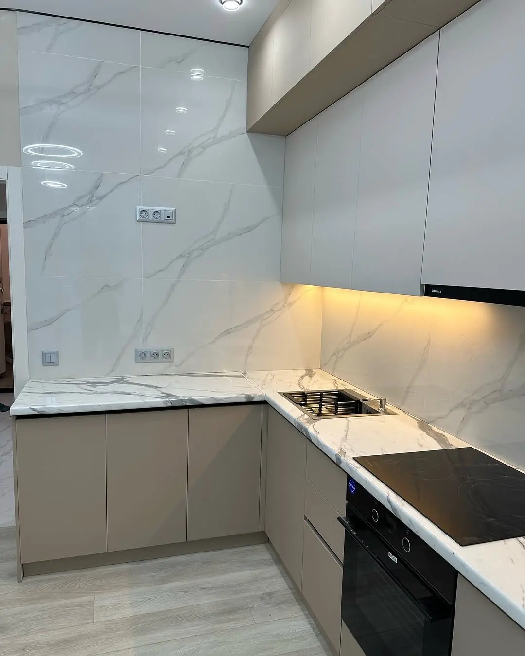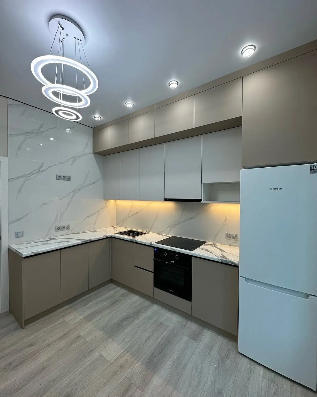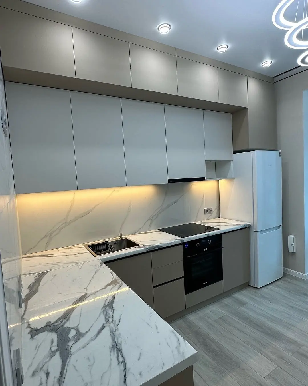 Кухня Лайн выполнена в современном стиле с акцентом на лаконичность и функциональность. Матовые фасады в спокойной бежево-серой гамме гармонично сочетаются с белой мраморной столешницей и фартуком. Угловая планировка позволяет рационально использовать пространство и удобно организовать рабочие зоны. Встроенная техника подчёркивает минимализм дизайна, а фурнитура Blum обеспечивает плавность и долговечность в использовании.