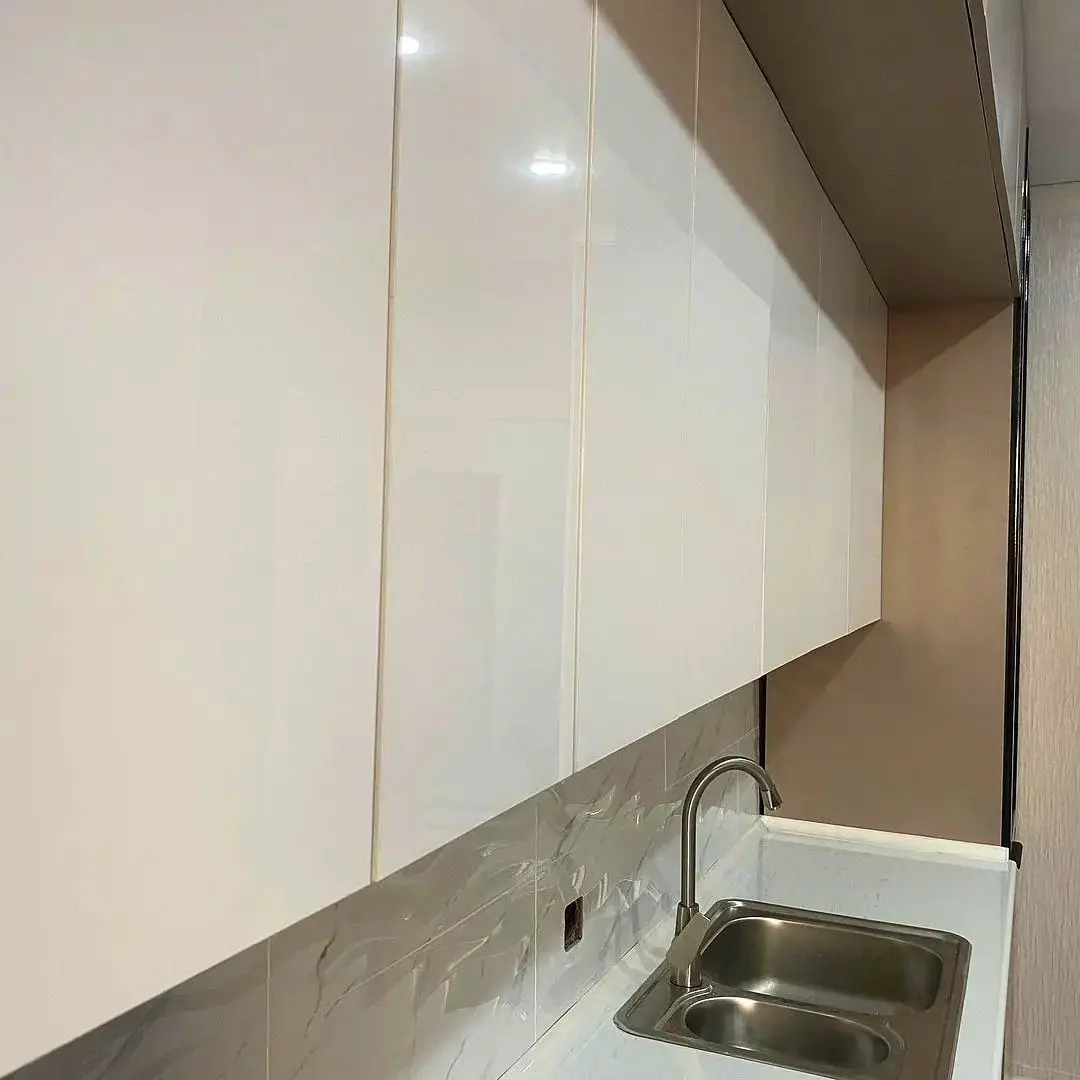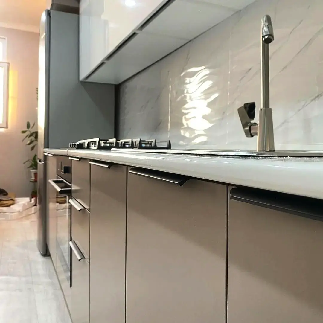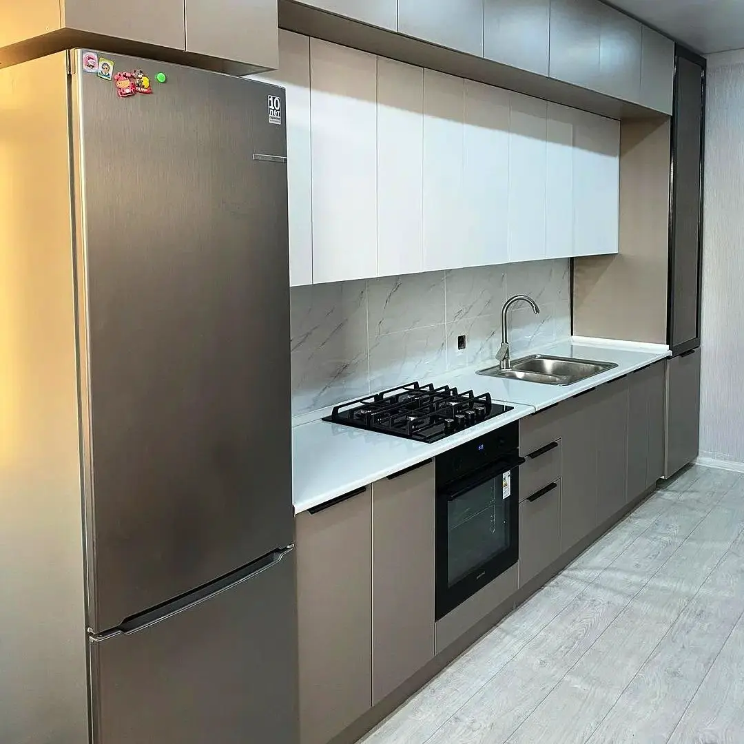 Прямая кухня в современном стиле с фасадами в двух цветах: верхние шкафы белые, нижние — в оттенке капучино. Такое сочетание делает интерьер лёгким и уютным. Светлая столешница из искусственного камня и фартук под мрамор создают гармоничный и стильный образ. Вместительные шкафы до потолка и качественная фурнитура Hettich обеспечивают удобство и долговечность.