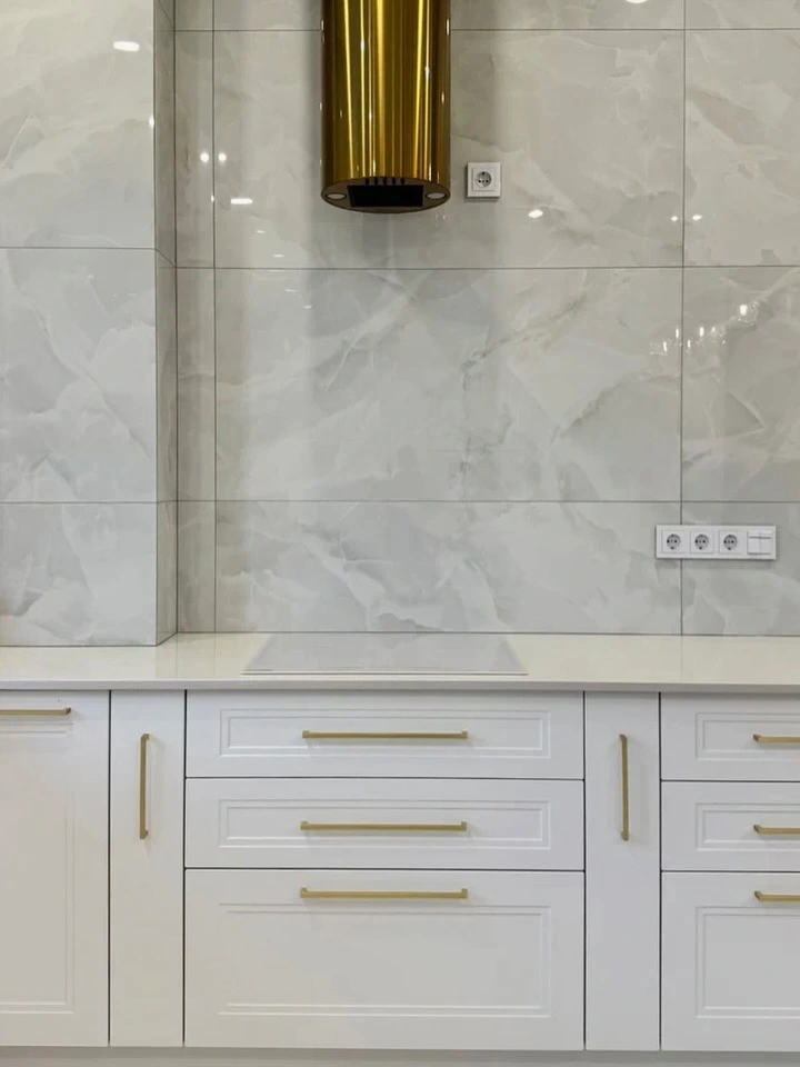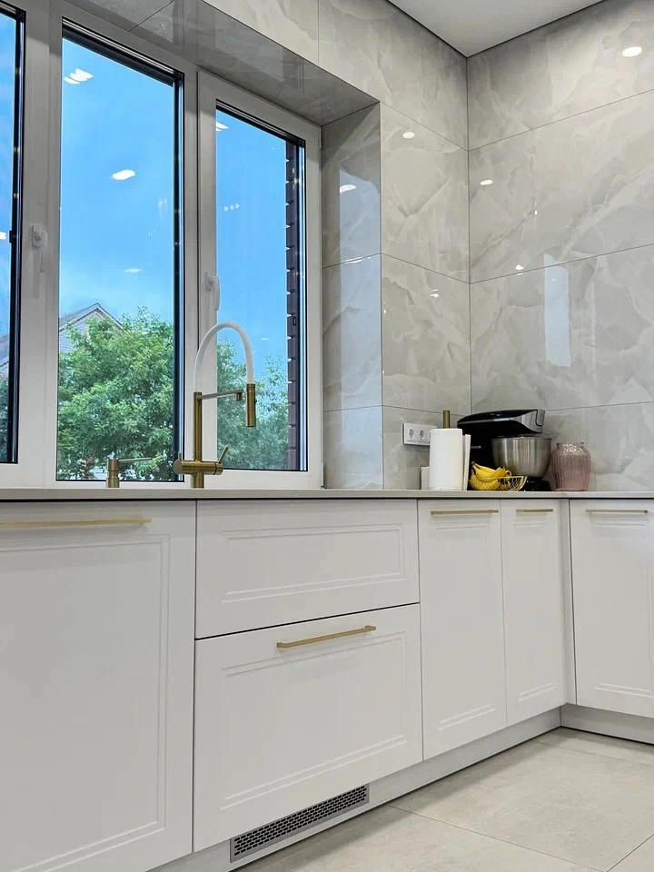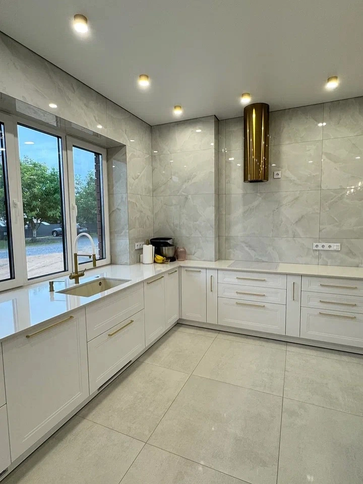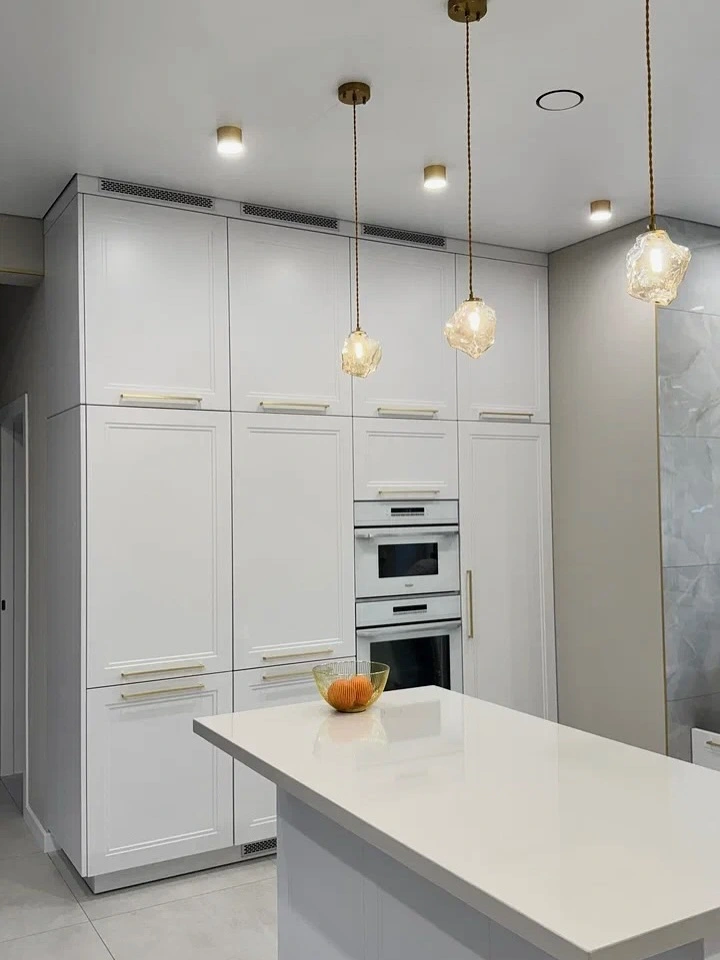 Элегантная угловая кухня в белом цвете с золотыми акцентами. Фасады из МДФ с фрезеровкой подчёркивают классический стиль, а искусственный камень на столешнице добавляет практичности и современного шарма. Золотая фурнитура и вытяжка создают изысканный акцент, делая интерьер более утончённым. Компактная, но вместительная угловая планировка делает кухню максимально удобной для ежедневного использования.