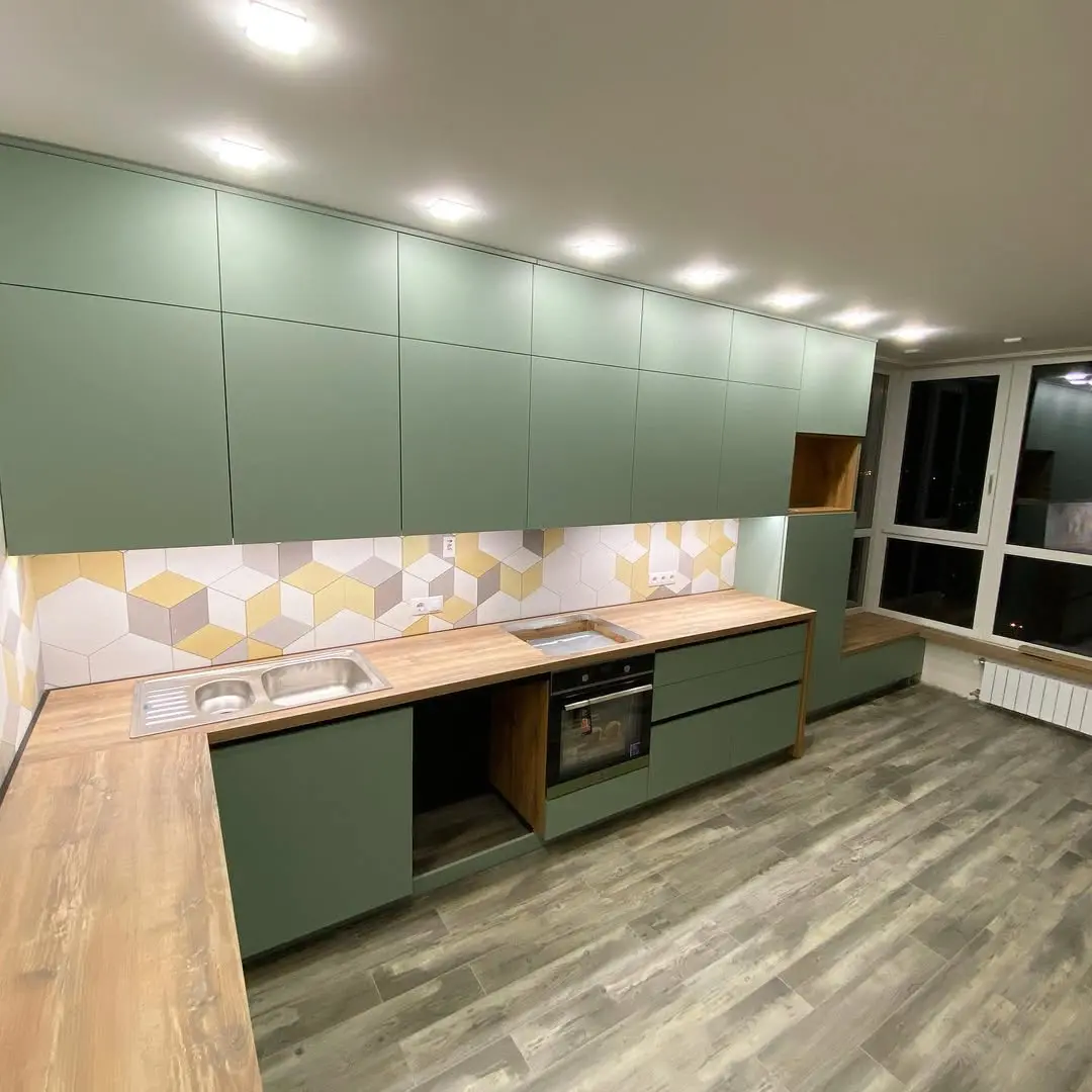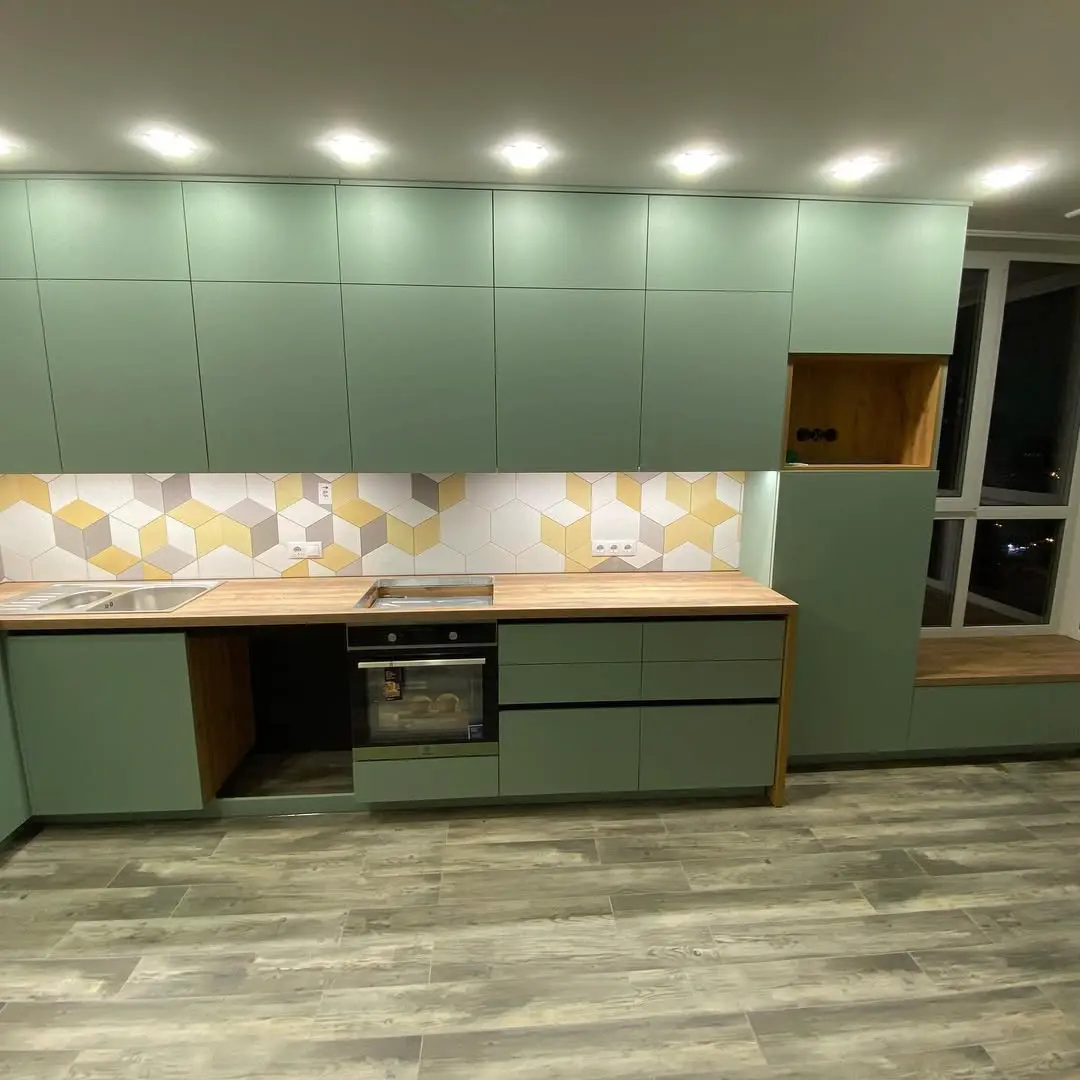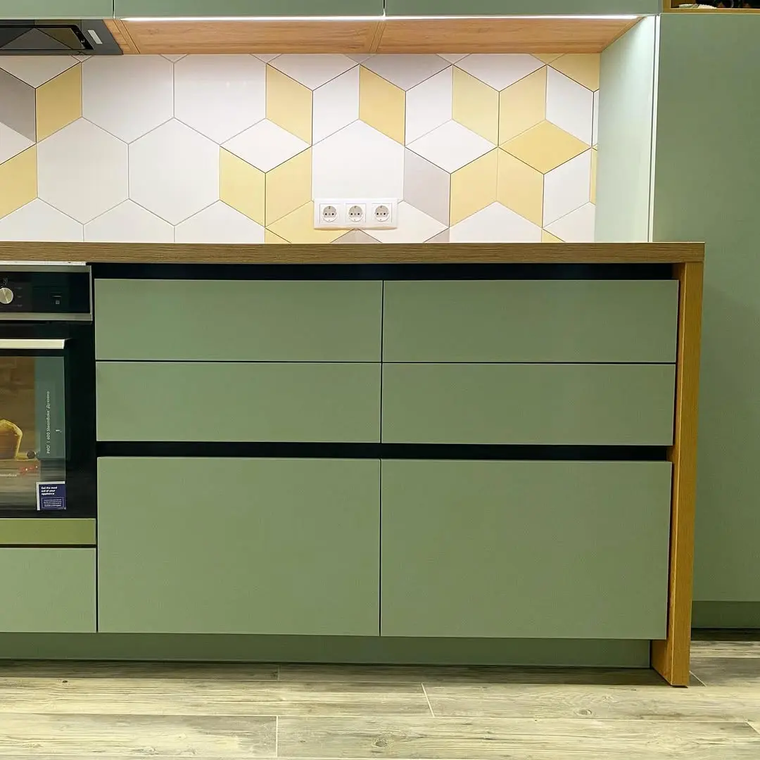 Кухня «Лайм» — это свежесть и гармония в каждом элементе. Спокойный зелёный цвет фасадов создаёт атмосферу уюта и умиротворения, а деревянная столешница добавляет тепла и естественности. Геометрический фартук с мягкими акцентами жёлтого и серого оживляет интерьер и делает его более динамичным. Отличное решение для тех, кто ценит стиль, комфорт и функциональность.
