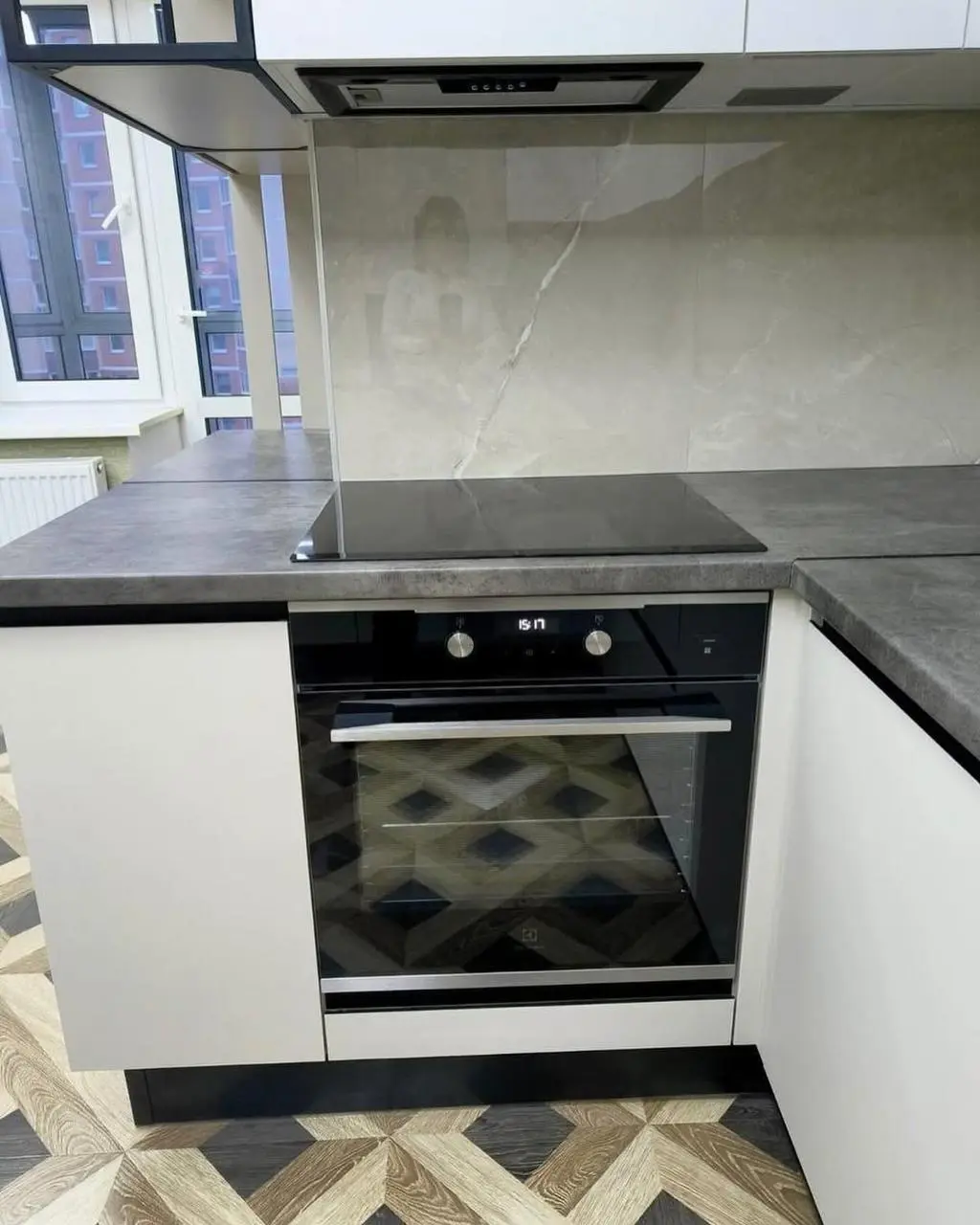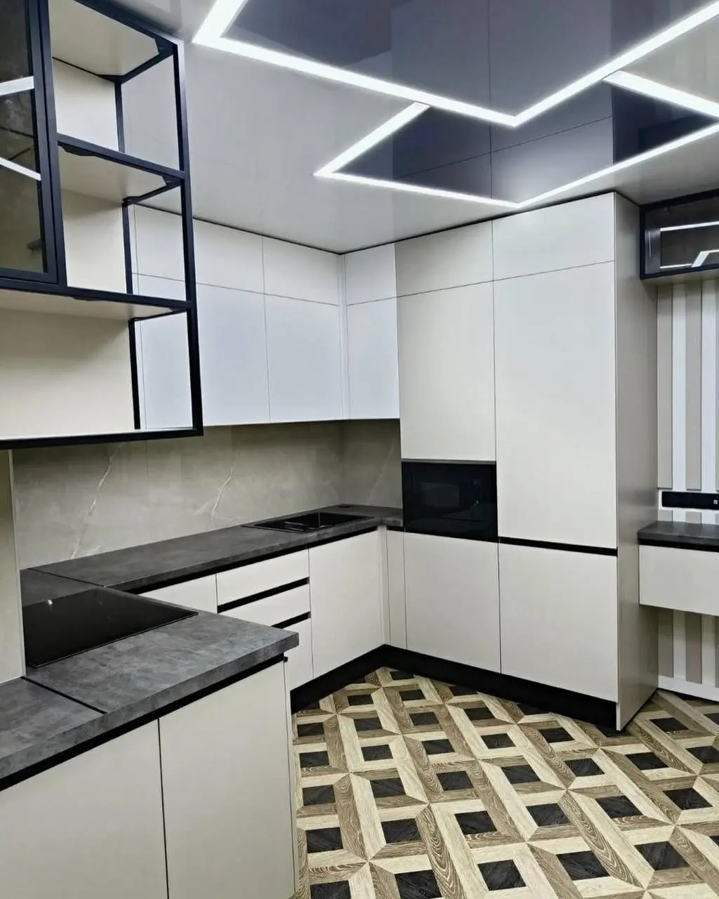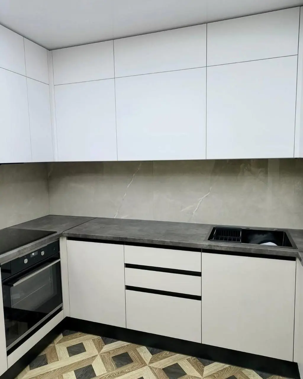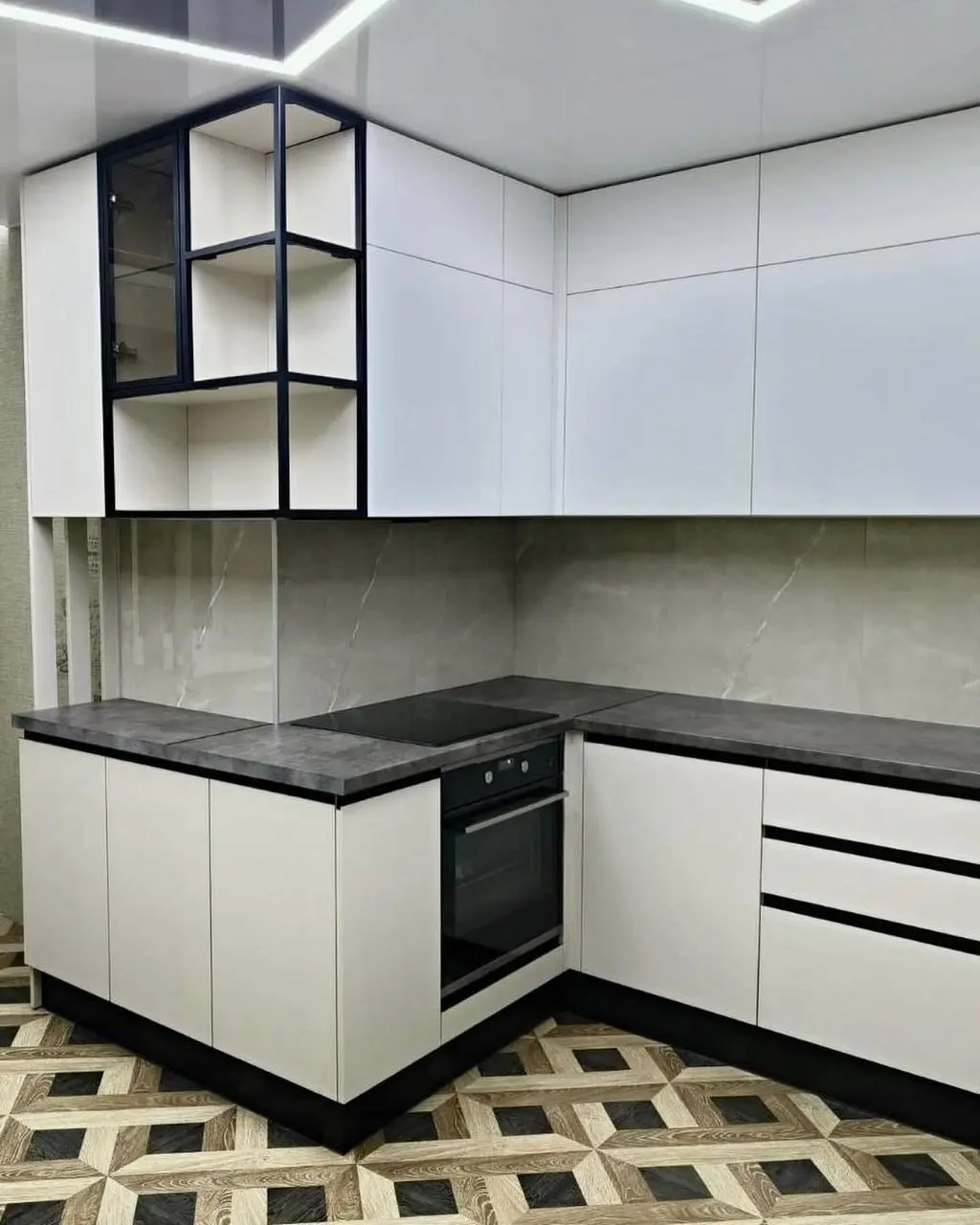 Современная угловая кухня Лайтстоун выполнена в светло-бежевых тонах с контрастными чёрными элементами. Графитовая столешница и фартук под камень создают стильный акцент, а светодиодное освещение подчёркивает геометрию пространства. Лаконичные линии, эргономичное размещение техники и продуманная функциональность делают эту кухню удобной и выразительной.