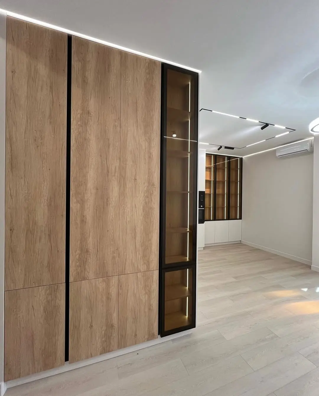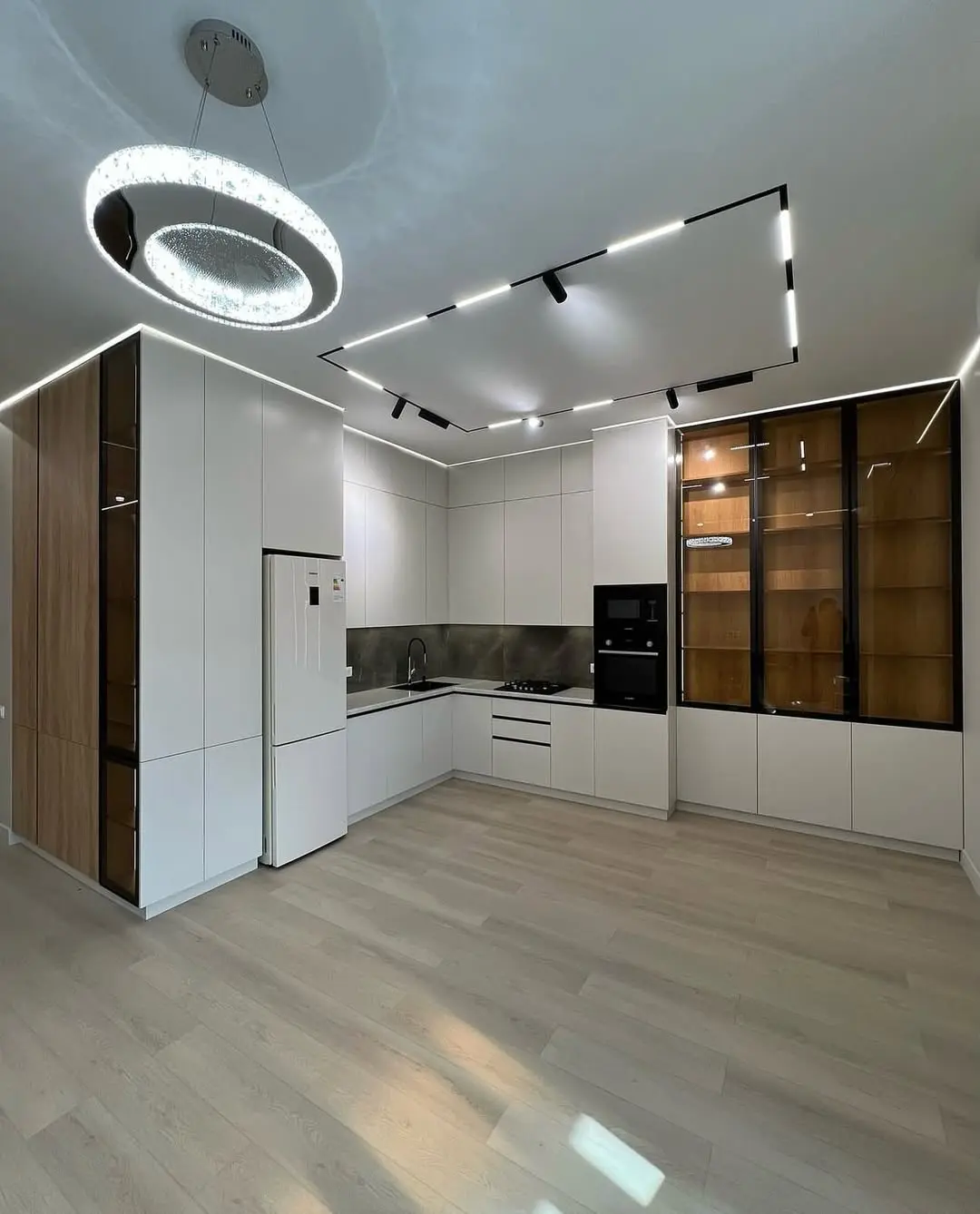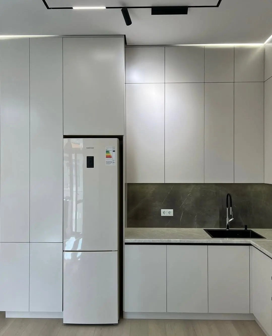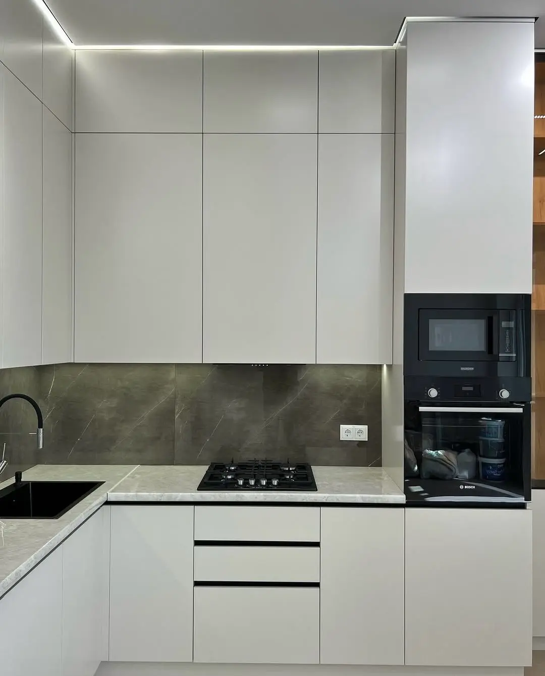 Кухня Линеа выполнена в стиле минимализм с акцентом на простоту форм и высокую функциональность. Белые матовые фасады из крашеного МДФ создают ощущение чистоты и пространства, а вставки под дерево добавляют тепла и уюта. Встроенная техника гармонично вписывается в композицию, а высокий модуль с витриной и подсветкой придаёт кухне изысканность. Практичная столешница из кварцевого агломерата и надёжная фурнитура Hafele обеспечивают долговечность и комфорт в ежедневном использовании.
