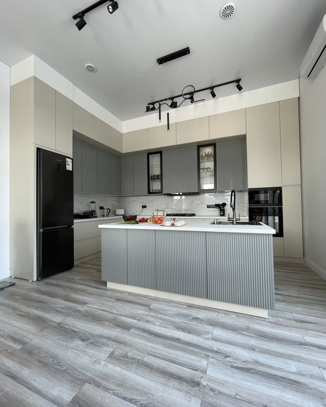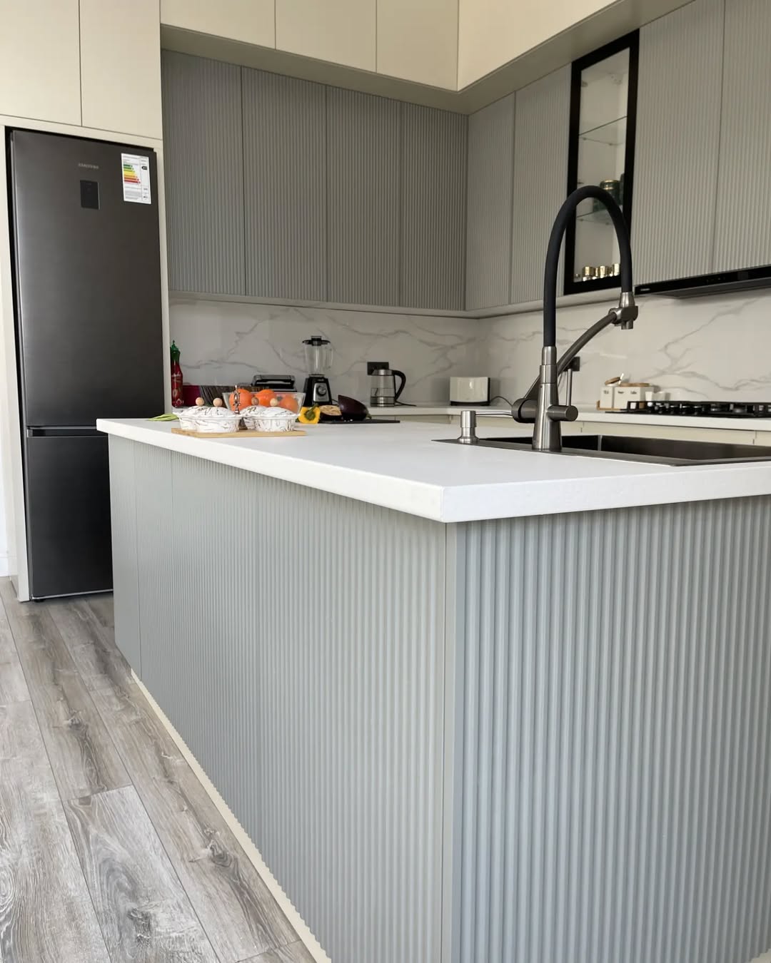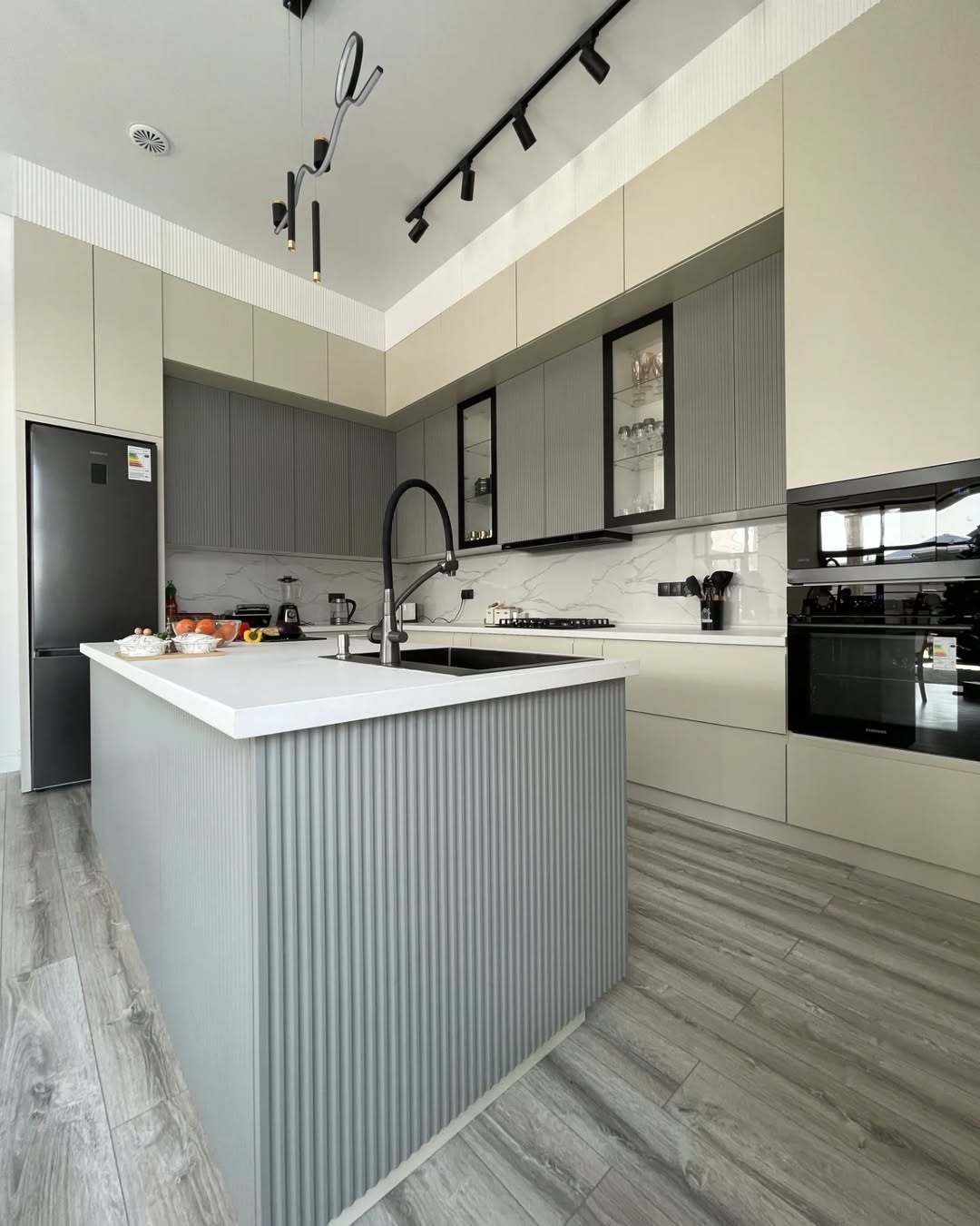 Кухня Лорена в современном стиле сочетает в себе сдержанную элегантность и функциональность. Комбинация бежевых и серых фасадов с рельефной текстурой придаёт интерьеру гармонию и глубину. Остров выполняет роль рабочей зоны и уютного места для быстрых завтраков. Белая кварцевая столешница и мраморный фартук подчёркивают современную эстетику, делая кухню удобной и стильной.