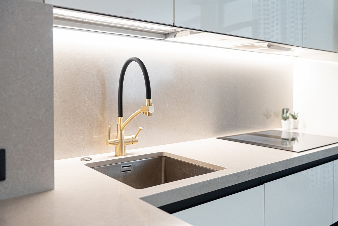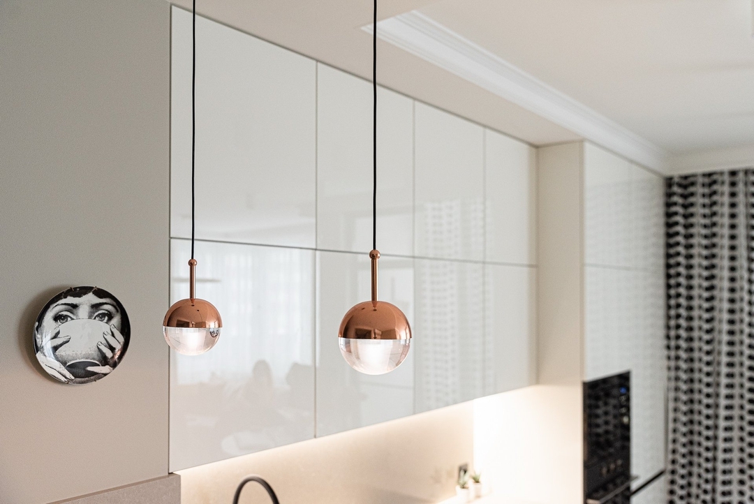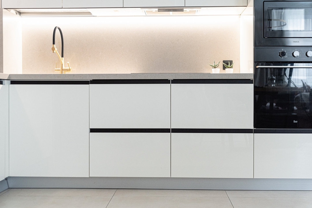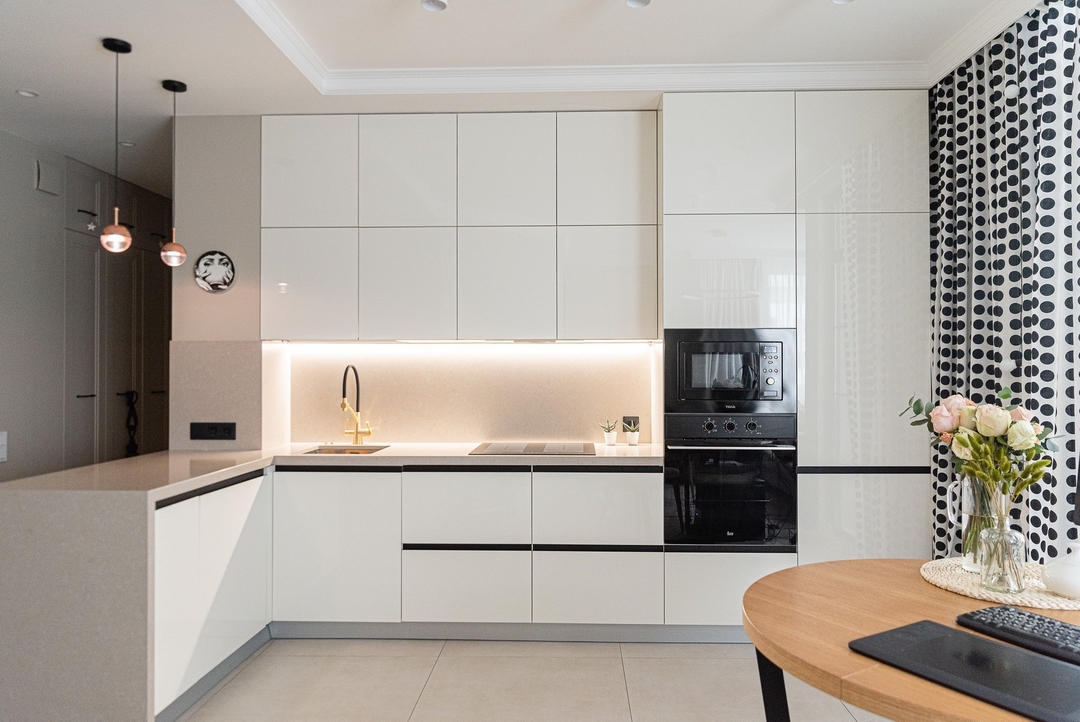 Элегантная кухня в современном стиле с сияющими фасадами из МДФ в глянцевой пленке. Белый глянец и теплый беж создают атмосферу легкости и уюта, а черные акценты придают интерьеру выразительность. Удобная планировка позволяет рационально использовать пространство, а качественная фурнитура Blum гарантирует долговечность.