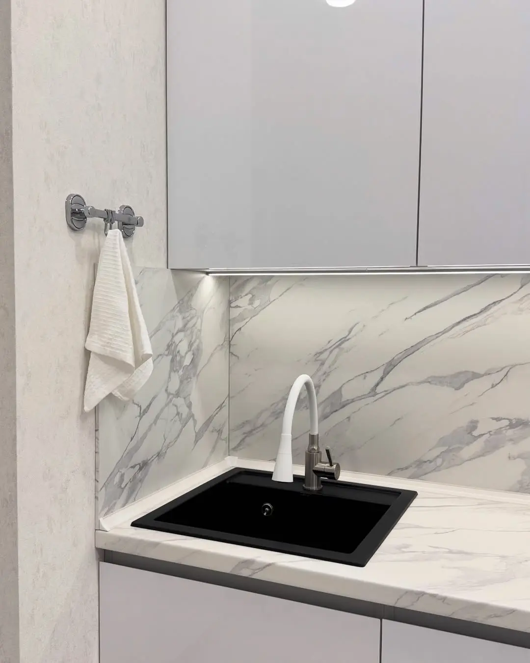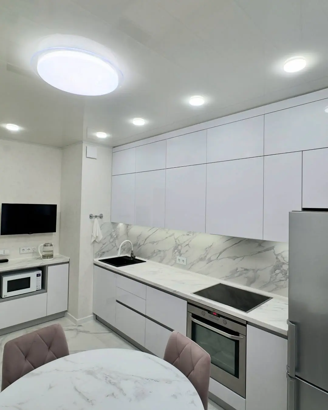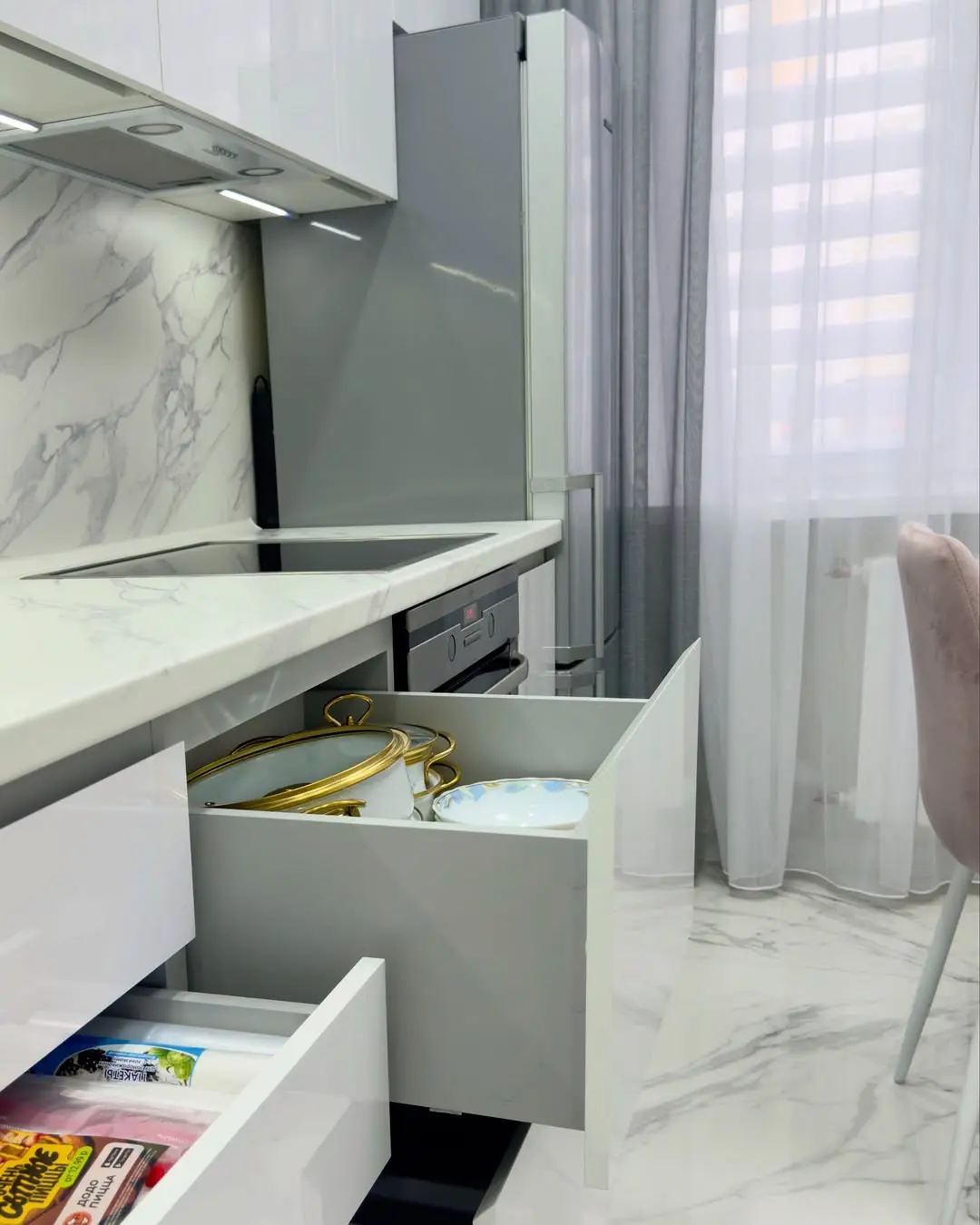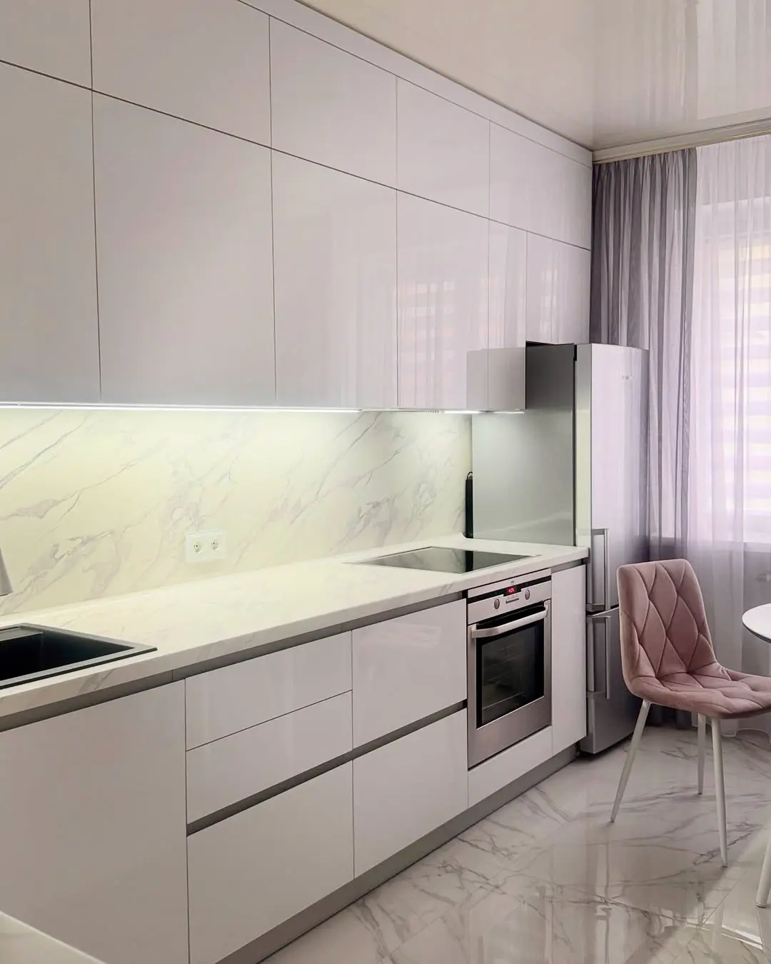 Современная прямая кухня в бело-серой гамме. Белые глянцевые фасады из МДФ и мраморная столешница из искусственного камня создают элегантный и стильный интерьер. Эргономичная планировка обеспечивает удобство готовки, а фурнитура Blum гарантирует надежность и долговечность. Идеальное решение для современных квартир.