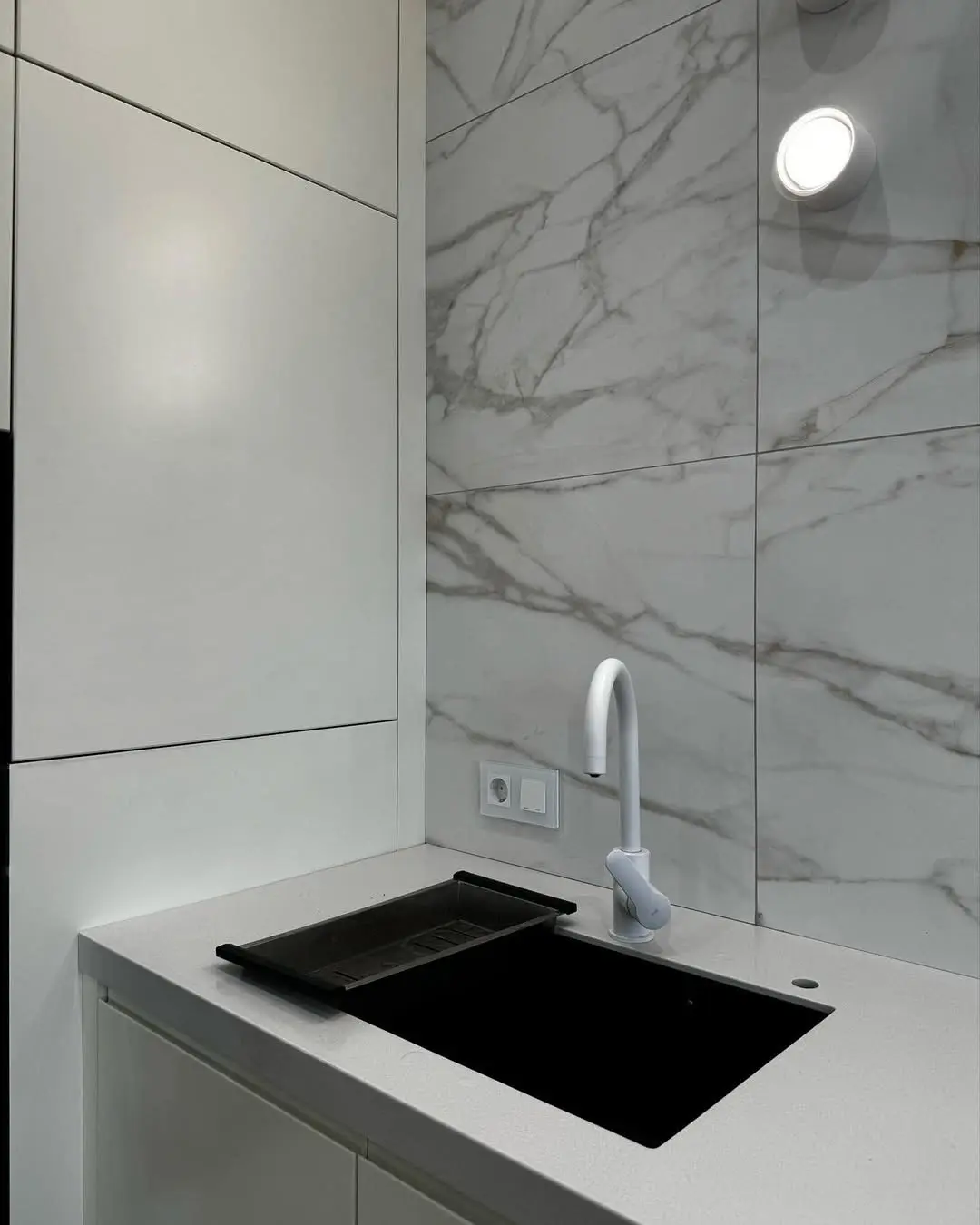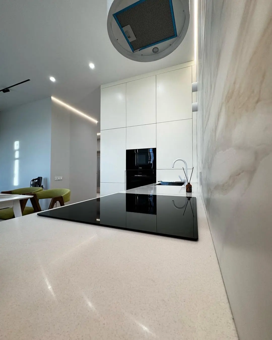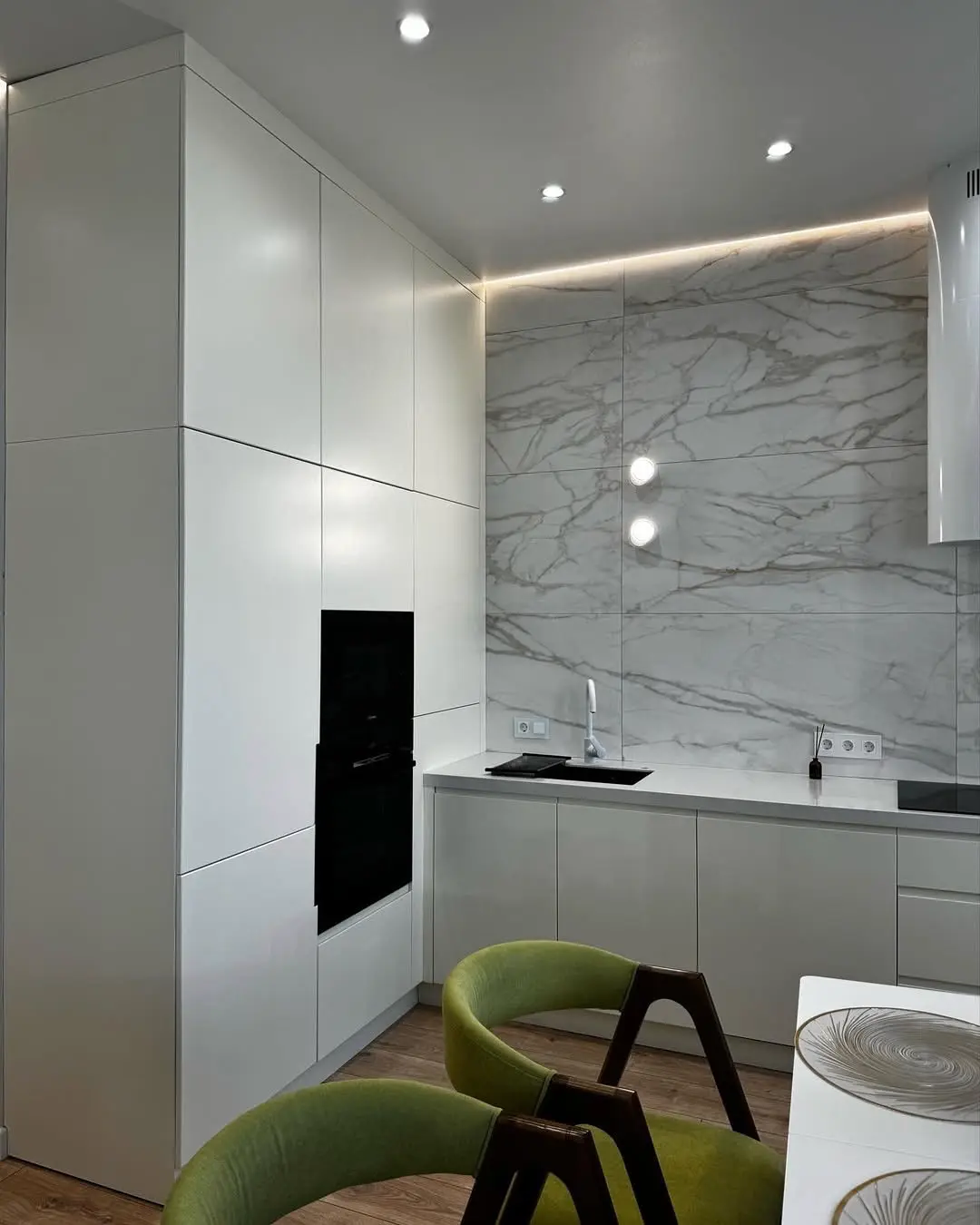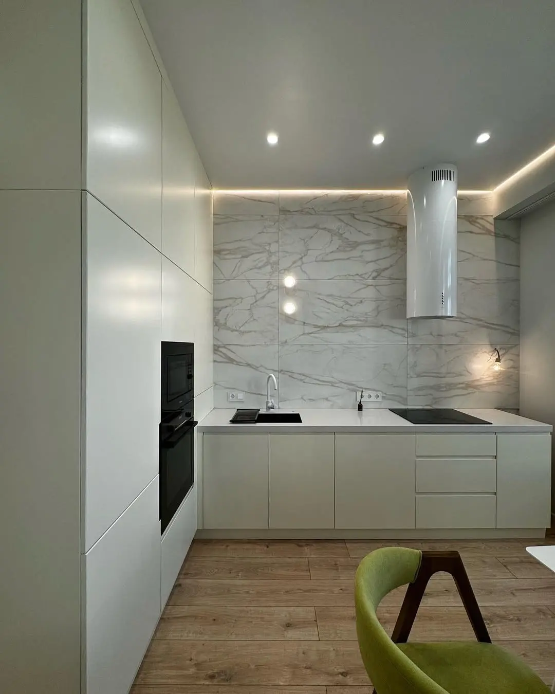 Кухня Мармора — лаконичное решение для современных интерьеров. Белые матовые фасады подчеркивают чистоту и минимализм, а мраморный фартук и столешница добавляют интерьеру изысканности. Угловая планировка делает кухню удобной и функциональной, обеспечивая грамотное распределение рабочих зон. Встроенная техника гармонично вписывается в дизайн, а фурнитура Blum гарантирует надёжность и комфорт при ежедневном использовании.