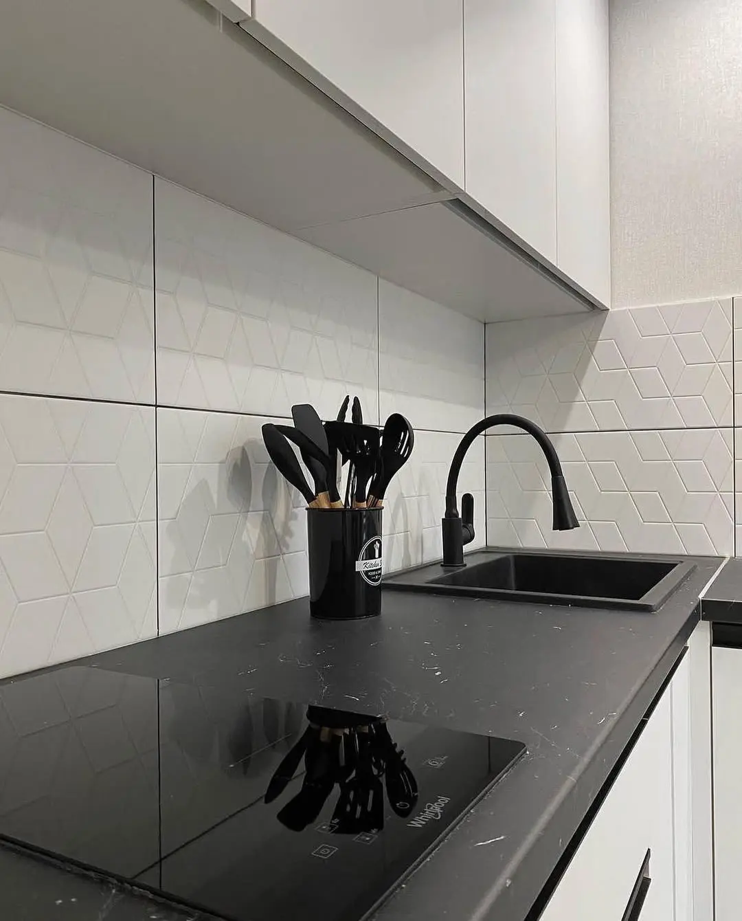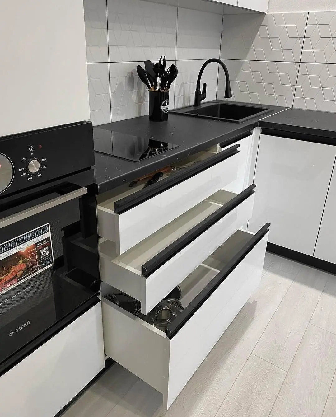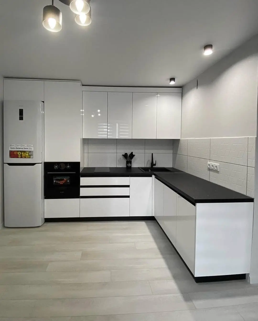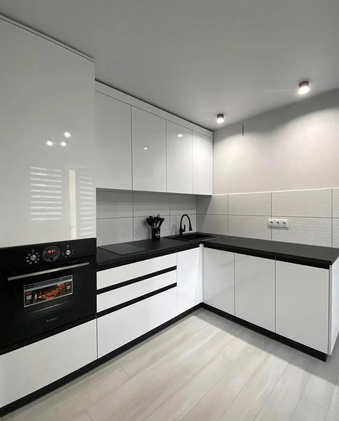 Кухня Модерн выполнена в стильном контрасте белых глянцевых фасадов и чёрной столешницы. Угловая планировка обеспечивает функциональность и рациональное использование пространства. Чёрная встроенная техника и фурнитура гармонично дополняют общий дизайн. Глянцевые фасады визуально расширяют помещение, делая его светлее и просторнее. Эта кухня станет удобным и современным решением для динамичной городской жизни.