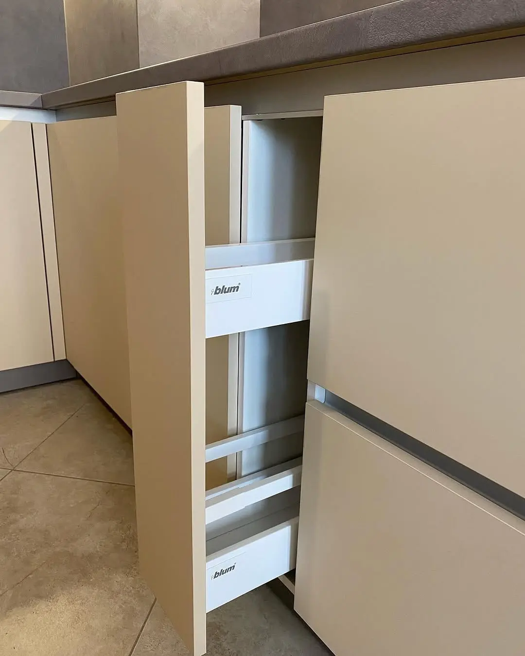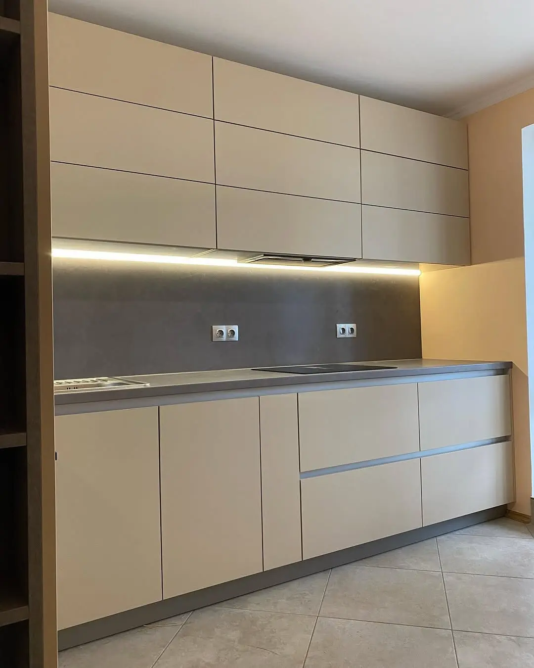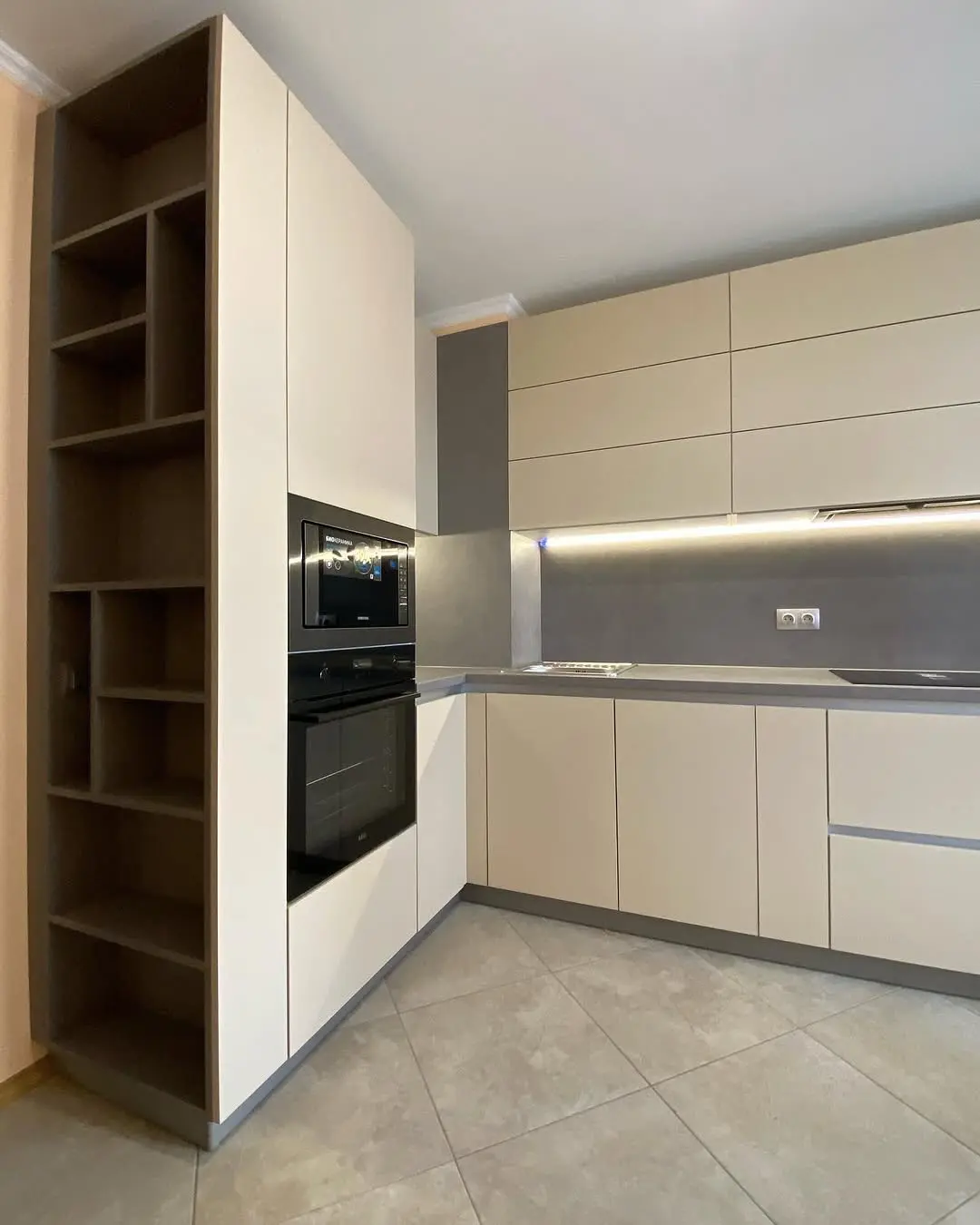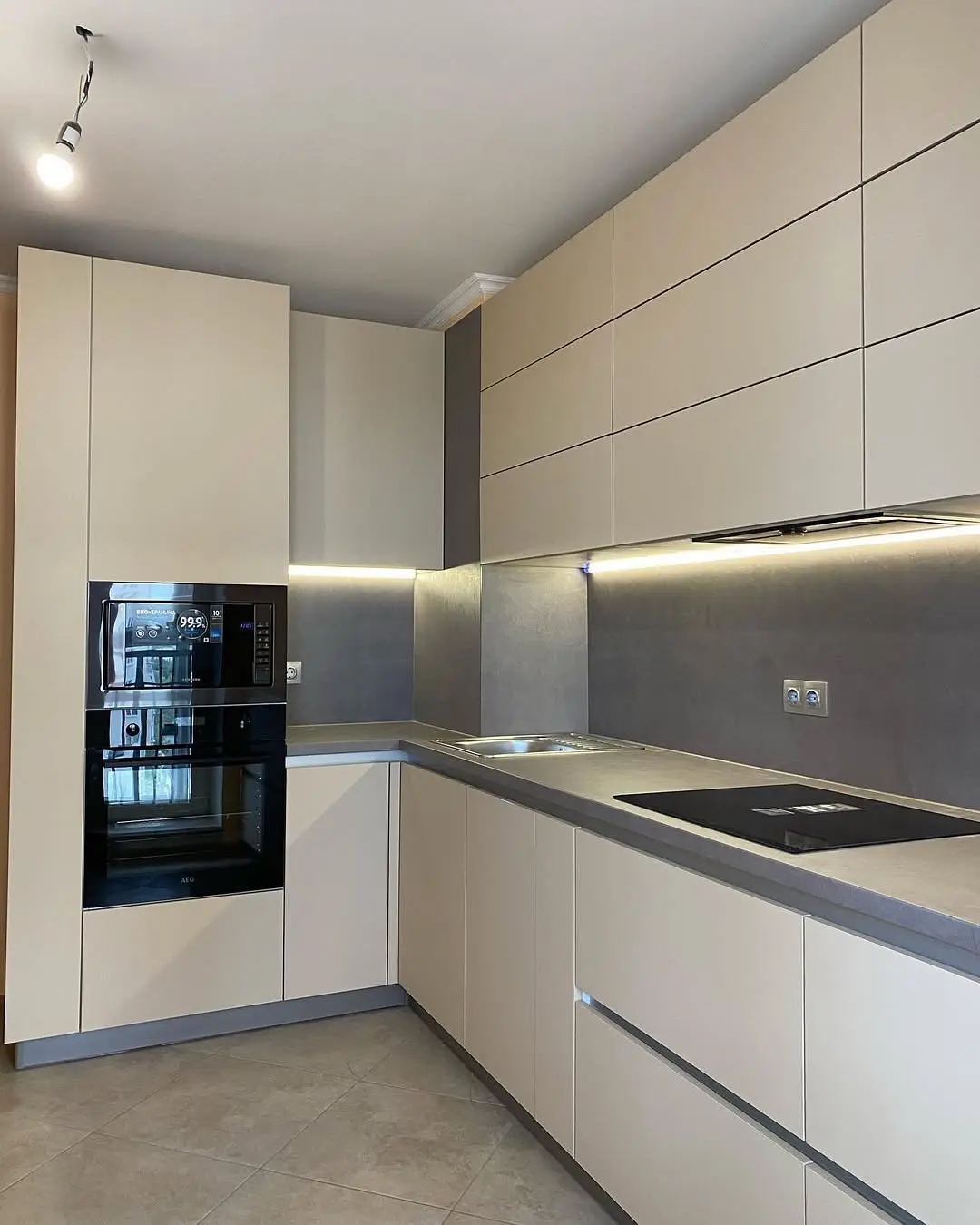 Современная угловая кухня в бежевых тонах с серыми акцентами. Матовые фасады из МДФ в пленке создают лаконичный и строгий дизайн. Серая столешница и фартук под бетон добавляют стилю минимализм и практичность. Отличный вариант для тех, кто ценит комфорт и современный вид.