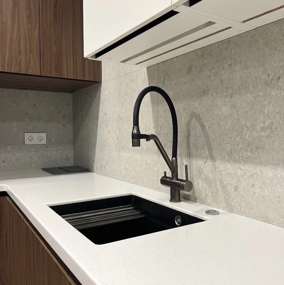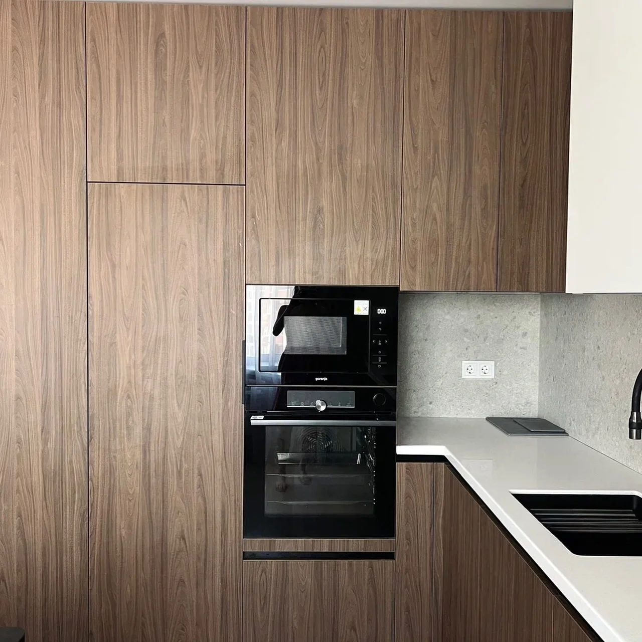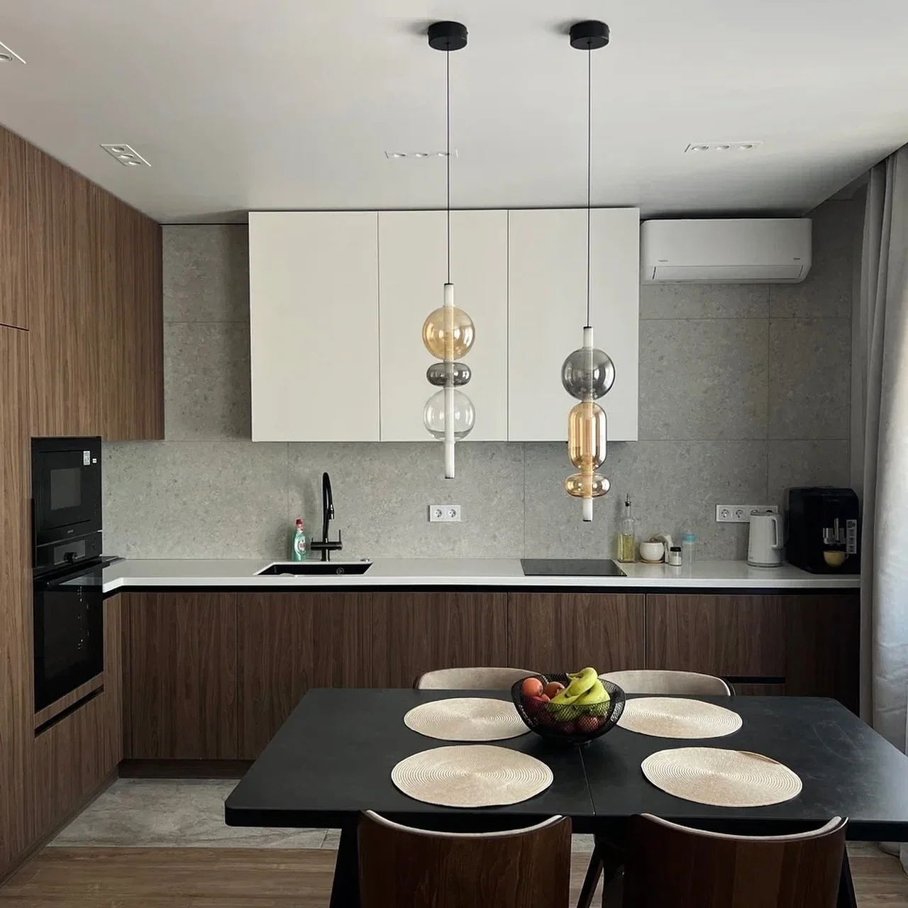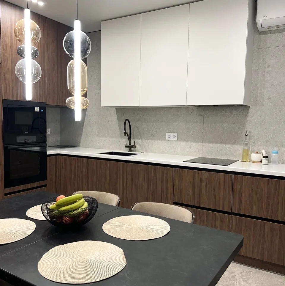 Элегантная угловая кухня в стиле модерн с сочетанием белых фасадов и древесной текстуры дуба. Такое комбинирование создаёт гармонию тепла и свежести в интерьере. Эргономичное расположение рабочих зон и встроенная техника обеспечивают комфортное использование. Подвесные светильники и современный обеденный стол с матовой поверхностью добавляют пространству изысканности и уюта.