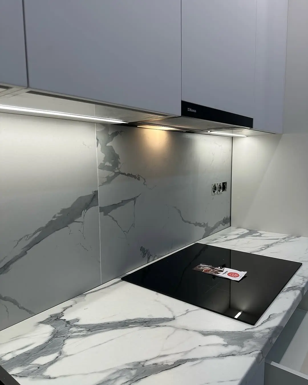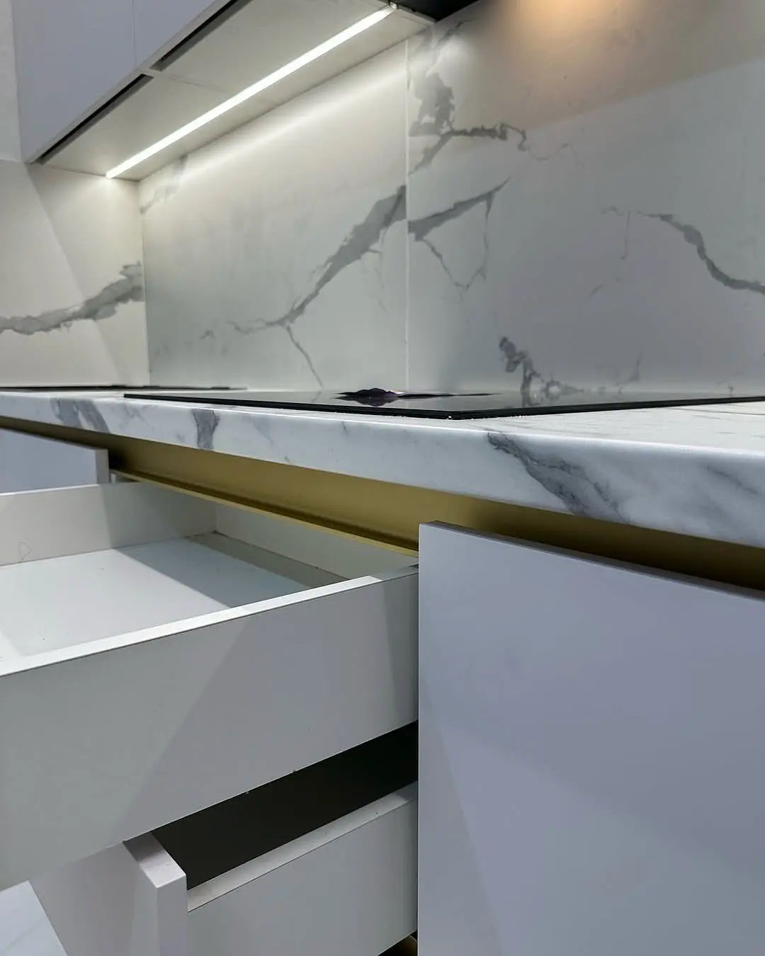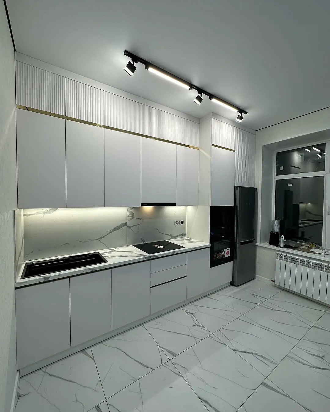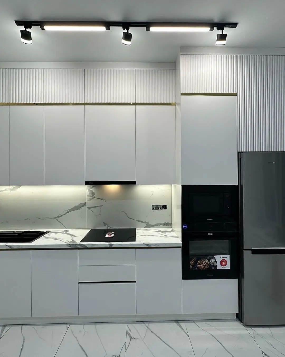 Кухня Моника — воплощение минимализма и лёгкости. Белые матовые фасады с тонкой декоративной рейкой и золотыми акцентами создают изысканный, но сдержанный образ. Мраморная столешница и фартук визуально объединяют пространство, делая интерьер светлым, воздушным и современным.
