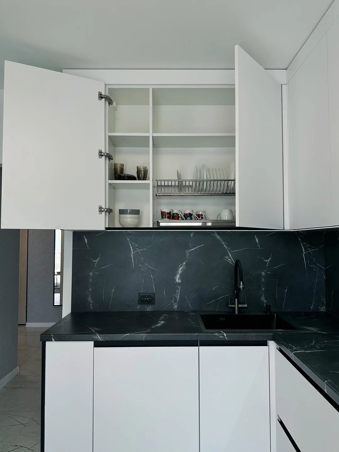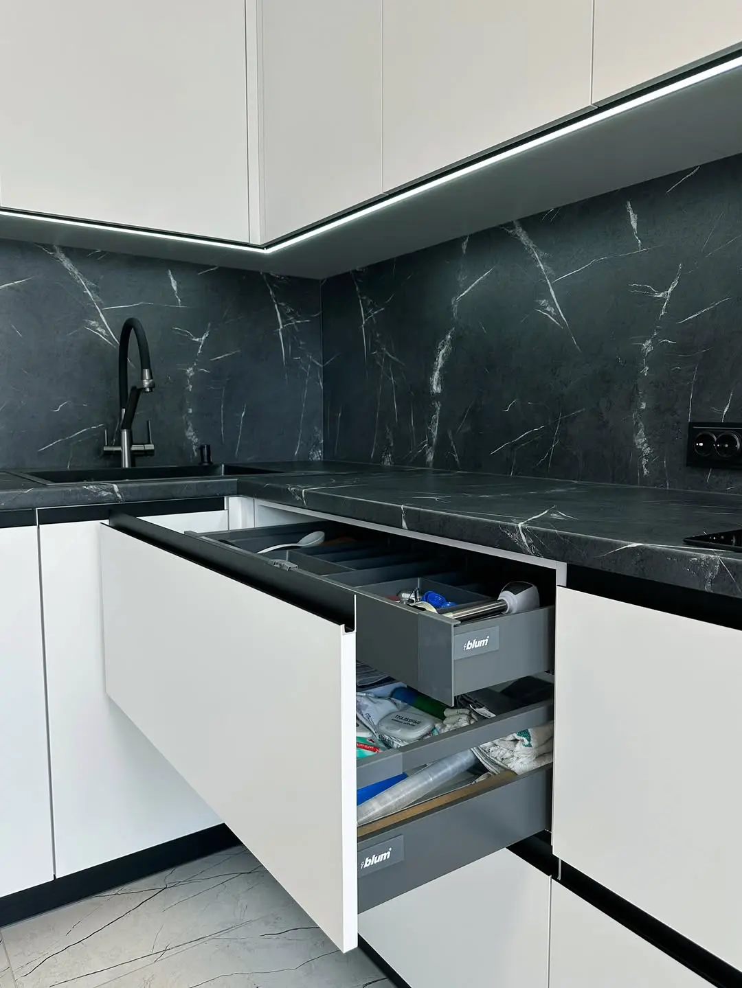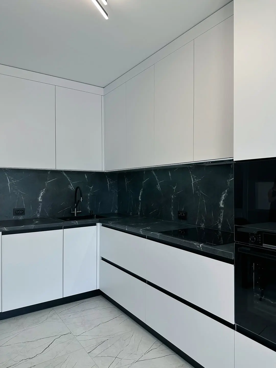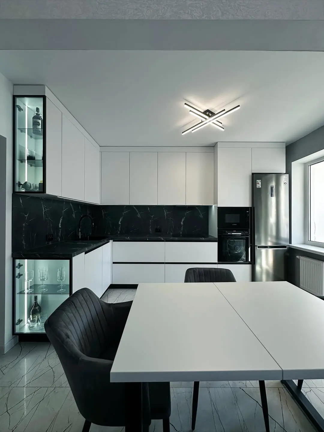 Угловая кухня в монохромной гамме сочетает белые матовые фасады и чёрный каменный фартук. Контрастная композиция выглядит стильно и элегантно, подчёркивая современный характер интерьера. Встроенные стеклянные витрины с подсветкой добавляют лёгкости и создают атмосферу уюта.