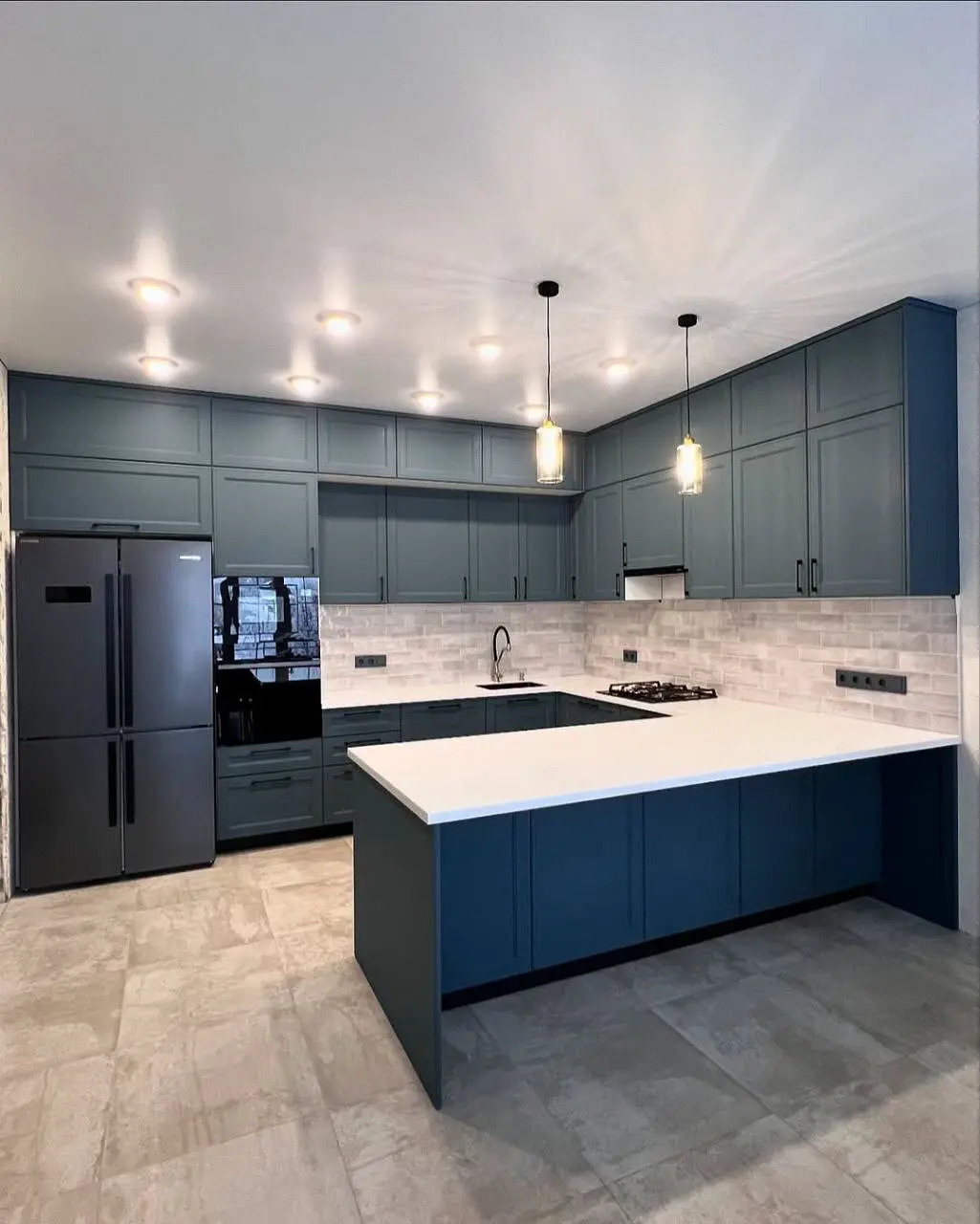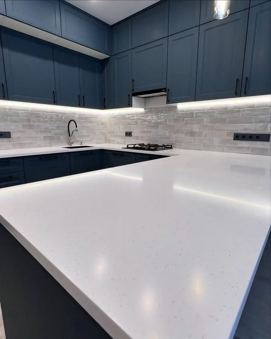 Кухня «Морелла» — современная П-образная модель в благородном тёмно-синем оттенке. Белоснежная столешница из искусственного камня создаёт чистый визуальный акцент, а матовые фасады подчёркивают элегантность дизайна. Эргономичная барная зона делает пространство функциональным и уютным, идеально подходящим для семейных ужинов и встреч с друзьями.