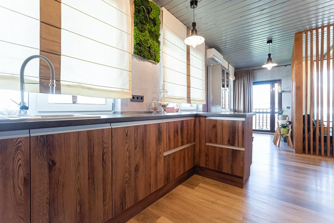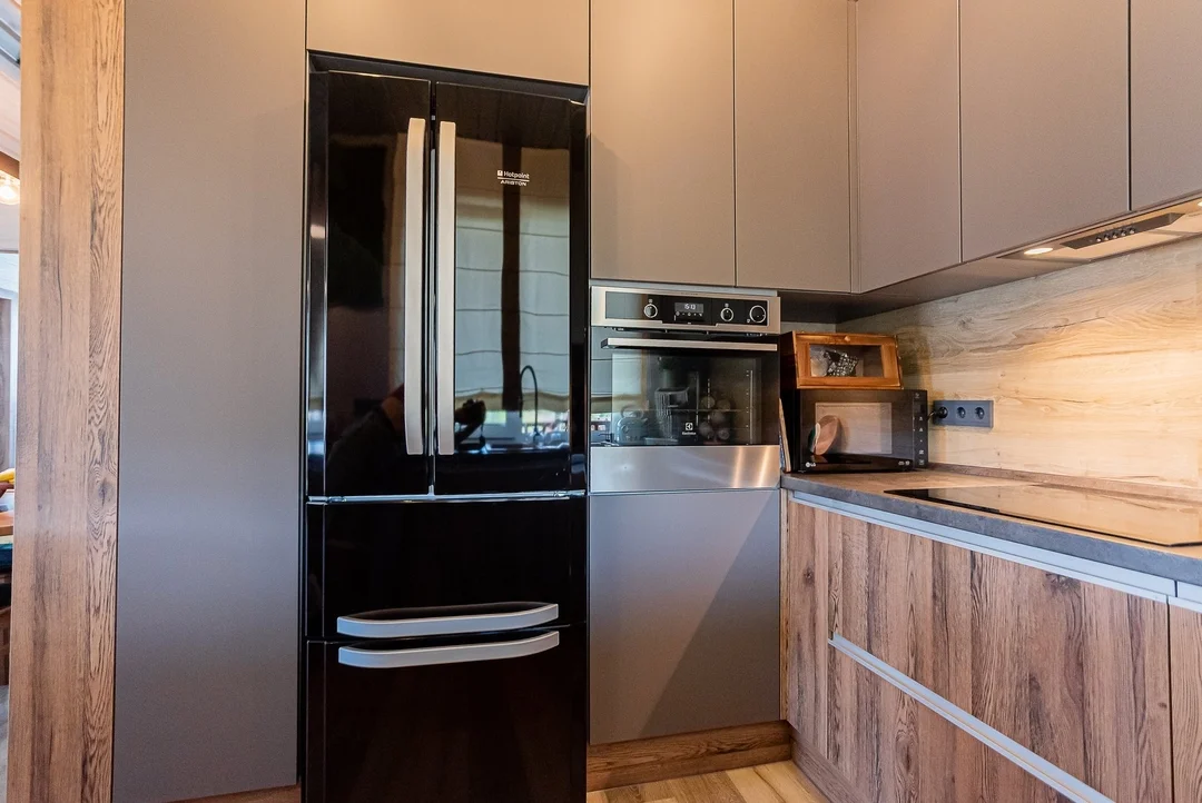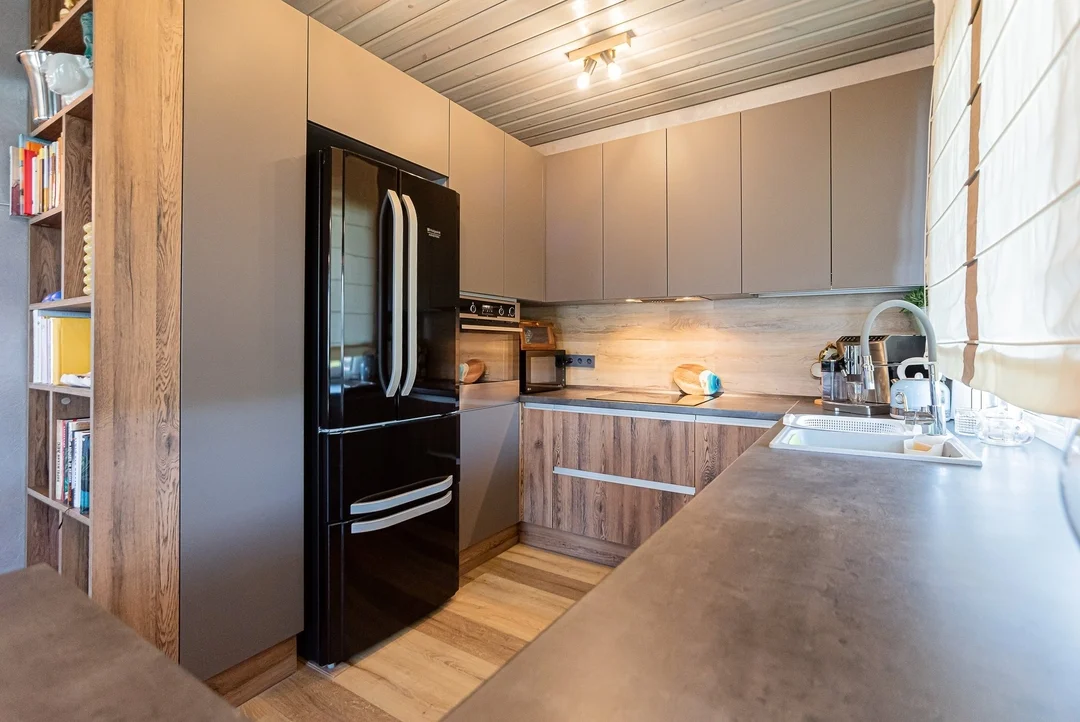 Кухня Natura Loft сочетает в себе современный дизайн и природные материалы. Лаконичные серые фасады гармонично смотрятся с деревянными вставками под дуб, создавая теплую атмосферу. Удобная рабочая зона у окна и вместительные шкафы обеспечивают функциональность. Черный холодильник и встроенная техника добавляют выразительности и стиля, а бетонная столешница придает кухне индустриальный характер. Такой интерьер станет идеальным решением для тех, кто ценит баланс урбанистики и уюта.