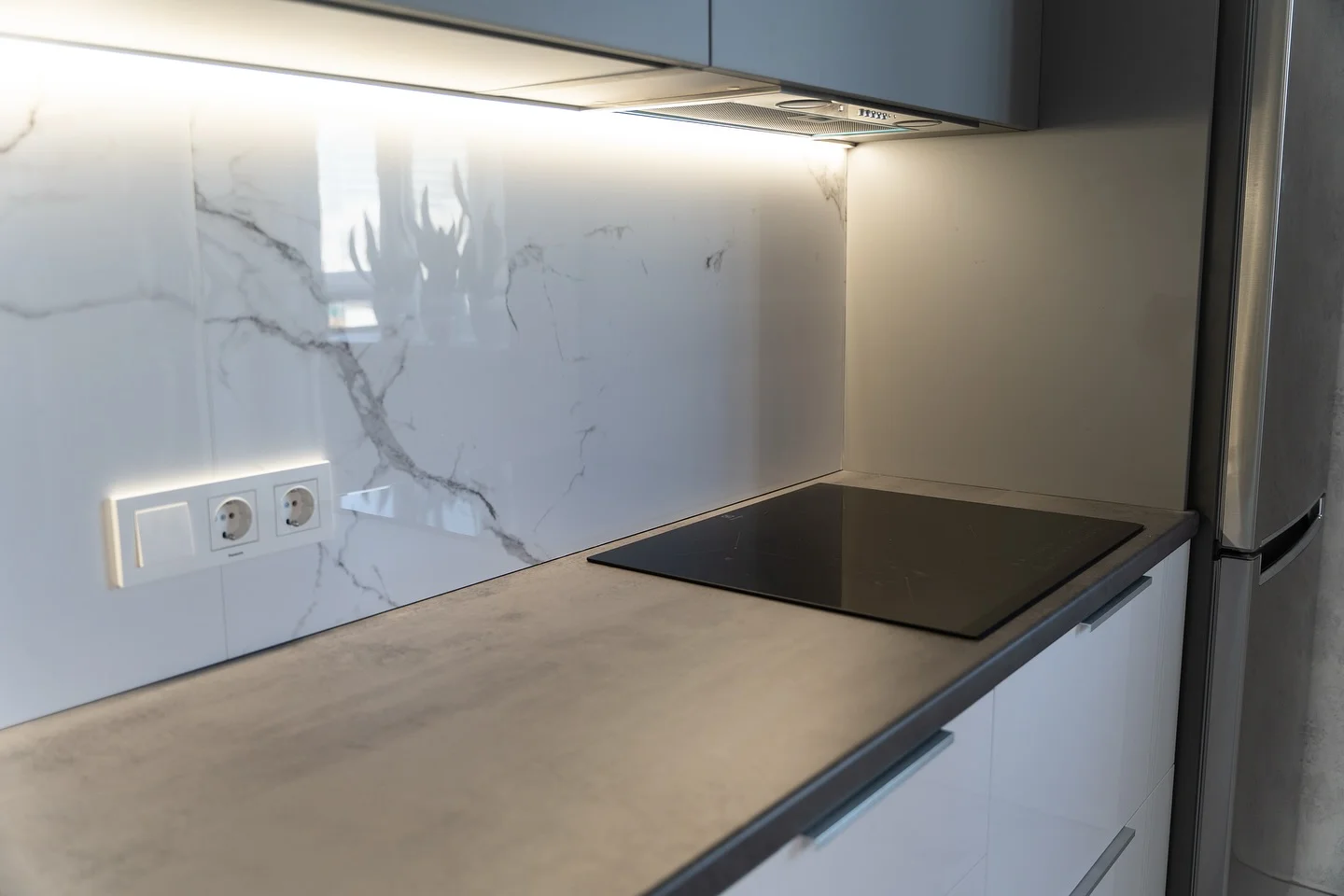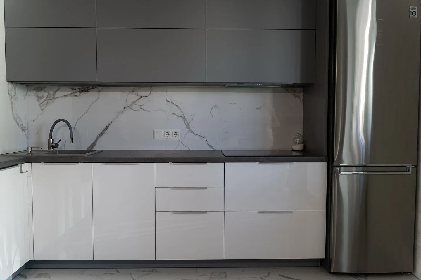 Стильная угловая кухня «Нео Мармо» сочетает глянцевые белые фасады нижних шкафов с матовыми серыми верхними. Столешница и фартук с мраморным рисунком создают гармоничный современный интерьер. Минималистичный дизайн без лишней фурнитуры и встроенная техника обеспечивают максимальную функциональность. Подходит для современных квартир с акцентом на комфорт и эстетику.