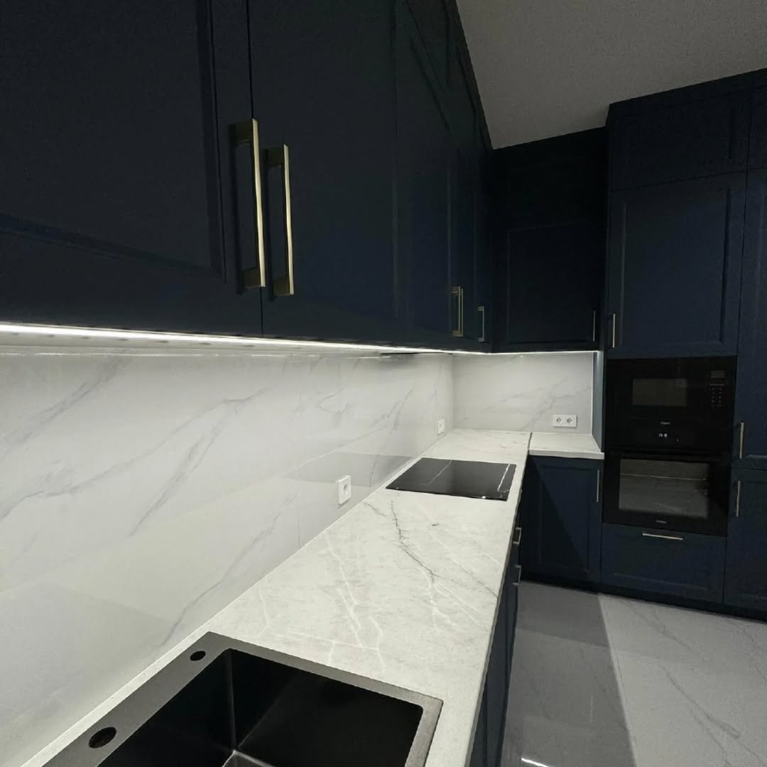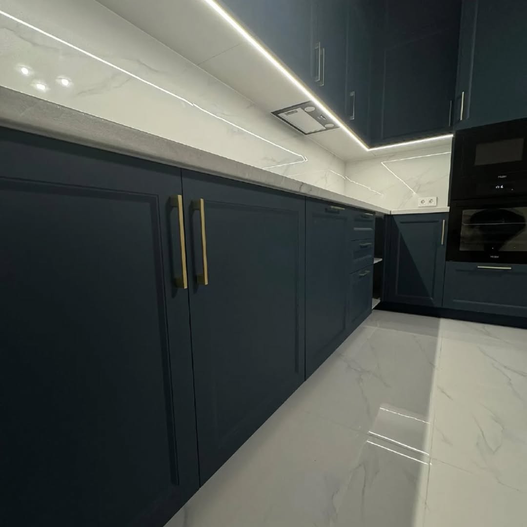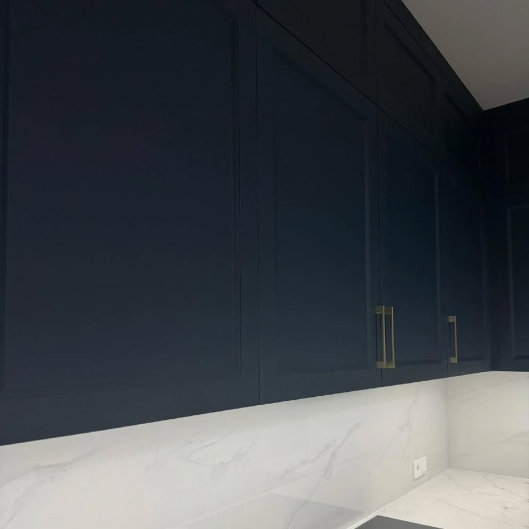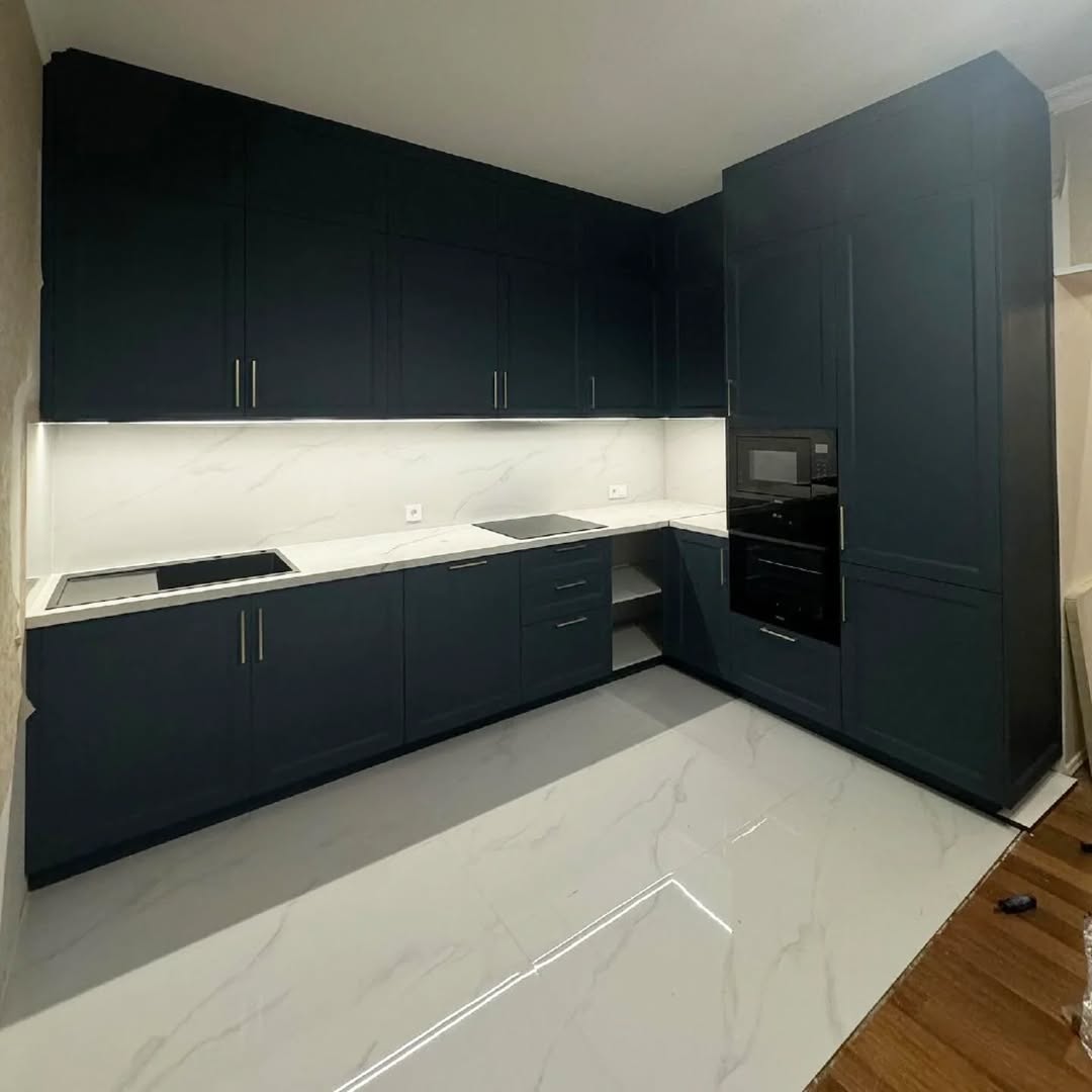 Эффектная угловая кухня в стиле неоклассика с графитовыми фасадами и белой мраморной столешницей. Матовые крашеные фасады с фрезеровкой подчеркивают изысканность интерьера, а светлый мраморный фартук добавляет контраста и гармонии. Удобное зонирование и вместительные шкафы делают кухню максимально функциональной и практичной.