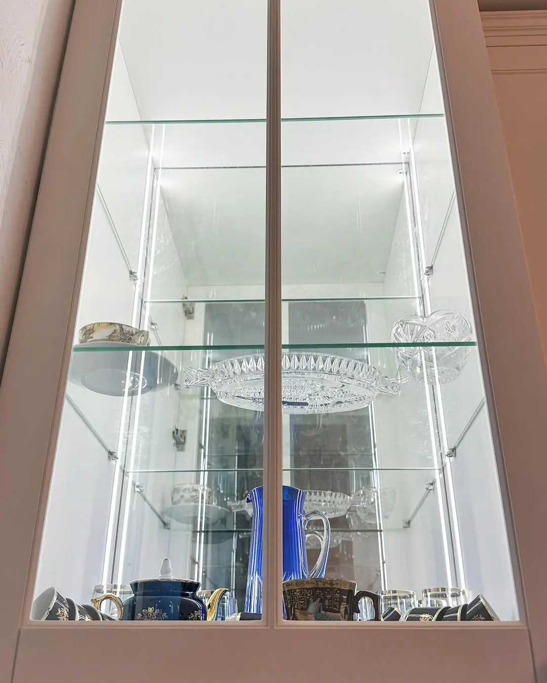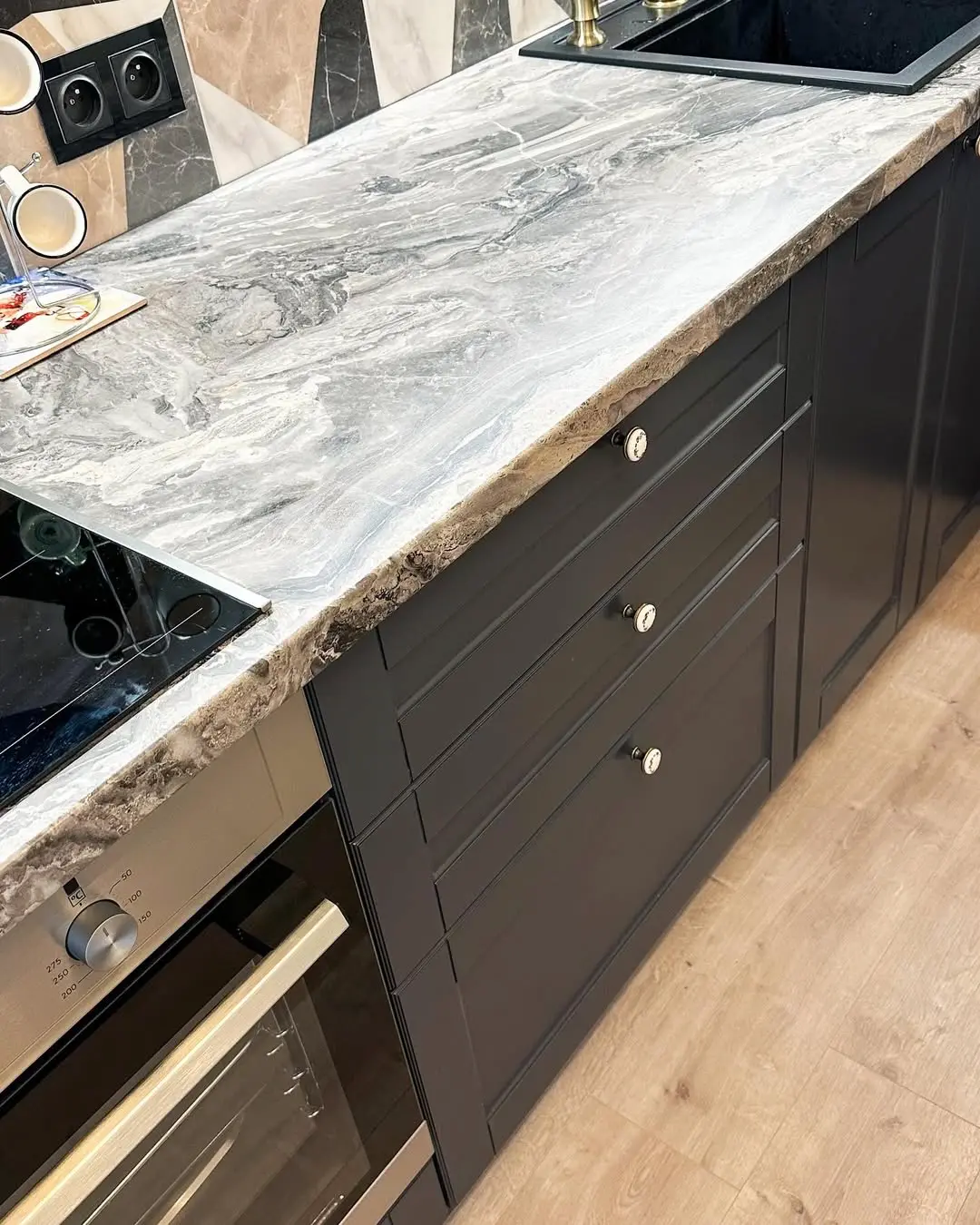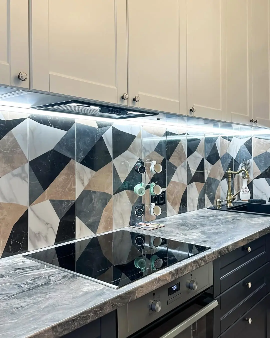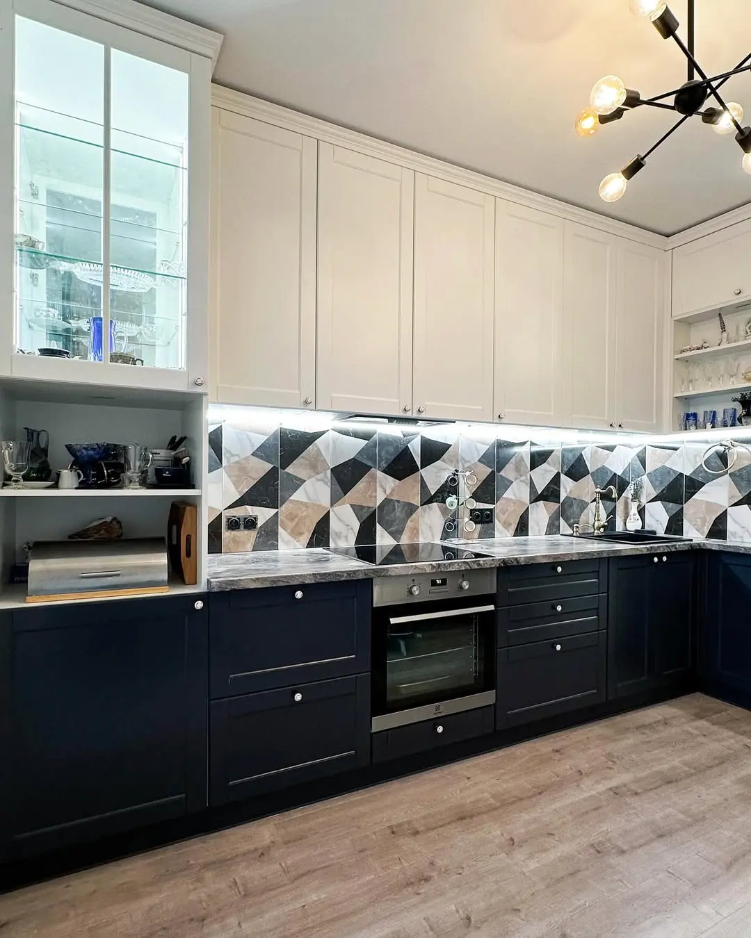 Кухня «Невада» сочетает в себе изысканность классики и выразительный современный контраст. Белые верхние фасады и глубокий синий низ создают эффект элегантной гармонии. Геометрическая плитка на фартуке добавляет динамики, а светлая каменная столешница подчёркивает утончённый стиль пространства.