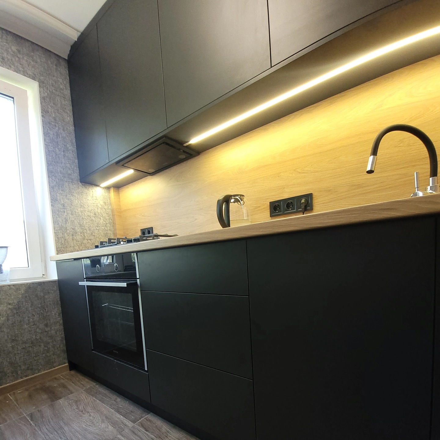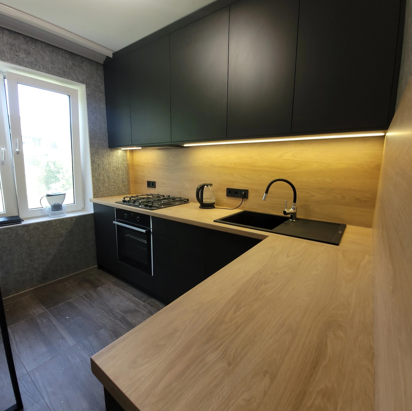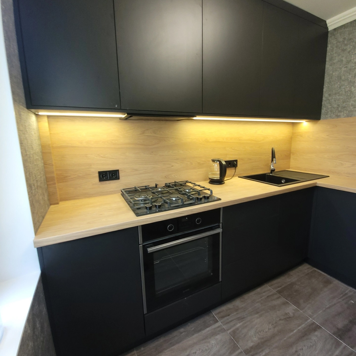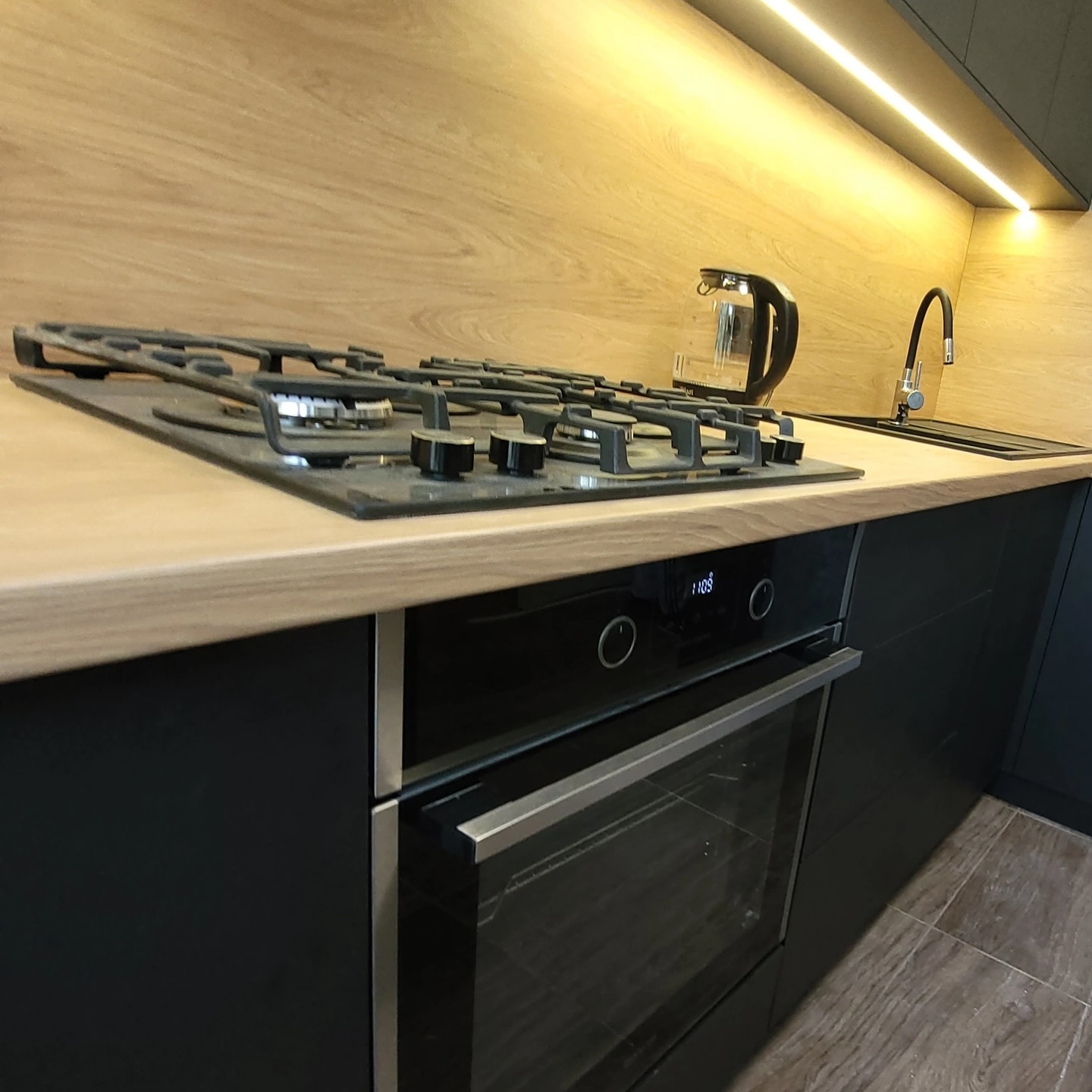Кухня Нейра — стильное сочетание глубины тёмных фасадов и природного тепла дерева. Матовые поверхности в графитовом оттенке подчёркнуты дубовыми элементами, создающими уютный контраст. Угловая планировка делает пространство эргономичным, а фурнитура Boyard обеспечивает долговечность и комфорт в повседневном использовании.