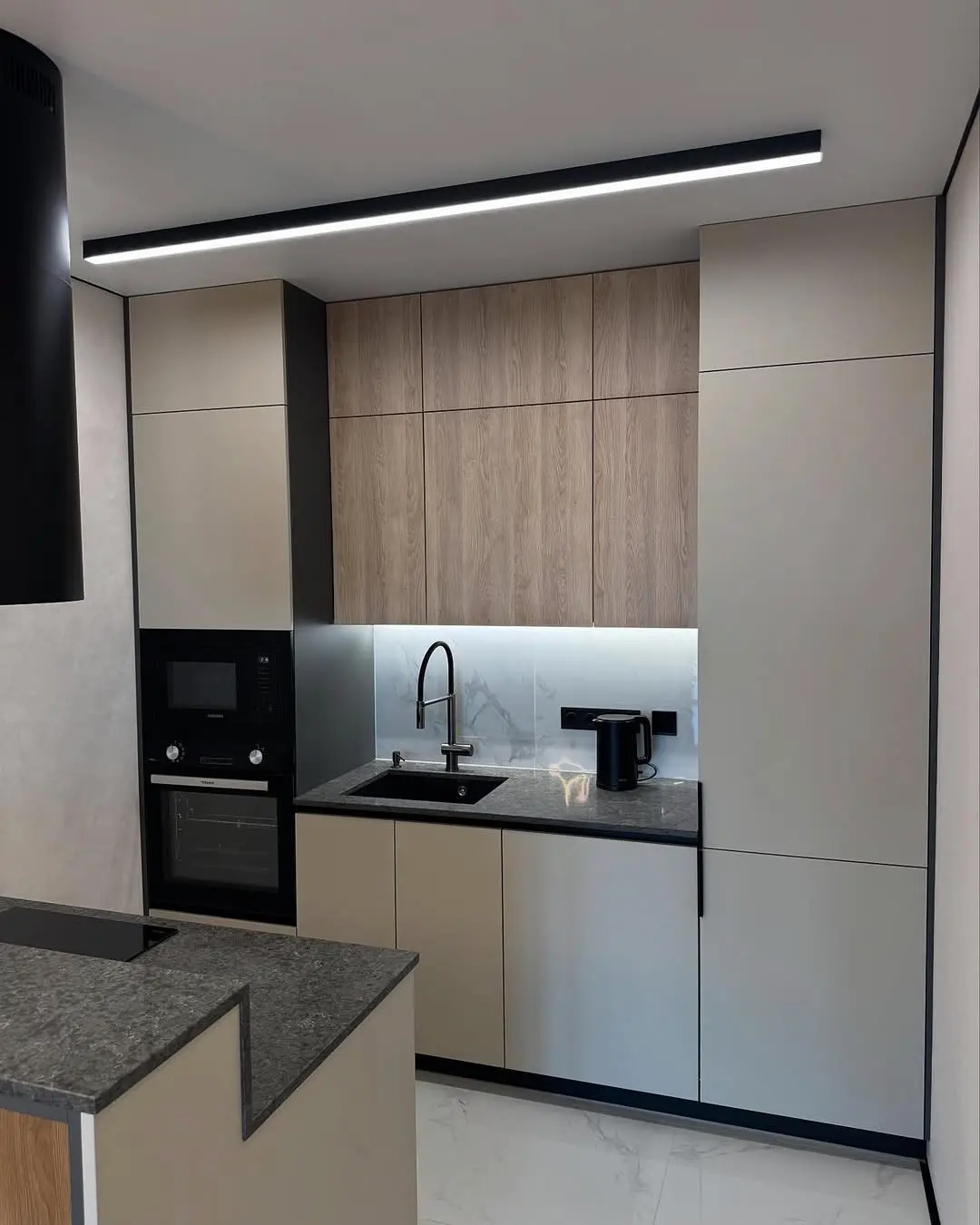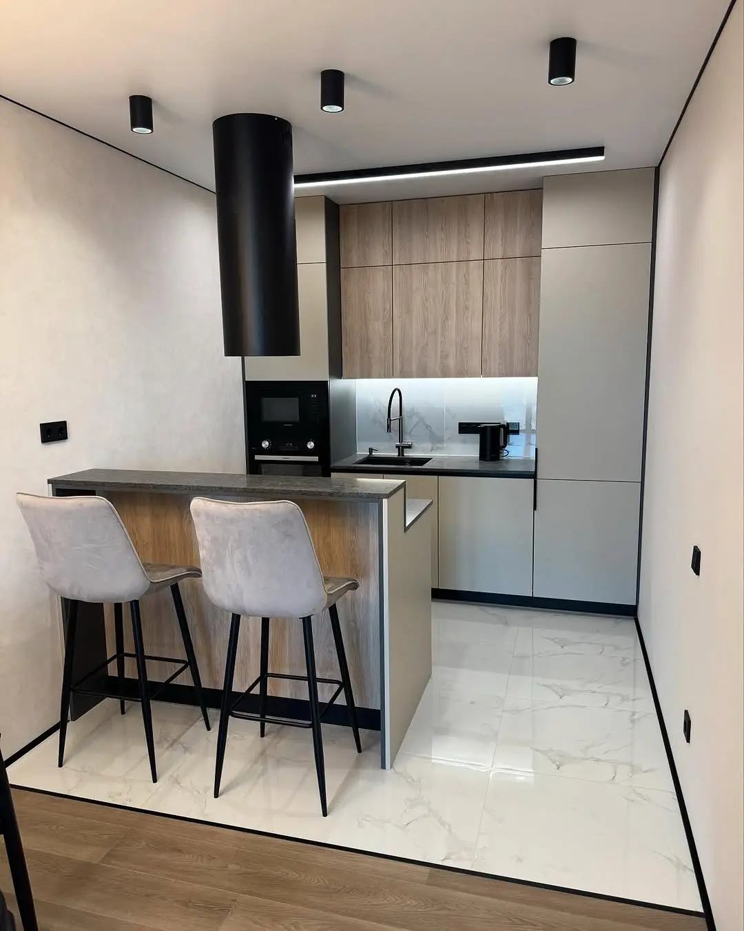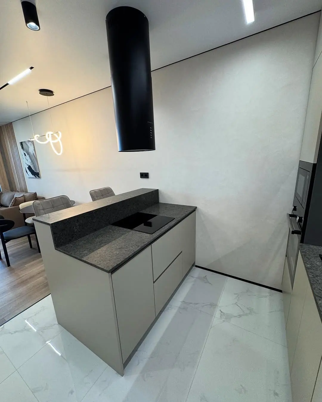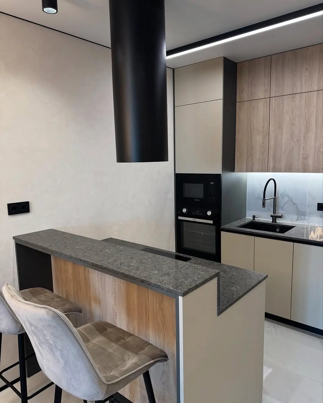 Кухня Норд — стильное сочетание минимализма и природных акцентов. Прямые фасады в матовом сером исполнении гармонично сочетаются с тёплой фактурой дерева. Барная стойка с удобными высокими стульями делает кухню центром общения и отдыха. Компактная планировка идеально подойдёт для квартиры или студии, сохраняя максимум функциональности. Кварцевая столешница отличается прочностью, а фурнитура Hettich обеспечивает долговечность и комфорт в использовании.