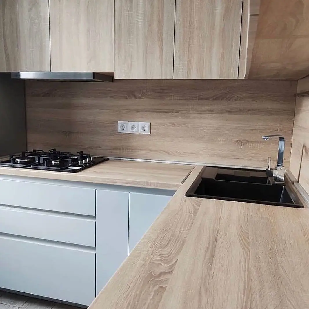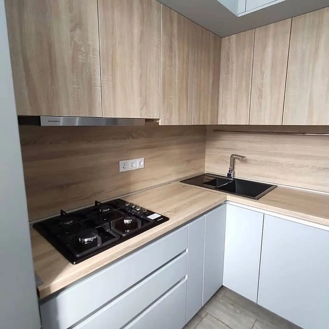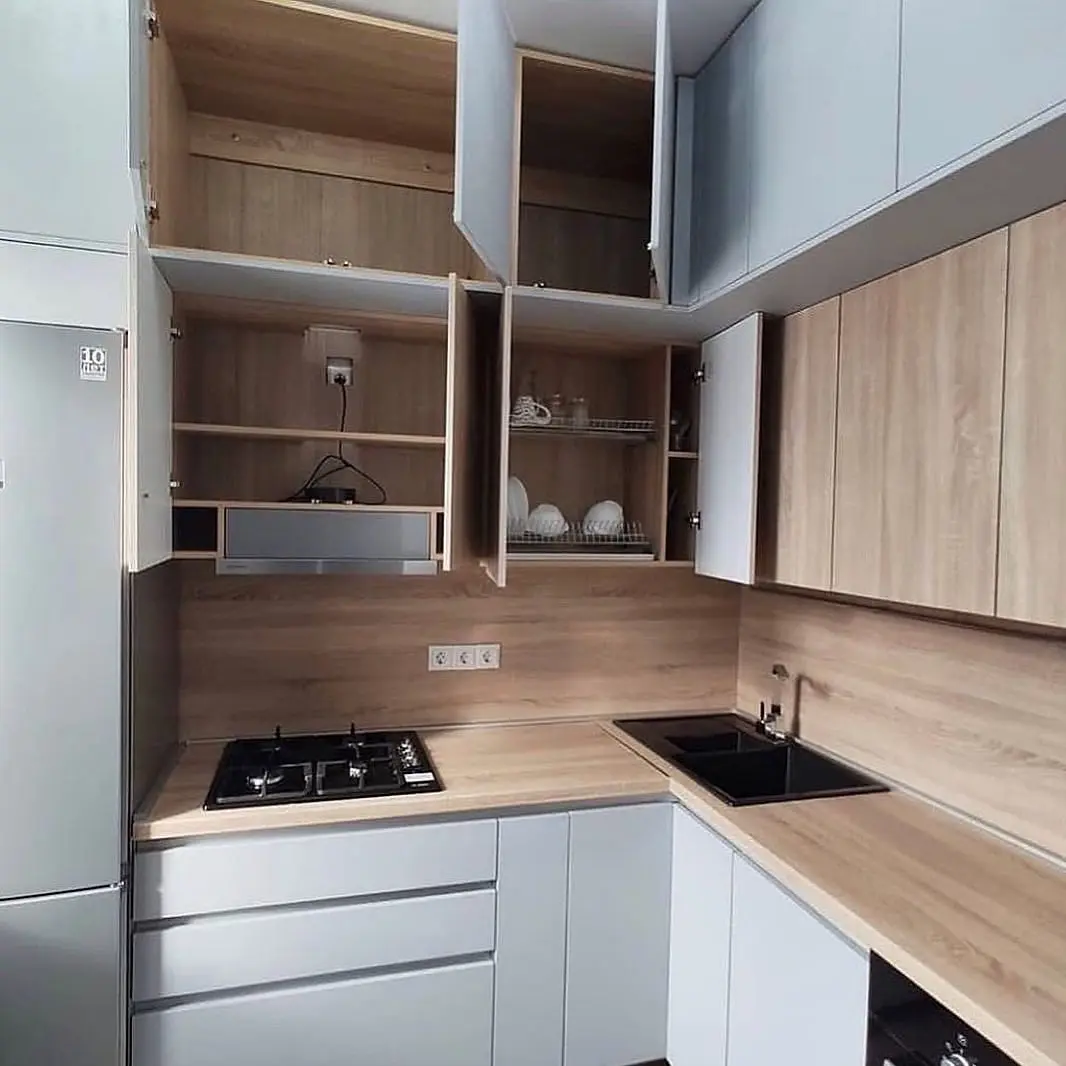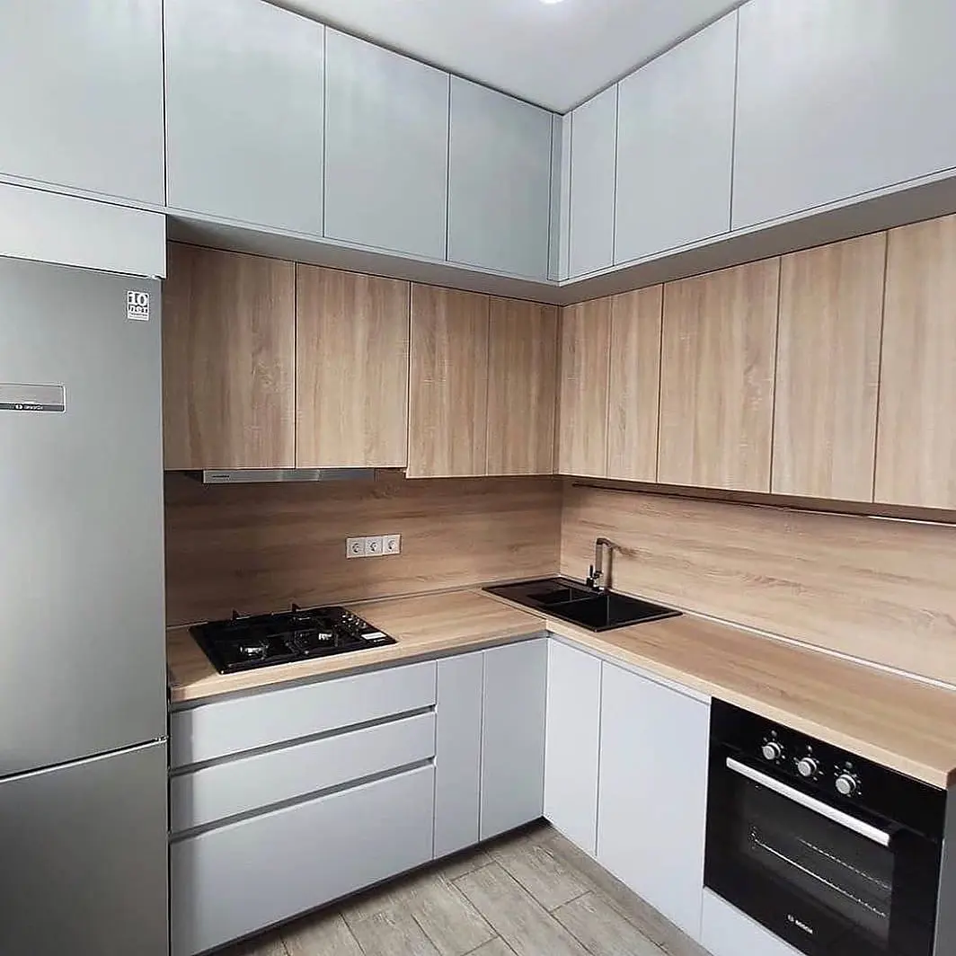 Кухня Nordic Light сочетает в себе функциональность и теплую атмосферу скандинавского стиля. Верхние светло-серые фасады придают интерьеру свежесть и лёгкость, а нижний ряд с отделкой под натуральный дуб создаёт уют и гармонию. Угловая планировка делает кухню максимально эргономичной, предоставляя удобные зоны для готовки и хранения. Скрытая фурнитура Boyard обеспечивает плавное и бесшумное открывание, а столешница в цвет фасадов объединяет дизайн в единую композицию.