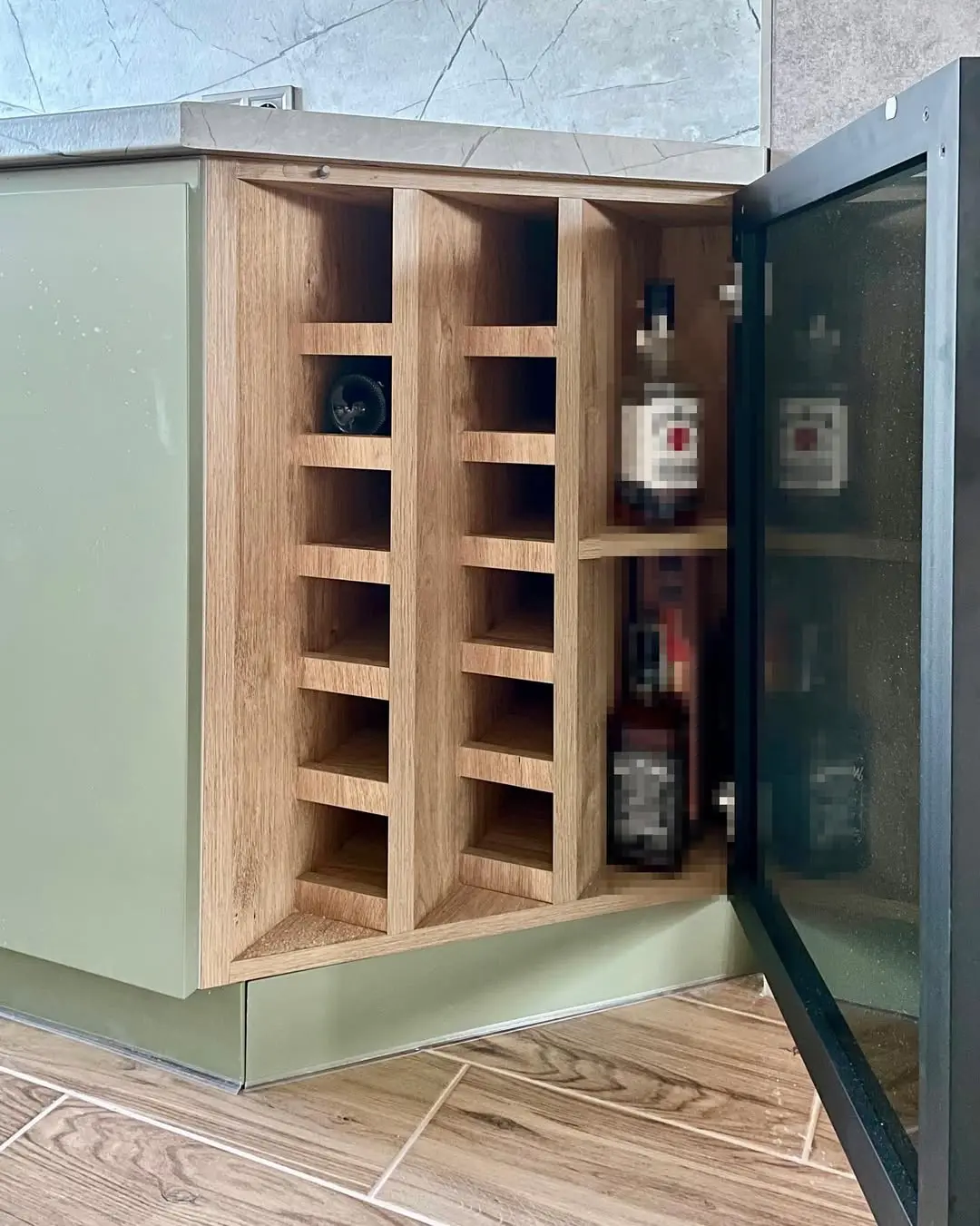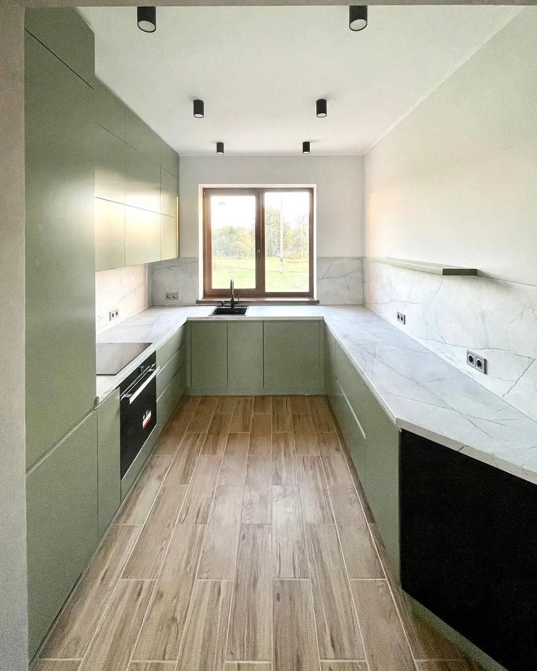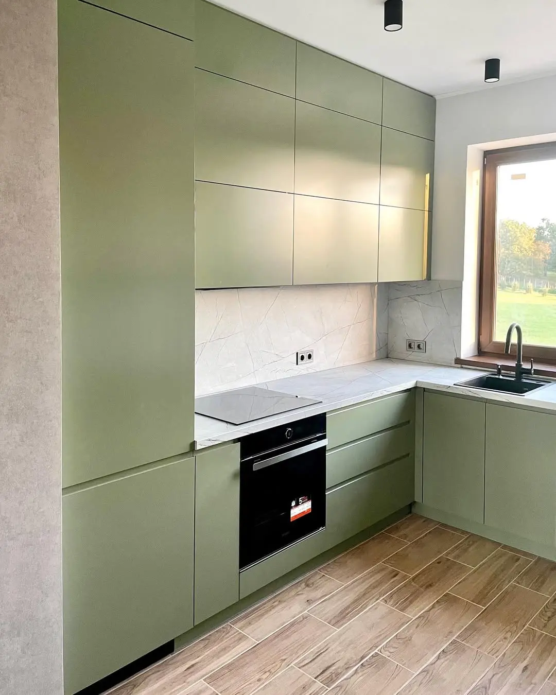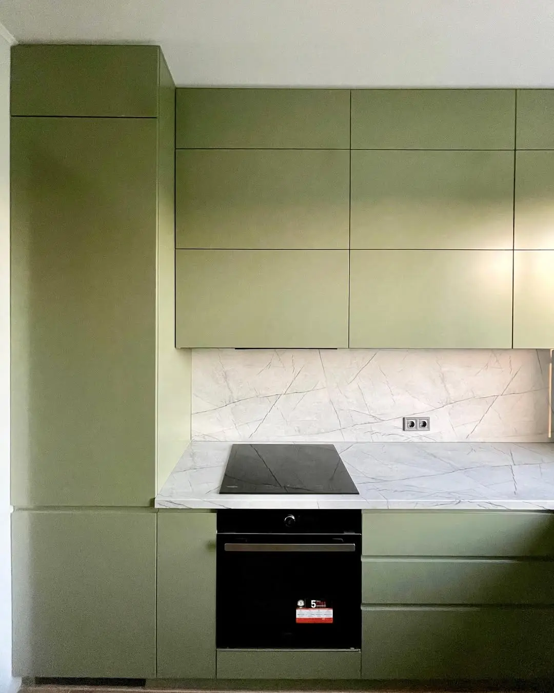 П-образная кухня в элегантном оливковом оттенке с фасадами из МДФ в матовой покраске. Светлая кварцевая столешница под мрамор и высокие глухие шкафы создают простор и легкость. Продуманное зонирование обеспечивает удобство готовки и хранения, а стильный минимализм делает кухню современной и уютной.